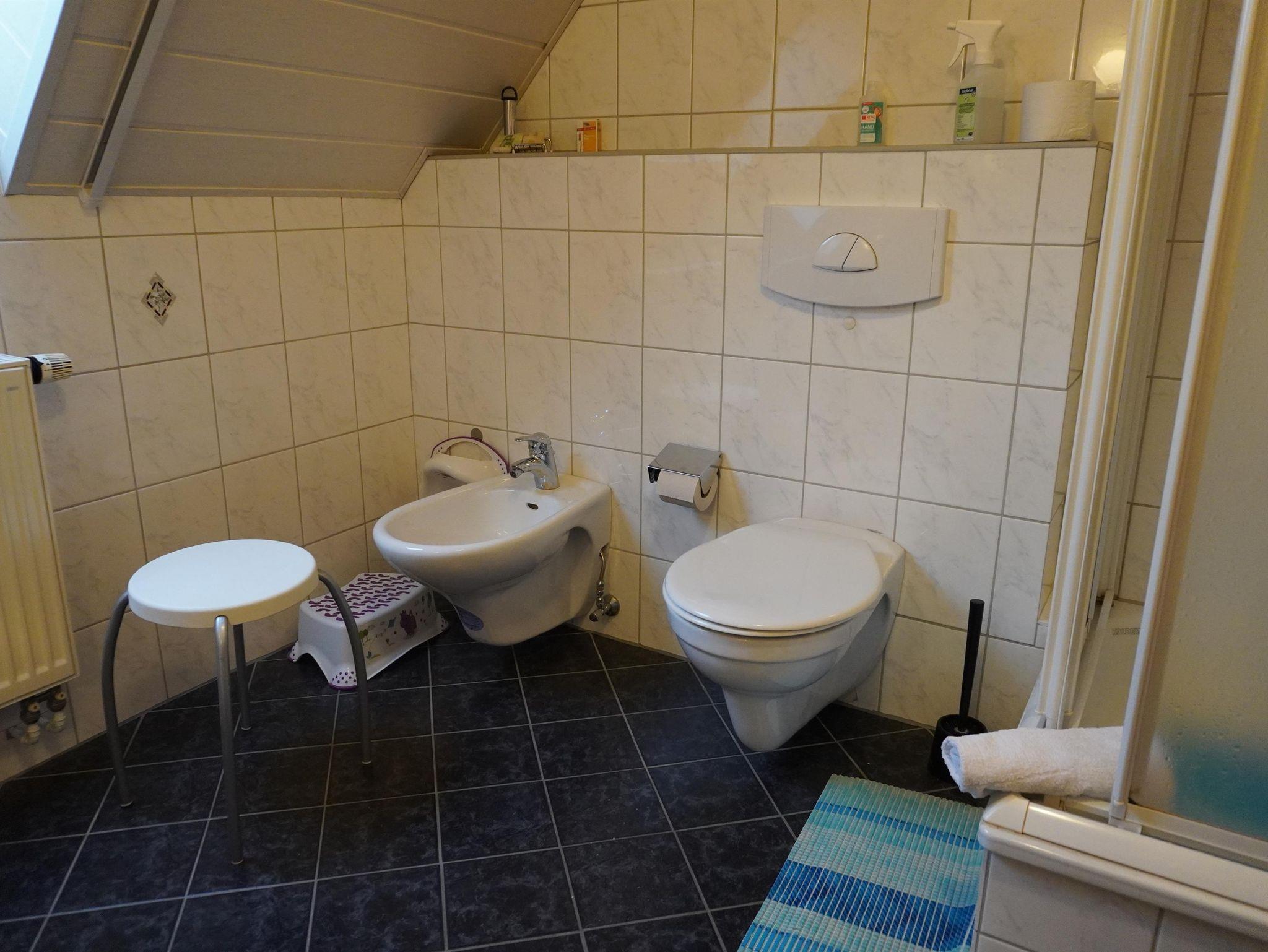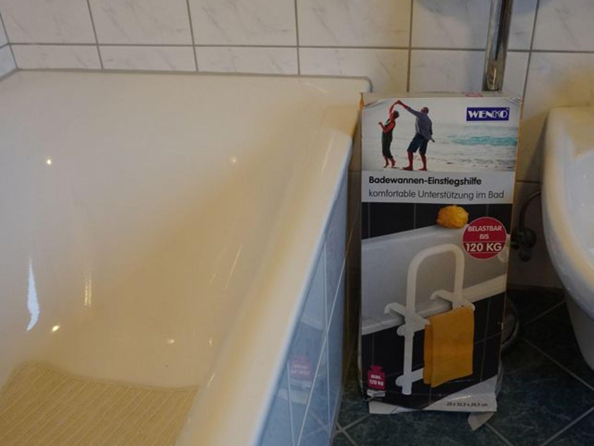 Auch zwei Ihrer Schlafdomizile finden Sie im Erdgeschoss. Eins davon mit einem französischem Doppelbett (1,40 x 2,00m), das andere mit zwei Einzelbetten (ein Boxspringbett und ein elektrisch verstellbares Bett). Im Badezimmer bietet eine Dusche, Badewanne, Bidet sowie WC. Gerne stellen wir für die Badewanne auch eine Einsteighilfe zur Verfügung.