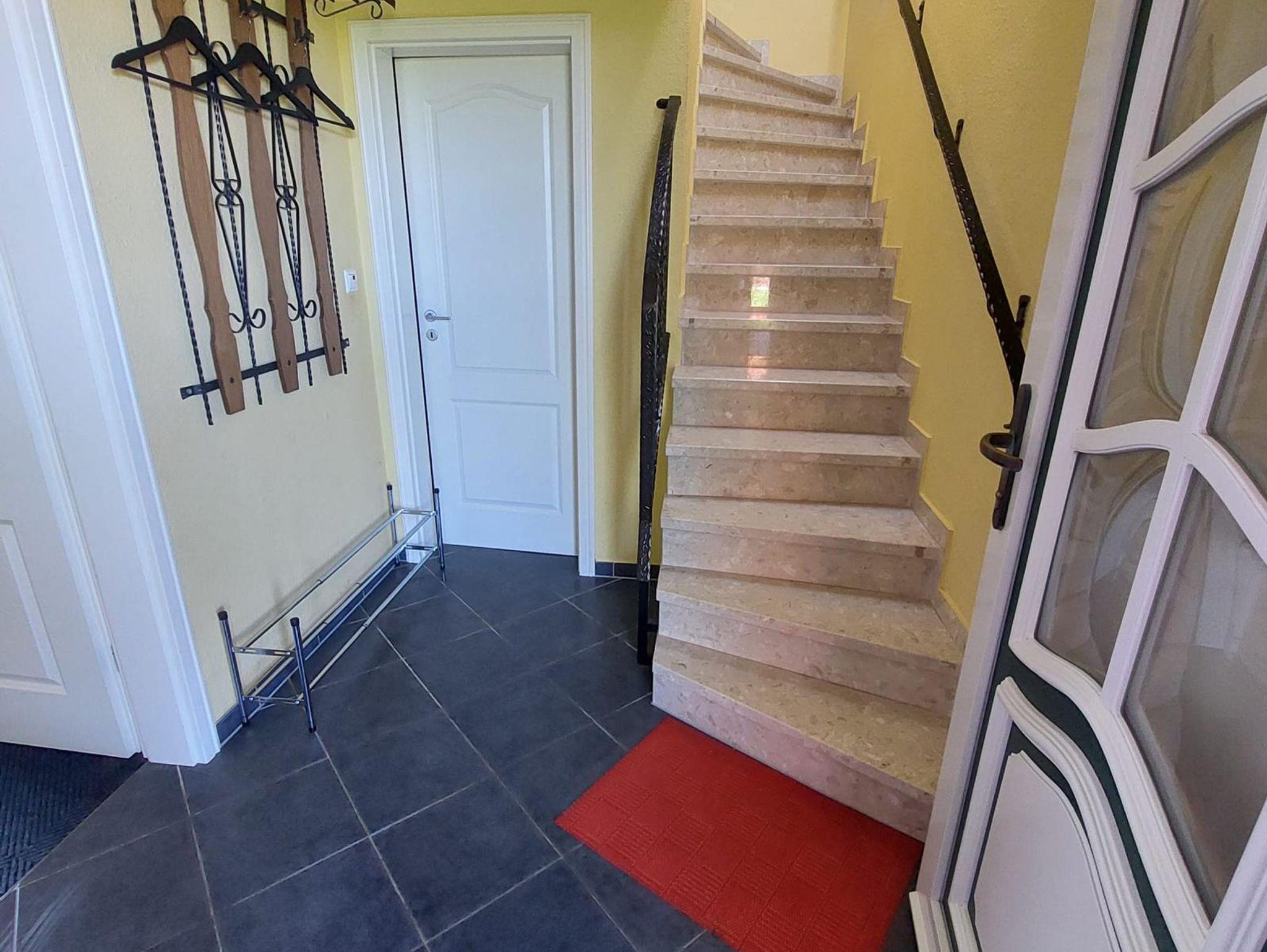 Die Ferienwohnung Vorne (ca. 80 m²) erstreckt sich über das Erd- und Obergeschoß unseres Ferienhauses. Vom gemütlichen Wohn-/Essbereich mit integrierter Küchenzeile gelangen Sie auf die Terrasse mit Gartenmöbeln. Die Schlafzimmer teilen sich in zwei mit jeweils einem Doppel- und das Weitere mit einem Einzelbett auf.