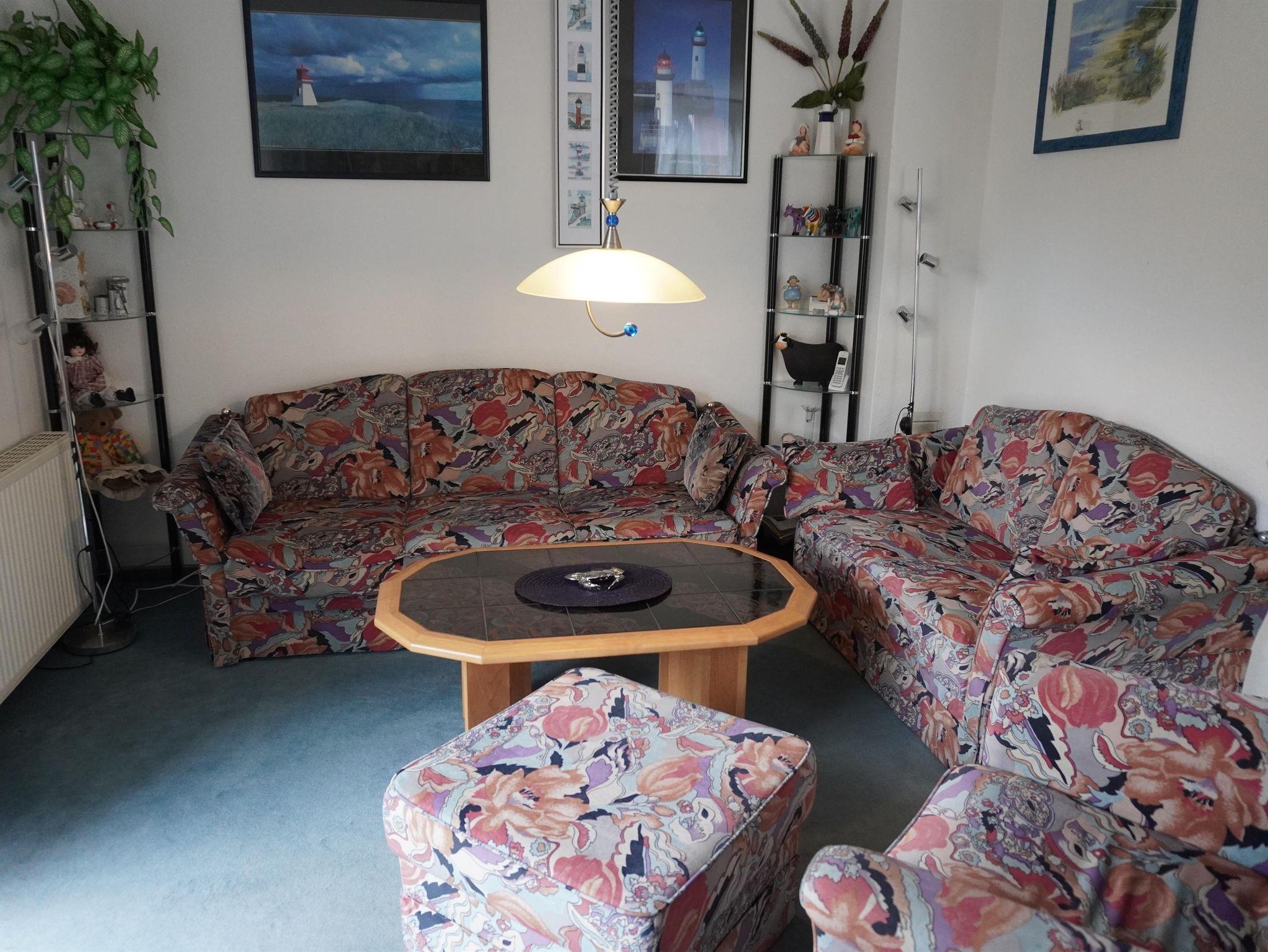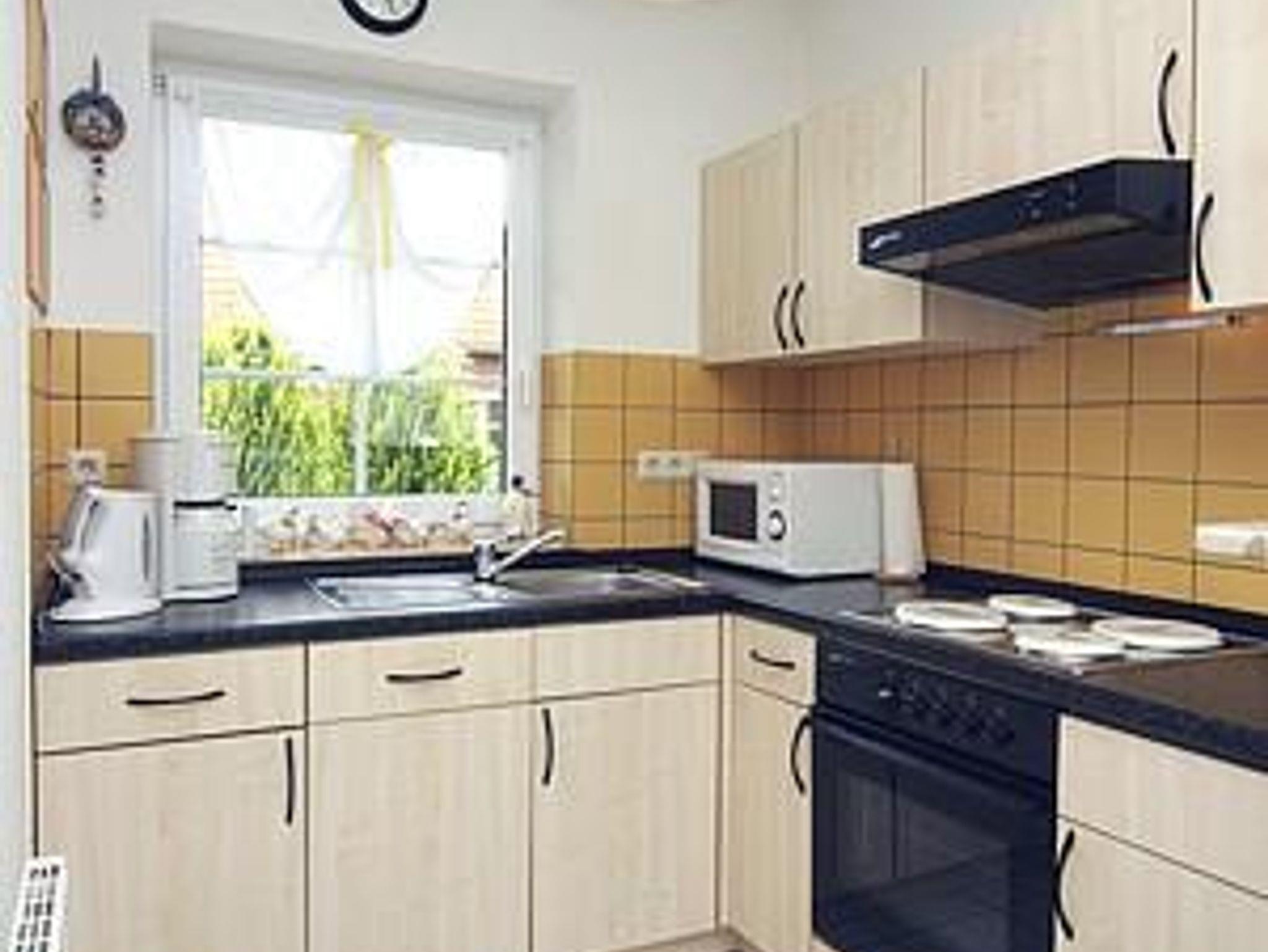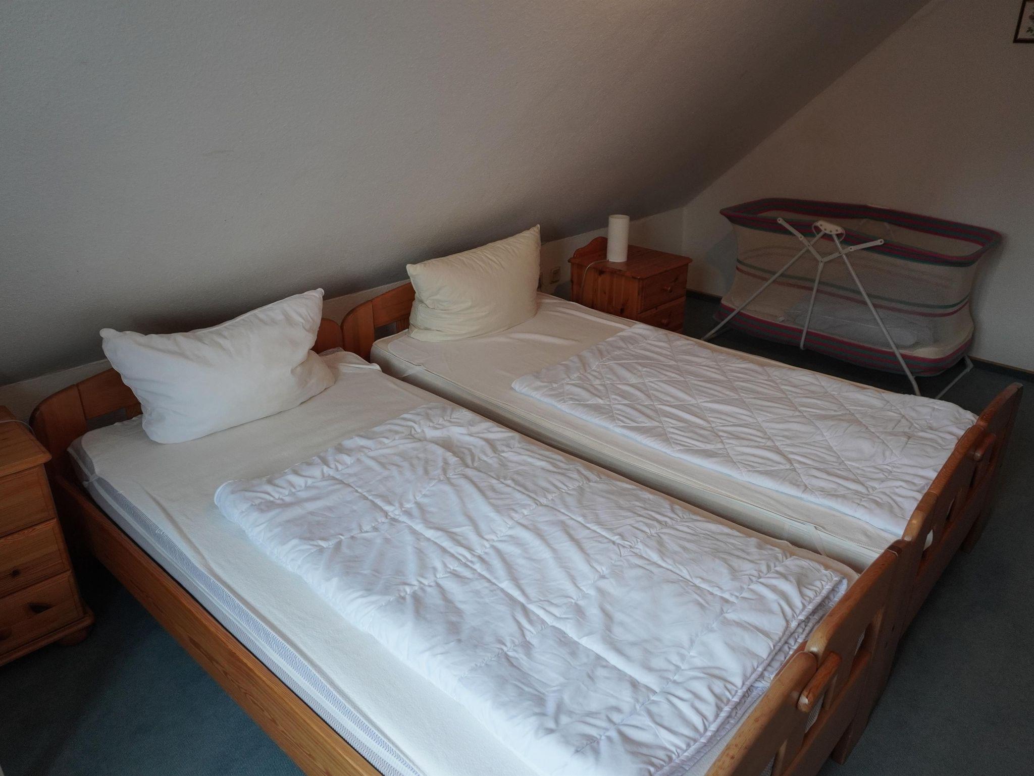 Zur modernen Doppelhaushälfte gehört ein großzügig geschnittener Wohnbereich mit Sat-TV, gemütlicher Couch und Essecke. Die offene Küche mit kleinem Tresen ist mit diversen elektronischen Geräten ausgestattet. Ein Gäste-WC und ein Abstellraum runden die Erdgeschossebene des Ferienhauses ab. Im Obergeschoss befinden sich zwei Schlafzimmer (Zweibettzimmer) und das geräumige Bad mit Dusche und WC. Für den kleinen Gast steht Ihnen neben dem Babybett (bis 2 Jahre) auch ein Kinderhochstuhl zur Verfügung.
