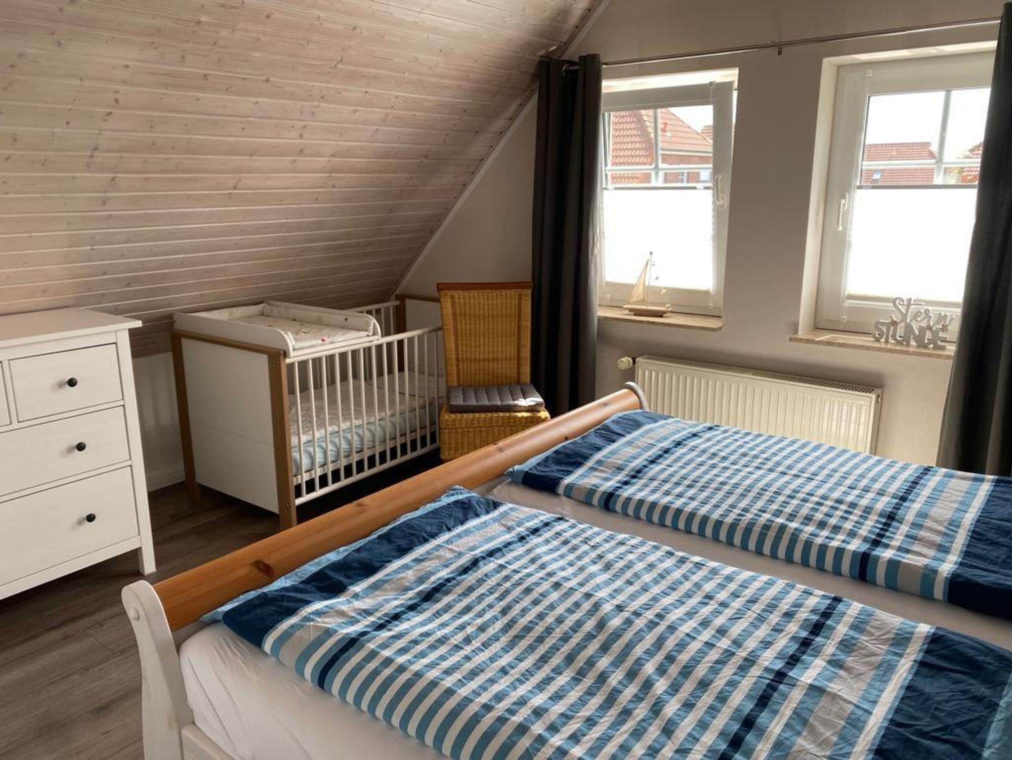 Ein Babygitterbett, eine Wickelauflage und ein zusätzliches Babyreisebett sind ebenfalls vorhanden.1 Tageslicht Bad mit Dusche und WC
