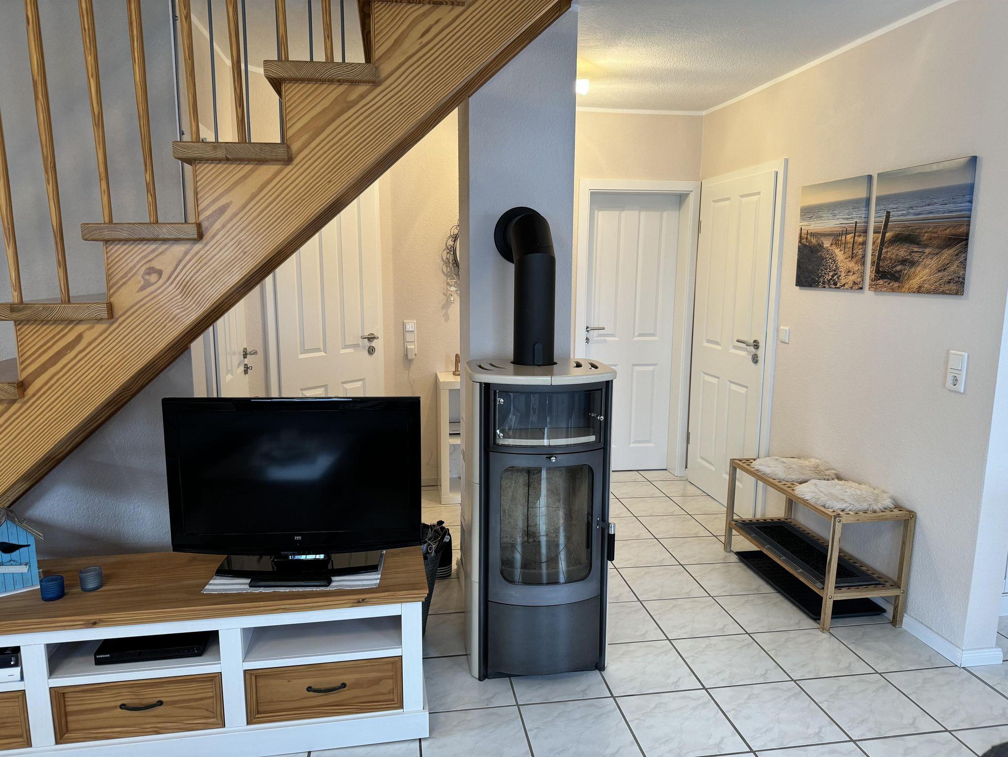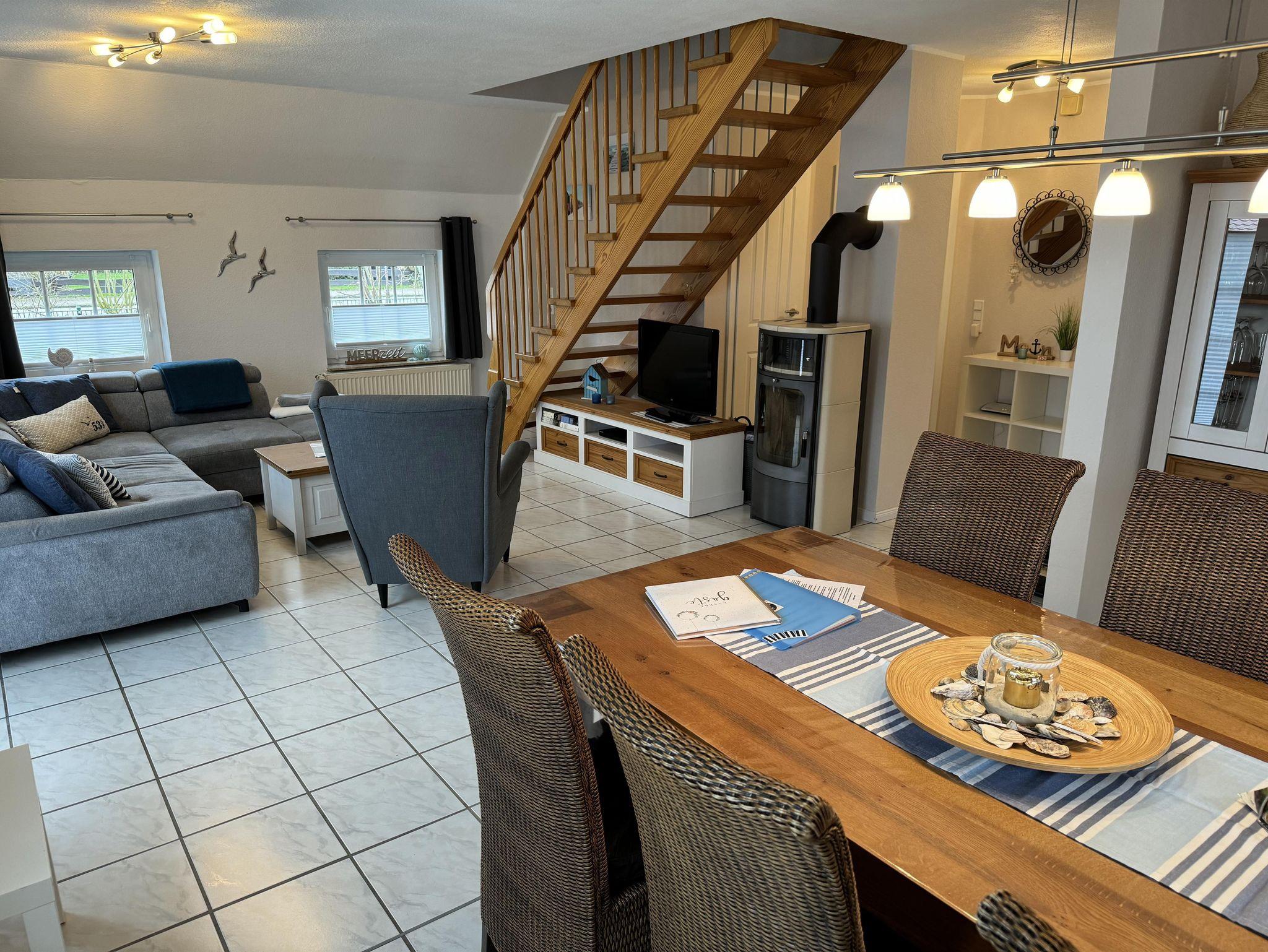 Großzügig geschnittener, offener und heller Wohn- und Essbereich mit Kaminofen, sowie einer ausziehbaren Wohnlandschaft, inkl. einem großen Esstisch für 6-8 Personen. Außerdem finden Sie verschiedene Gesellschaftsspiele, DVD's und Bücher.