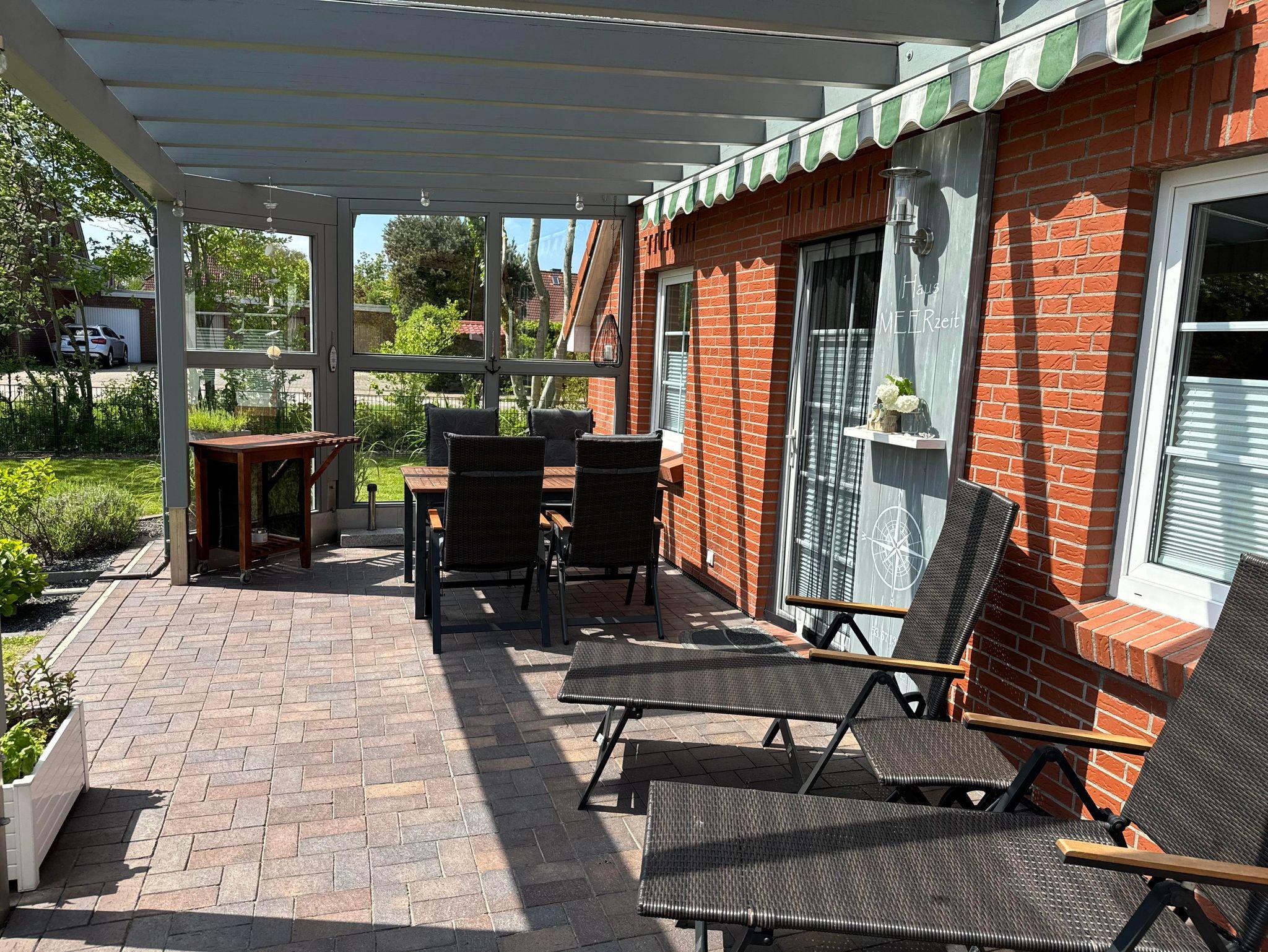 Ihr privater Außenbereich umfasst einen eingezäunten Garten mit Liegewiese und Sandkasten, eine überdachte Terrasse mit Markise und Windfang, Tisch und Gartenstühle, sowie 2 Sonnenliegen, Sonnenschirm und einen Grill.