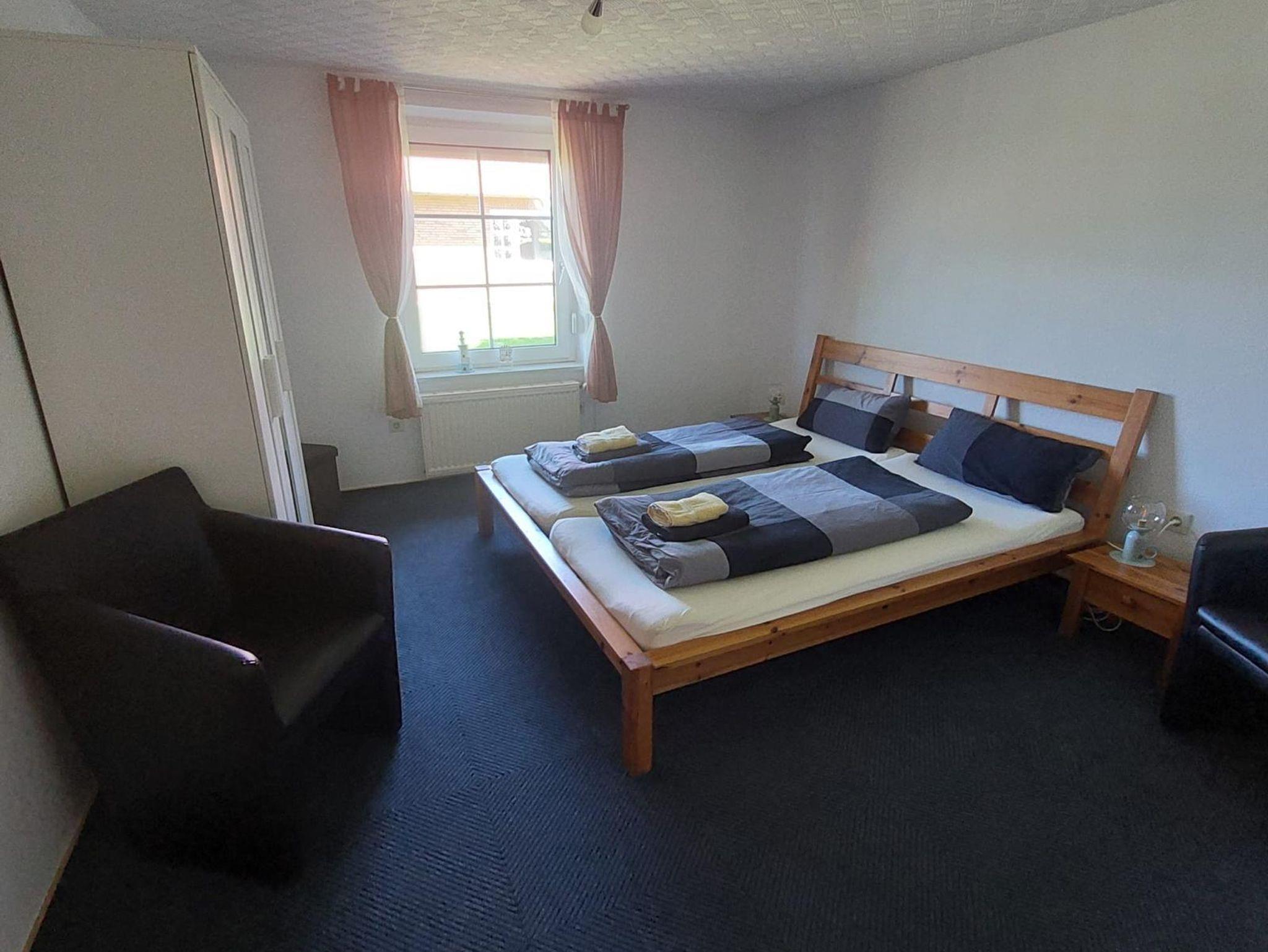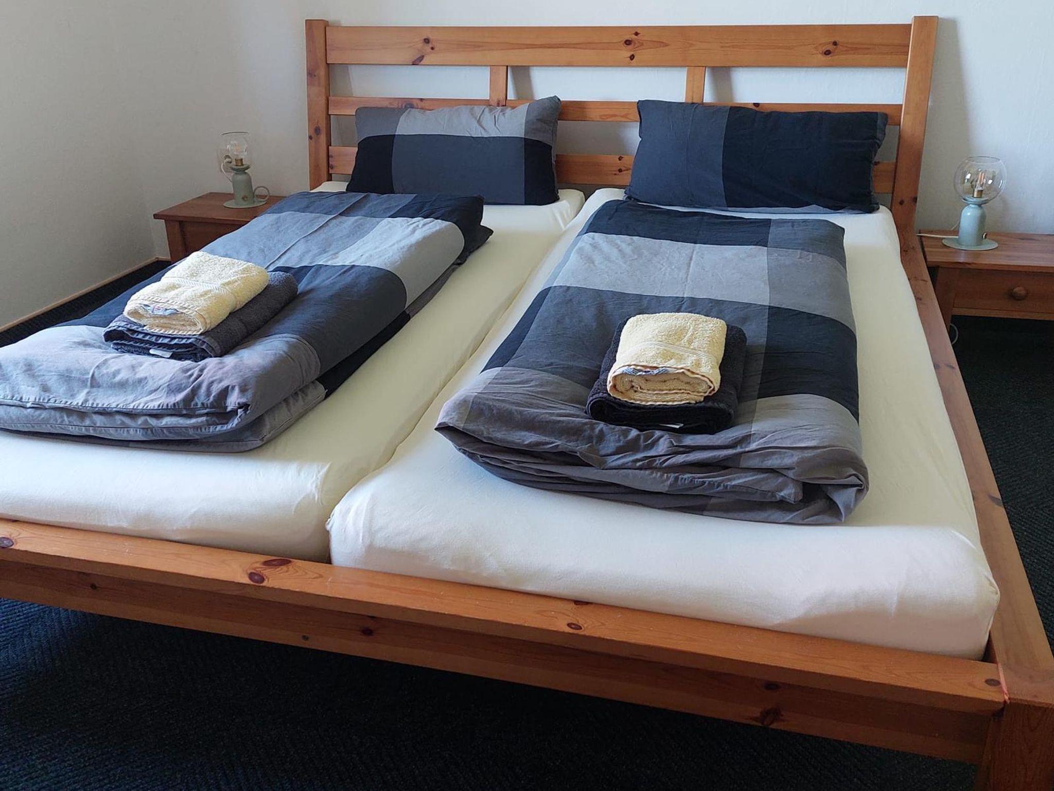 Auf einer Wohnfläche von ca. 55 m² werden Sie in unserer Ferienwohnung im Obergeschoss einen kombinierten Wohn-/Essbereich mit Sat-TV, eine integrierte Küchenzeile mit Vierplattenherd und Backofen, Kühlschrank mit Gefrierkombination sowie eine Mikrowelle und div. elektrischen Geräte vorfinden. Zwei Schlafräume sind mit jeweils einem Doppelbett ausgestattet und Ihre Betten sind bereits bei Anreise bezogen. Das Bad verfügt über Dusche/WC.