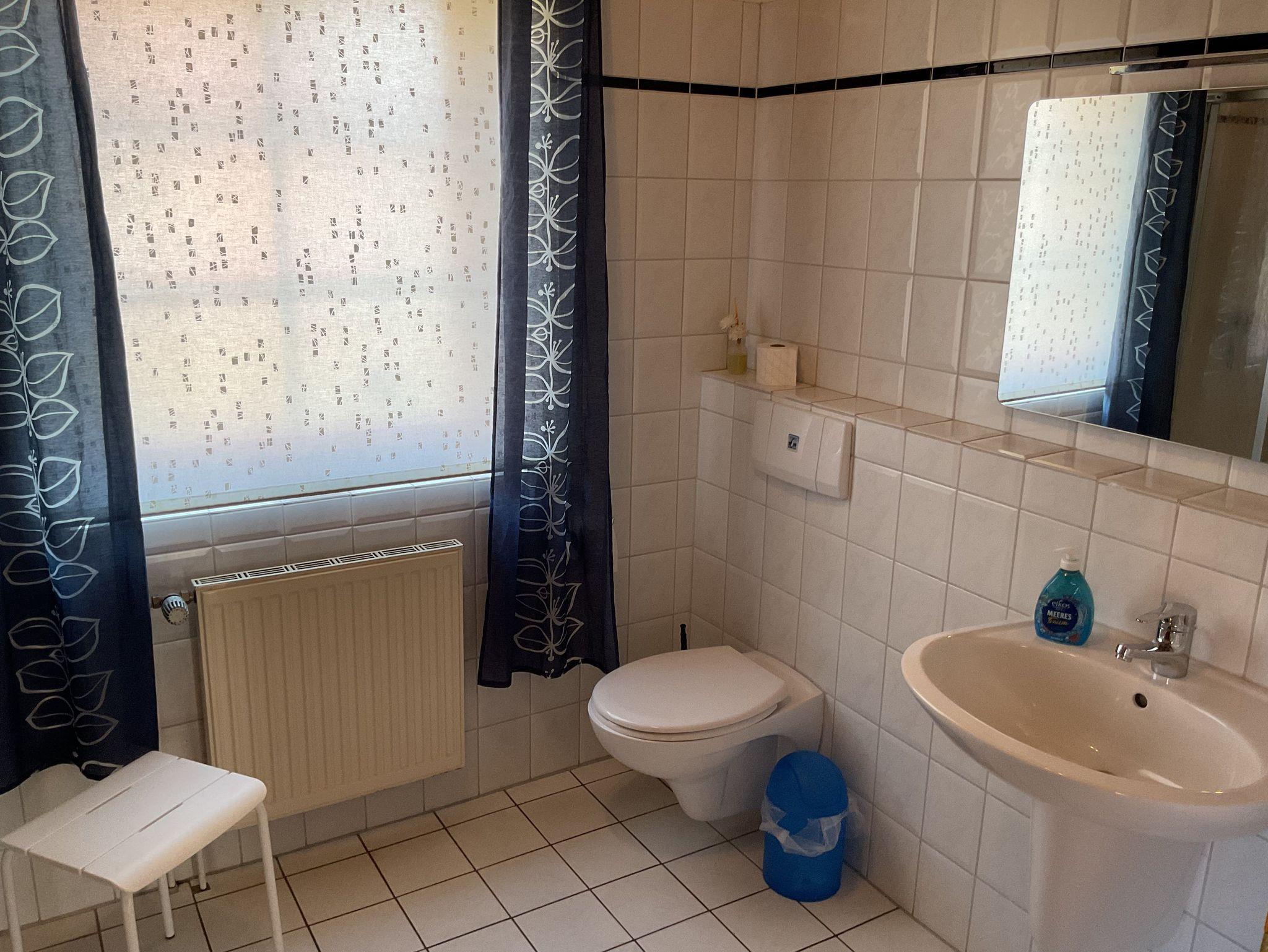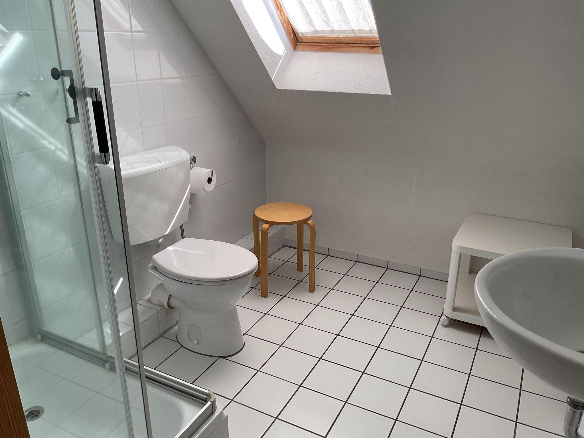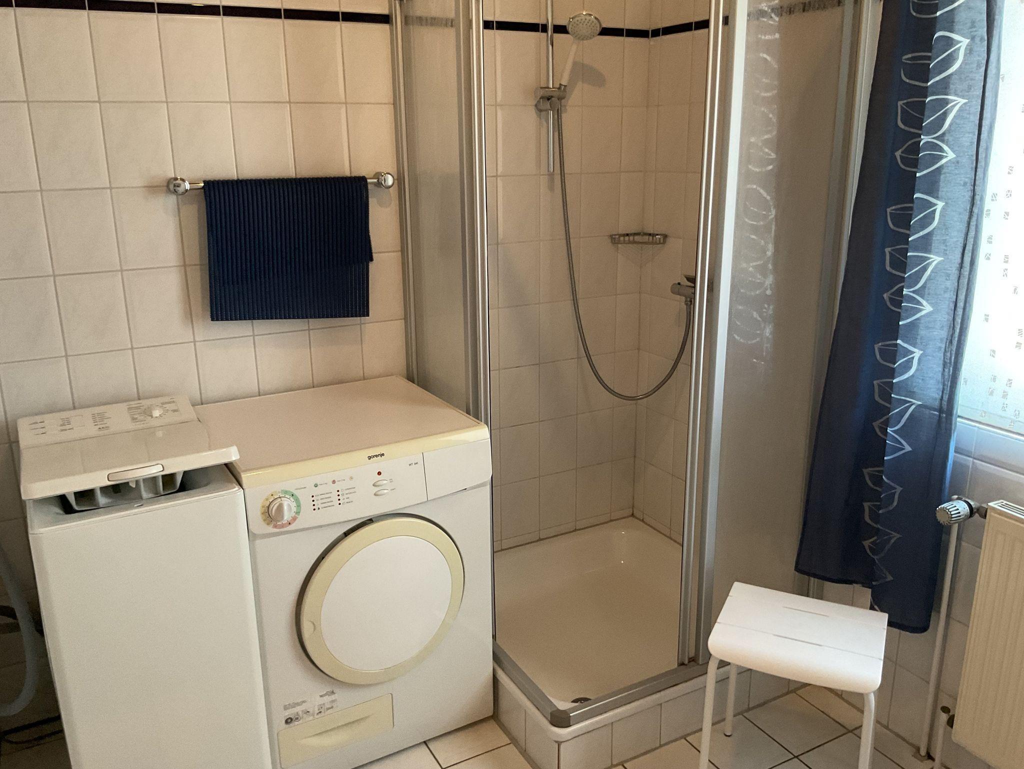 Tageslicht-Badezimmer mit Dusche, WC und Waschmaschine.
