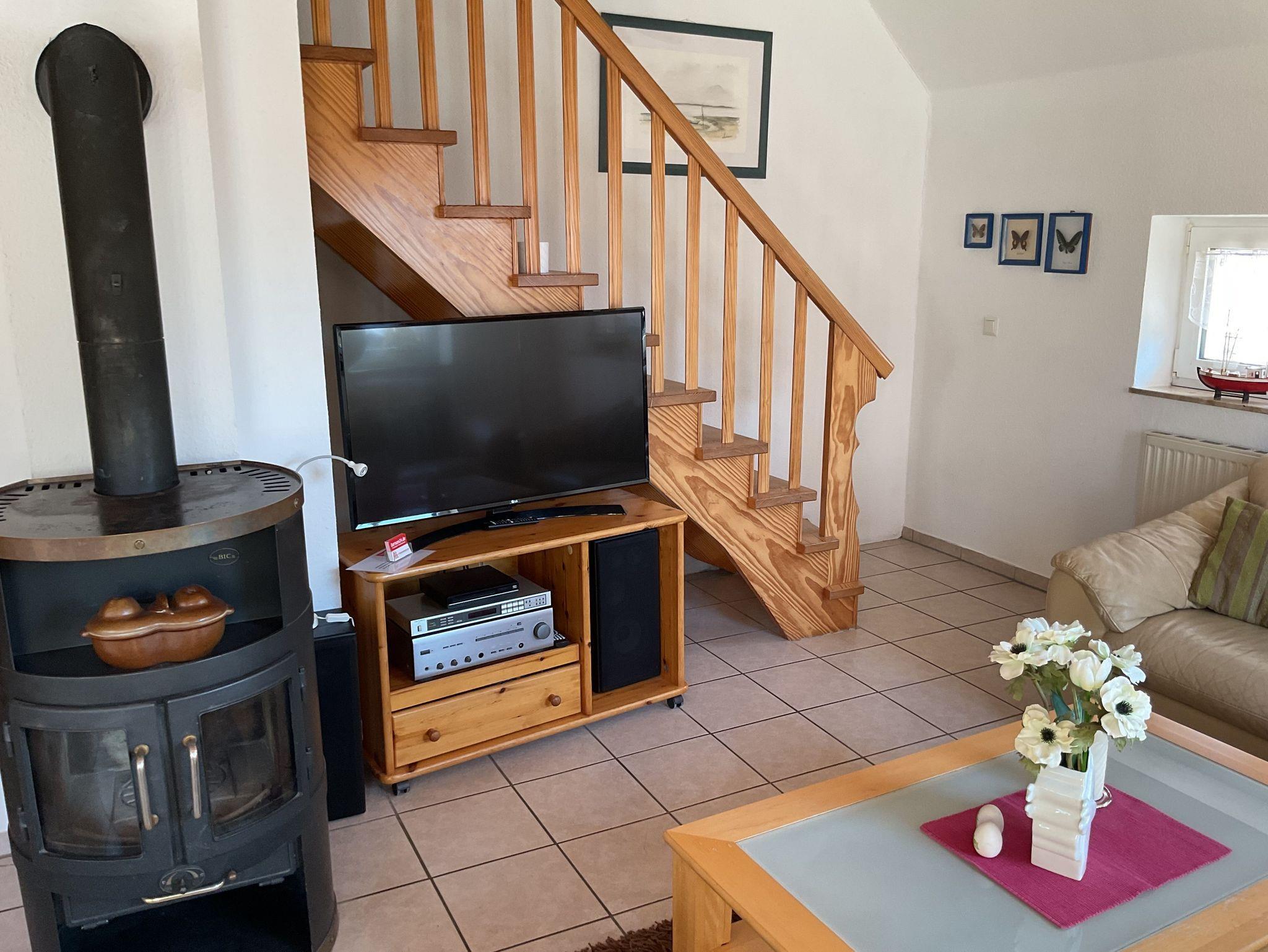 Offener Wohn- und Essbereich mit Kaminofen, gemütlicher Couchgarnitur und grossem Flachbild-TV, Essgruppe mit Bestuhlung. Küche mit Spülmaschine, Kühlschrank mit Gefrierfach, VierPlattenElektroherd mit Ceranfeld und Backofen und allen erforderlichen Elektrogeräten.