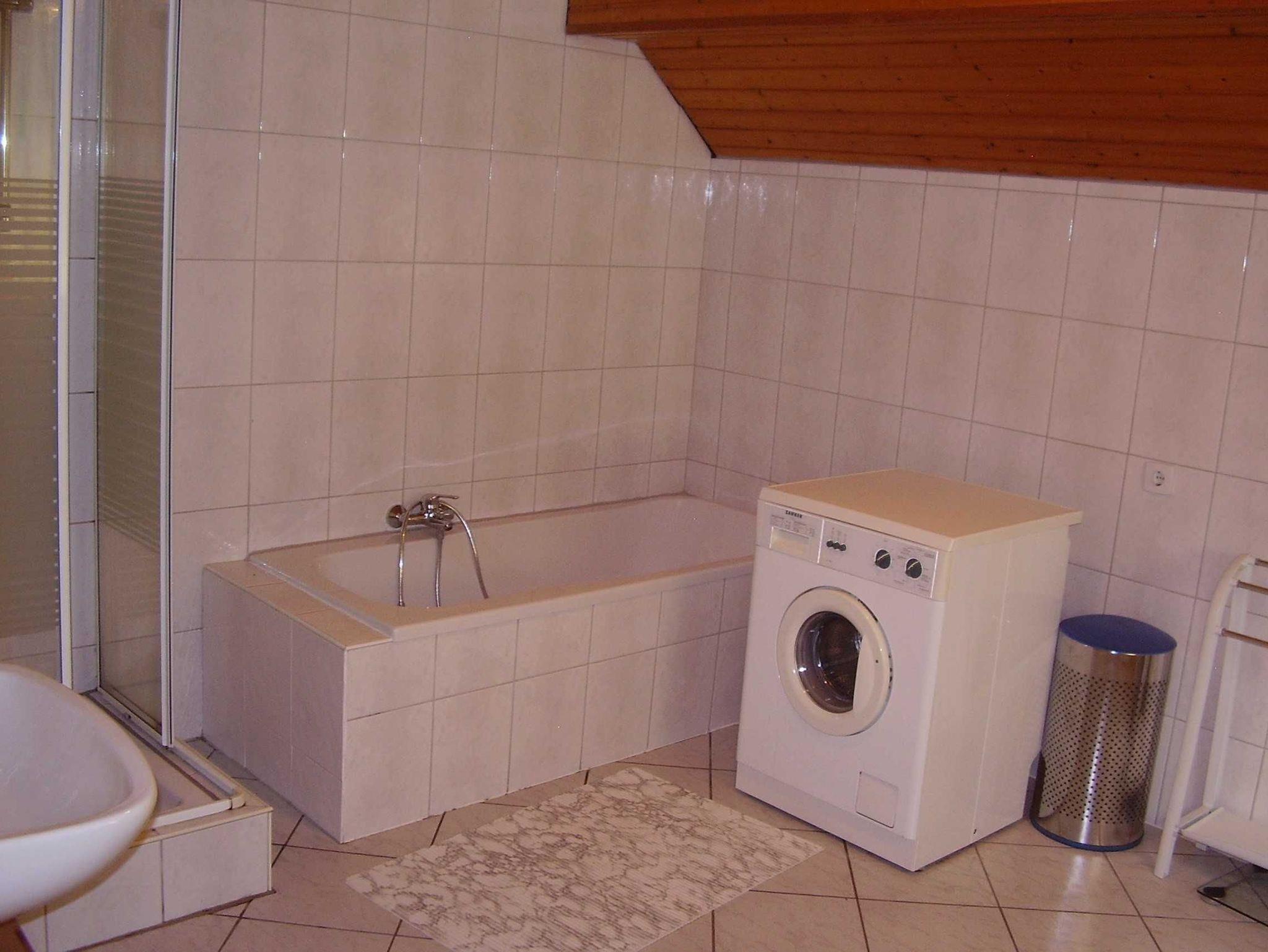 Tageslicht Badezimmer mit Badewanne, Dusche, WC und Waschmaschine.