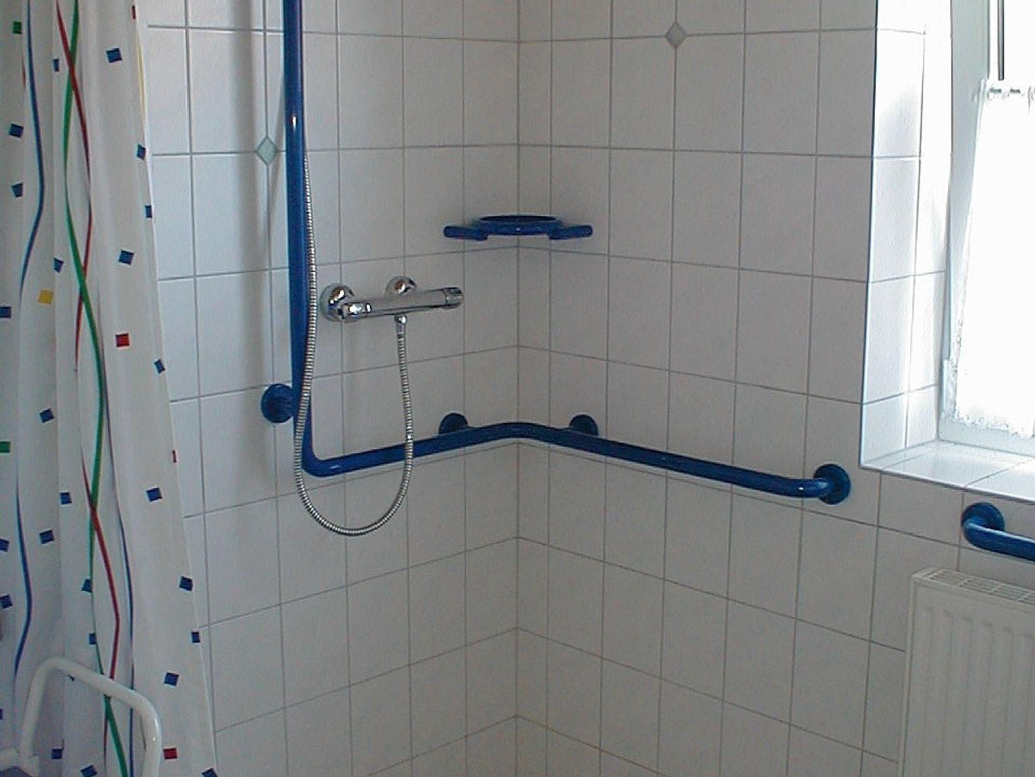 Tageslicht-Badezimmer mit ebenerdiger behindertengerechter Dusche und WC; Waschmaschine.