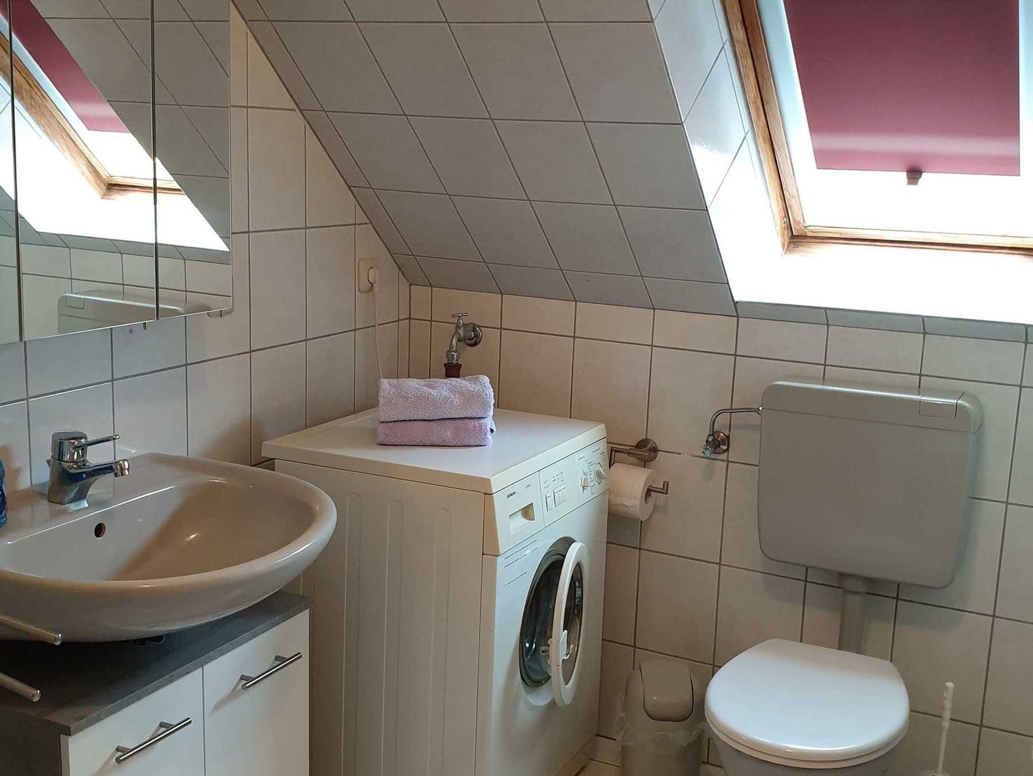 Tageslicht-Bad (Dachflächenfenster) mit Dusche, WC und Waschmaschine.