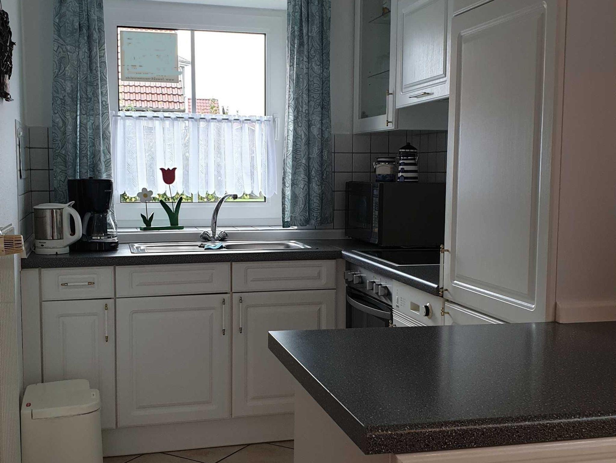 Moderne Einbauküche, die neben allen erforderlichen Elektrogeräten über einen Kühlschrank, Spülmaschine, 4-Plattenherd mit Ceranfeld und Backofen, Mikrowelle etc. und ausreichend Geschirr, Besteck, Töpfe und Pfannen verfügt.