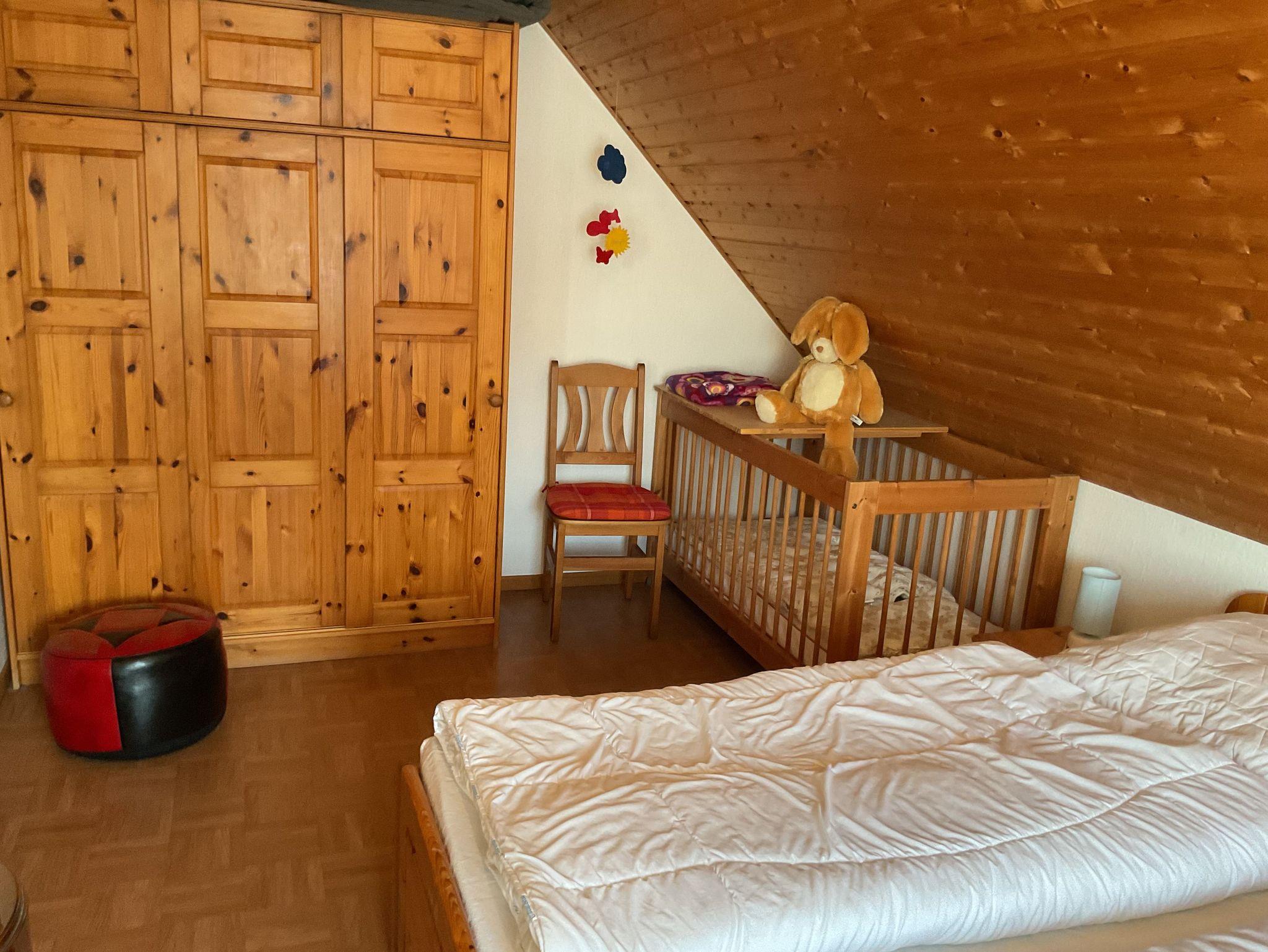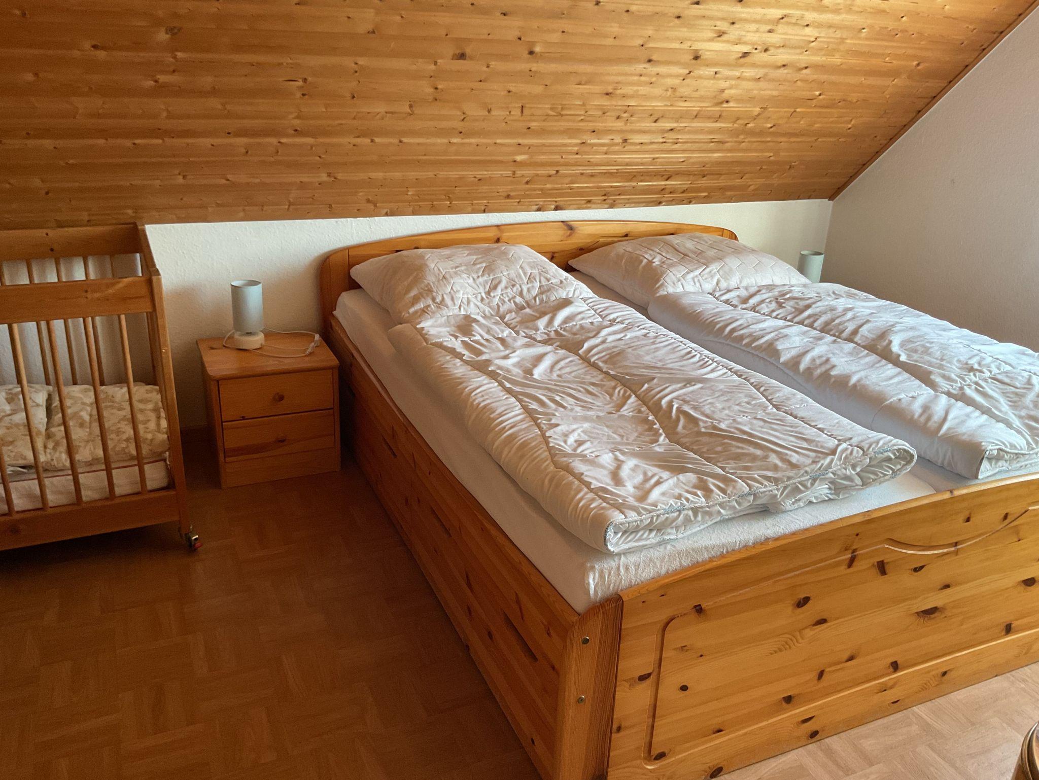 Ein Schlafzimmer mit Doppelbett und festem Kleinkindergitterbett.