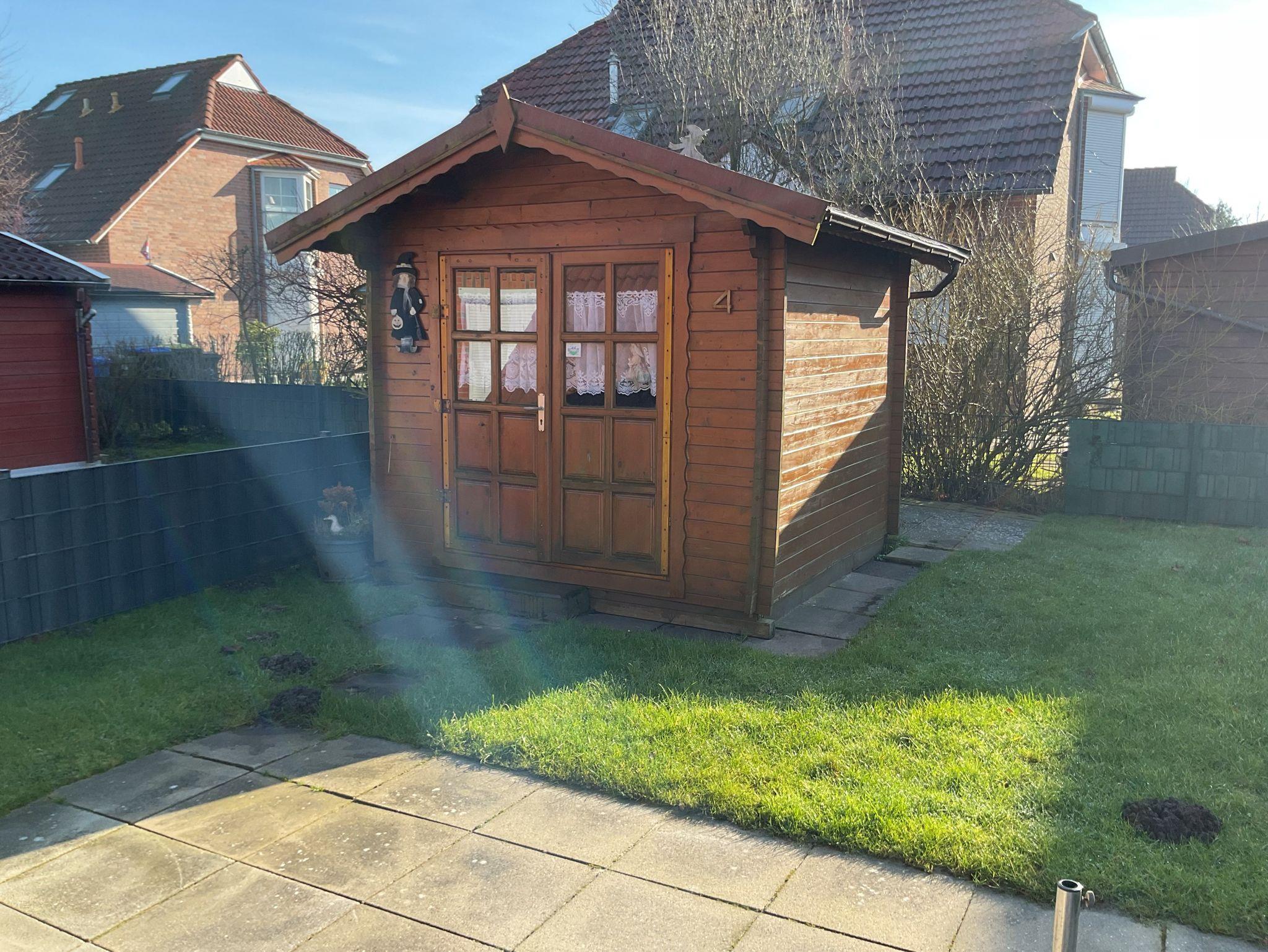Von hieraus Zugang zu Terrasse mit Gartenmöbel und komplett eingezäunten Garten mit abschließbarem Gartenaus.