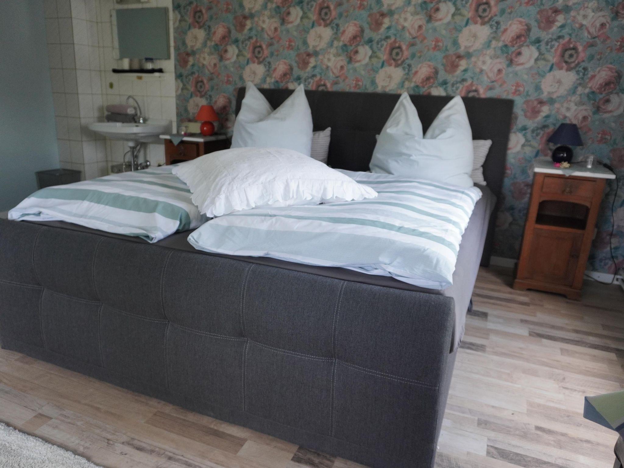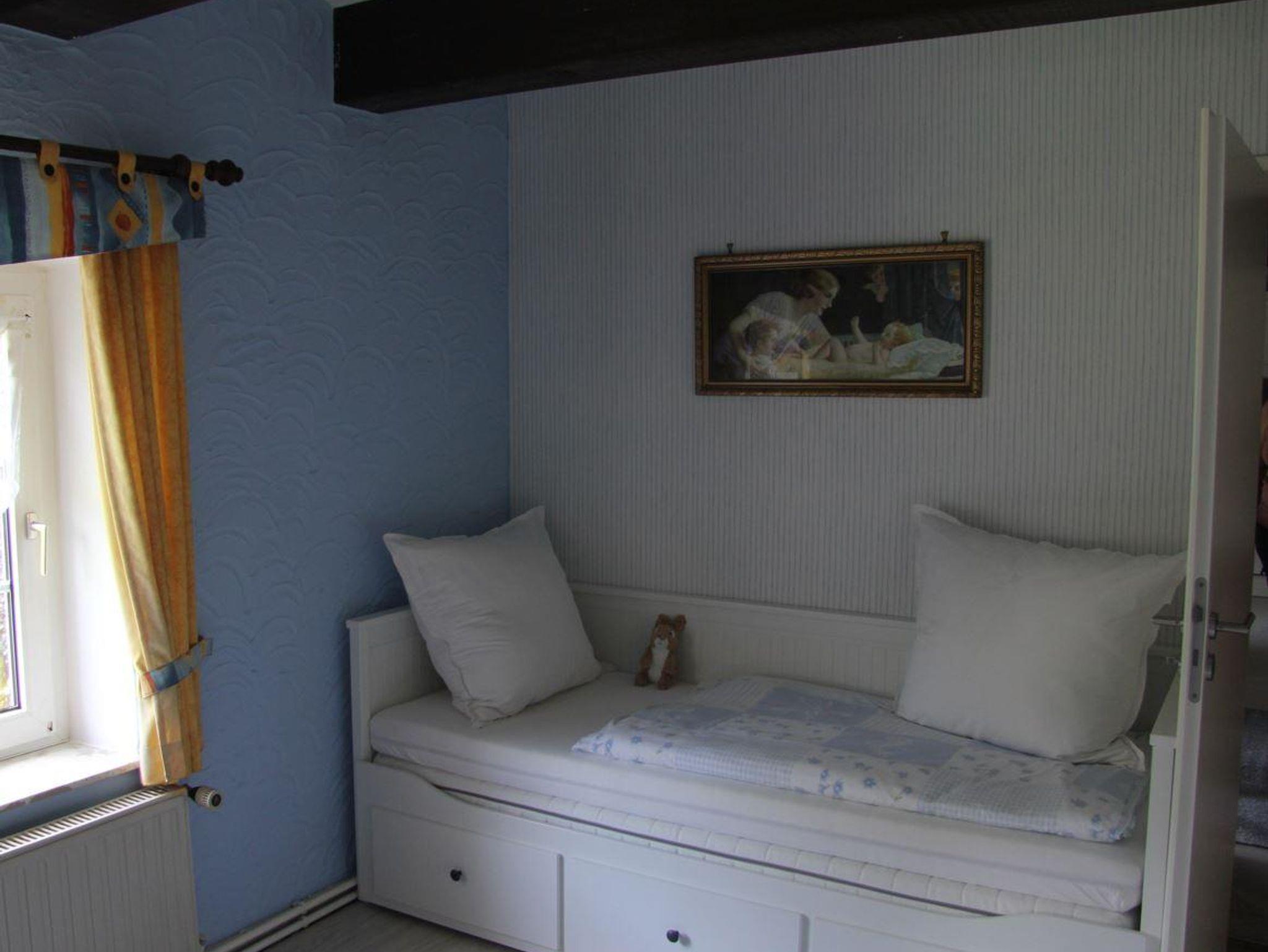 Über eine Treppe führt der Weg in das zweite Feriendomizil, welches sich auch im 1. OG der Burgstätte befindet. Die Wohn-Küche ist großzügig gestaltet und verfügt über eine geräumige Küchenzeile mit Essecke. Ebenfalls finden Sie dort ein gemütliches Sofa, einen Fernseher, sowie Spiele und Bücher. Von dort aus kommen Sie in das erste Schlafzimmer. Dies ist mit einem Tandembett (90/180 x 200cm) ausgestattet. Von da aus gelangen Sie in das zweite Schlafzimmer, wo ein Boxspringbett auf Sie wartet. Hier haben Sie eine erholsame Nacht, damit Sie gut erholt in den neuen Tag starten können. Das Badezimmer ist mit WC und Dusche ausgestattet.