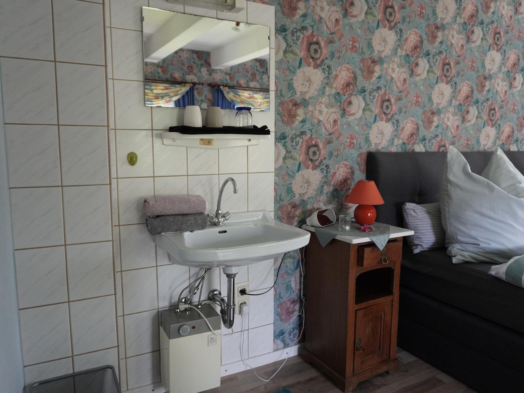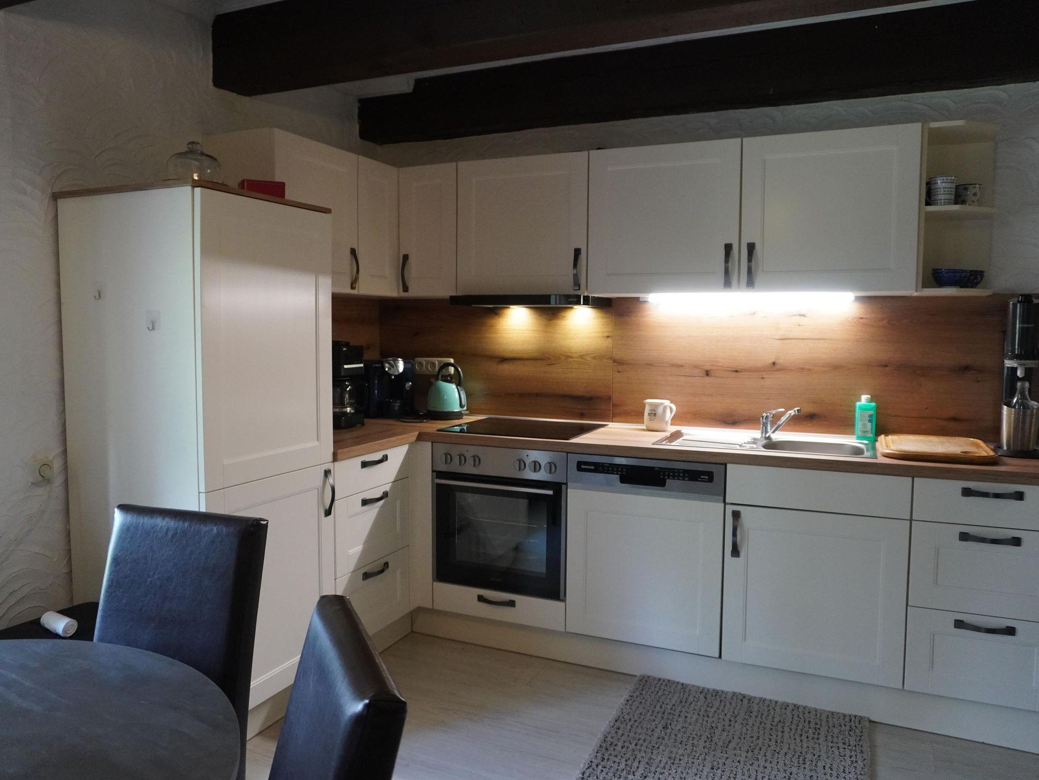 Eine Treppe führt in das erste Feriendomizil im 1. OG der Burgstätte. Dort finden Sie zunächst die beiden Doppelzimmer. Im Wohnzimmer finden Sie neben einem Fernseher auch Spiele und Bücher zum gemütlichen spielen und entspanntem lesen. Die Küche ist großzügig gestaltet und verfügt über eine Küchenzeile mit Essecke. Hier macht das Kochen und Essen Freude. Das Badezimmer ist mit Badewanne, Dusche und WC ausgestattet.