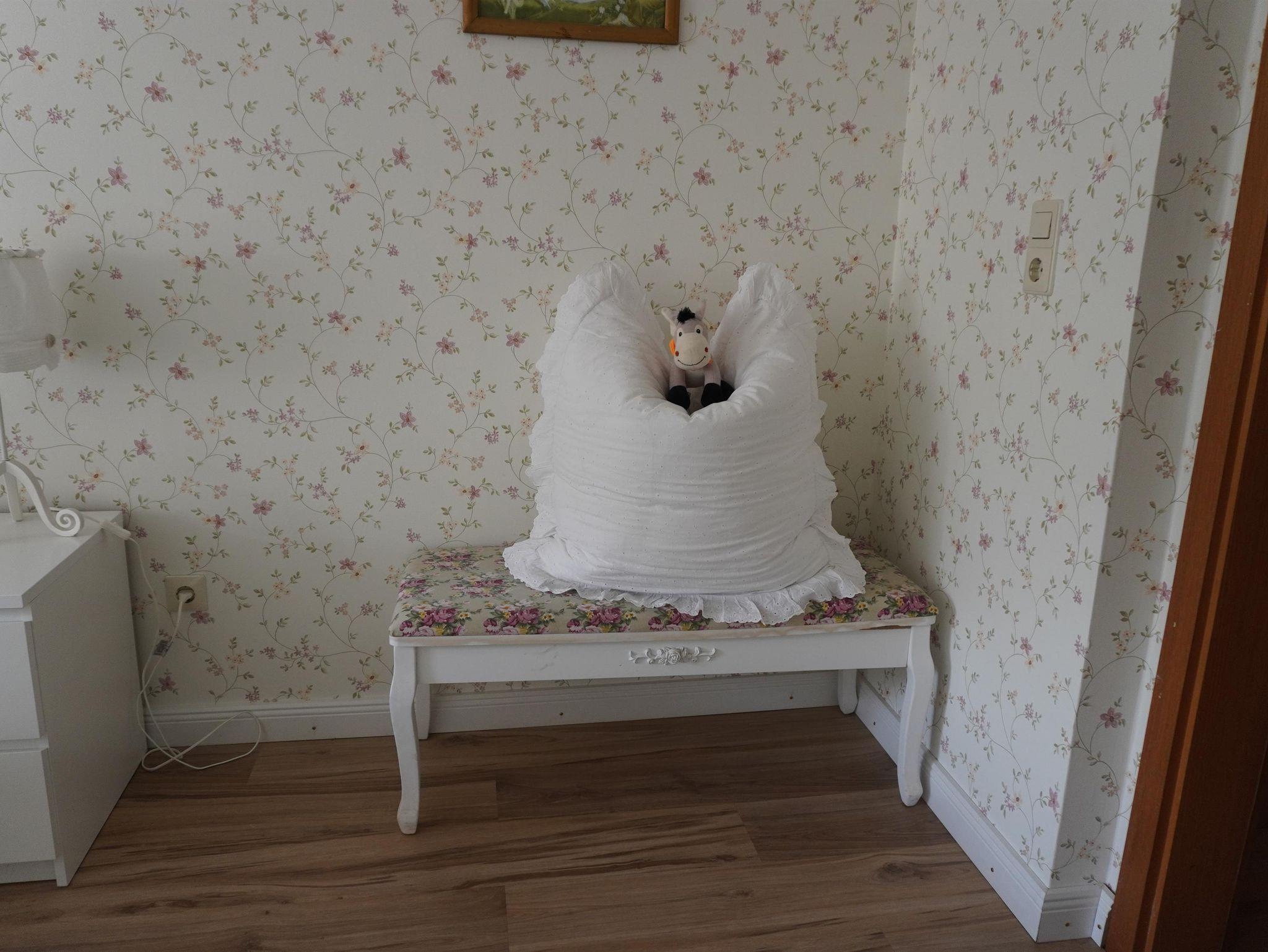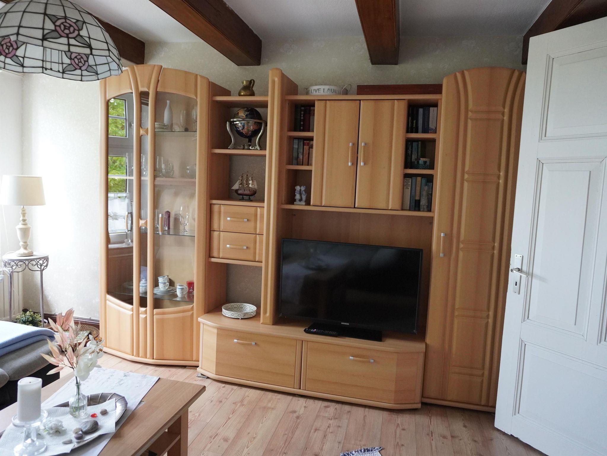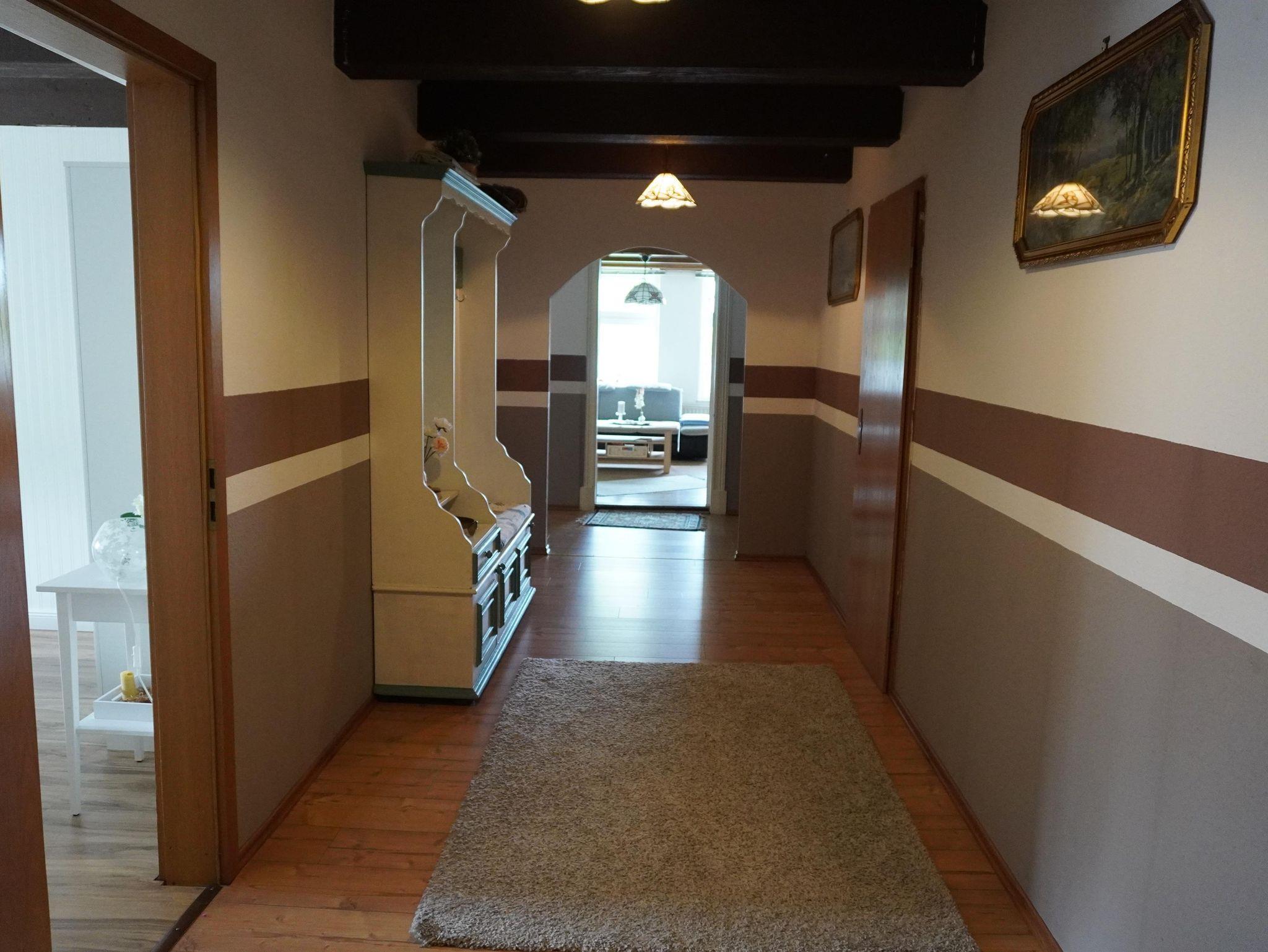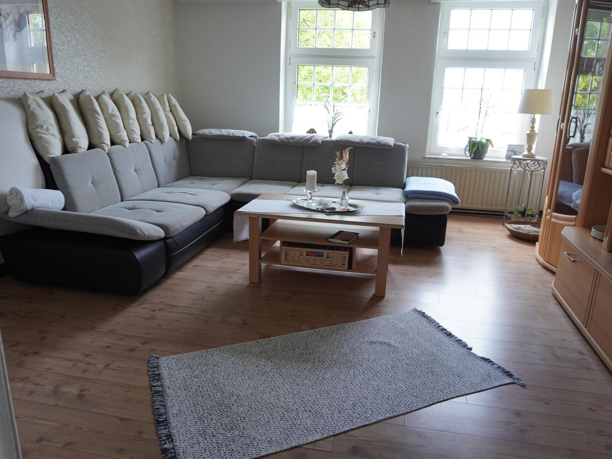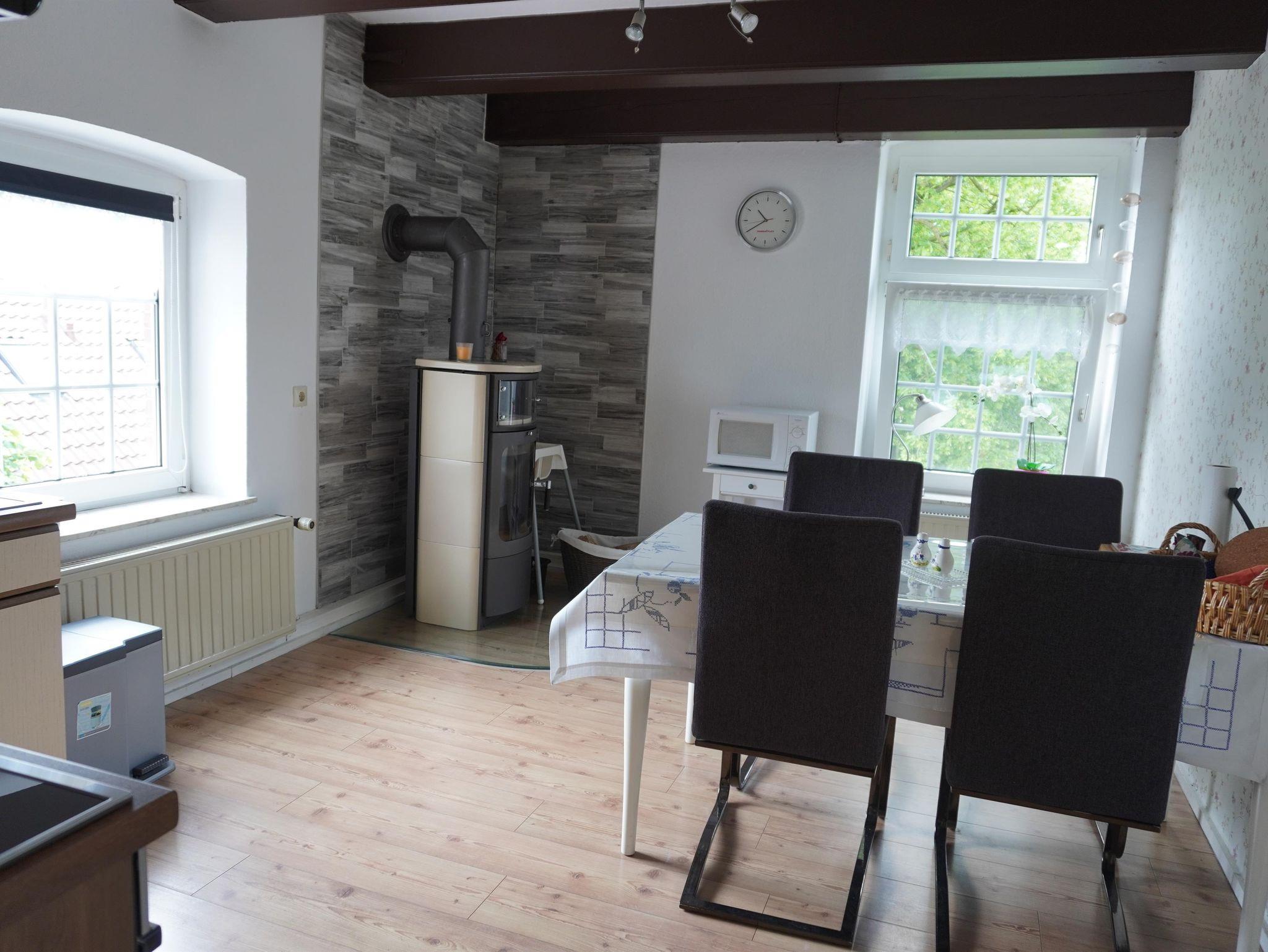 Eine Treppe führt in das erste Feriendomizil im 1. OG der Burgstätte. Dort finden Sie zunächst die beiden Doppelzimmer. Im Wohnzimmer finden Sie neben einem Fernseher auch Spiele und Bücher zum gemütlichen spielen und entspanntem lesen. Die Küche ist großzügig gestaltet und verfügt über eine Küchenzeile mit Essecke. Hier macht das Kochen und Essen freude. Das Badezimmer ist mit Badewanne, Dusche und WC ausgestattet.