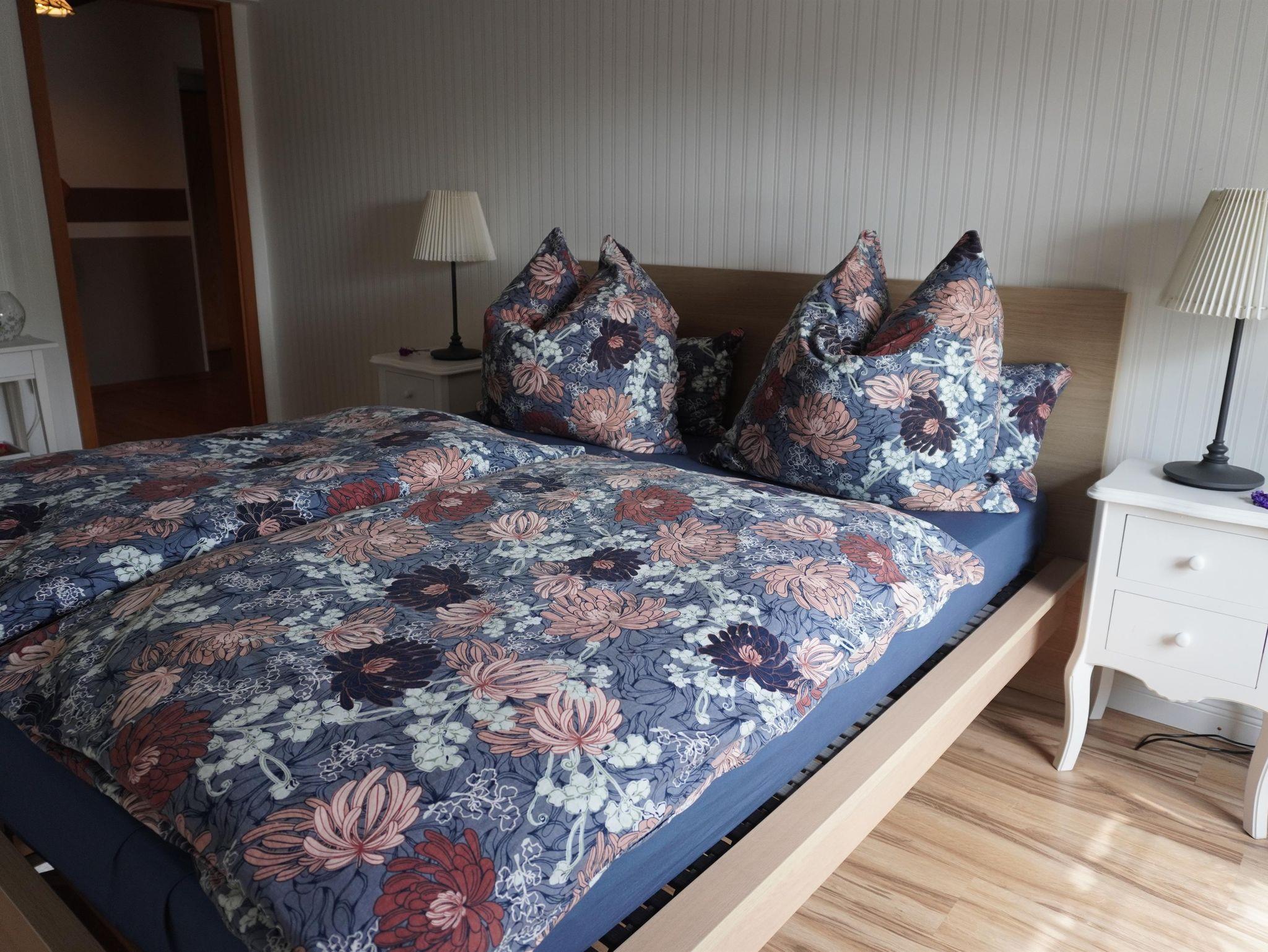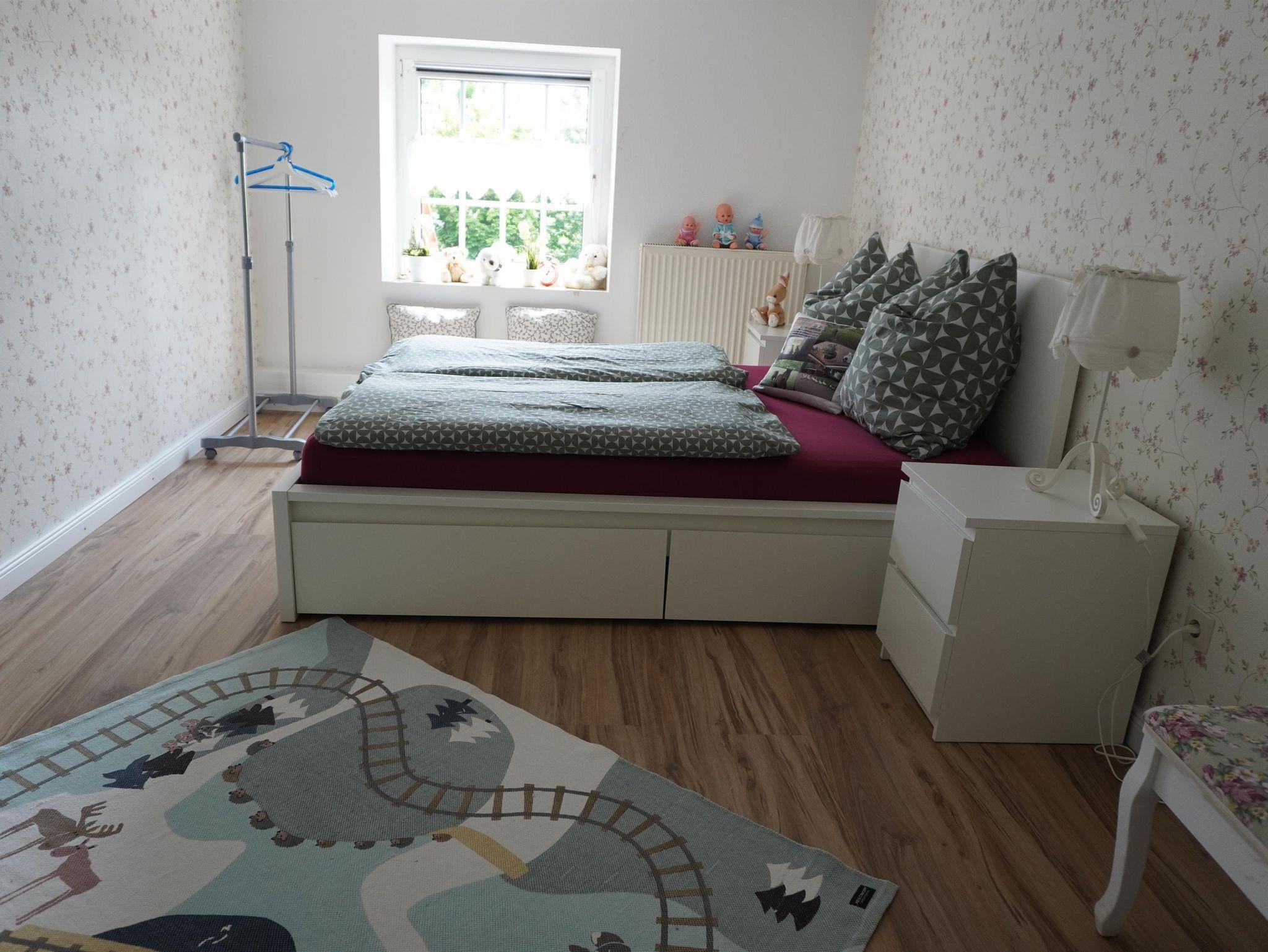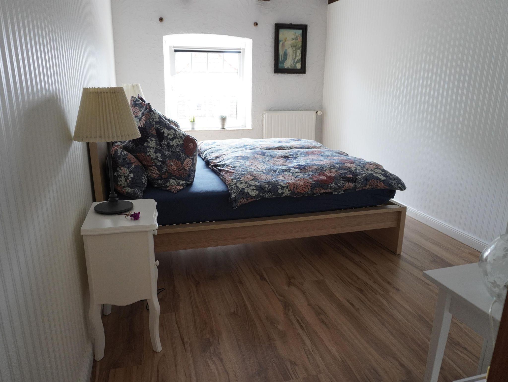 Über eine Treppe führt der Weg in das zweite Feriendomizil, welches sich auch im 1. OG der Burgstätte befindet. Die Wohn-Küche ist großzügig gestaltet und verfügt über eine geräumige Küchenzeile mit Essecke. Ebenfalls finden Sie dort ein gemütliches Sofa, einen Fernseher, sowie Spiele und Bücher. Von dort aus kommen Sie in das erste Schlafzimmer. Dies ist mit einem Tandembett (90/180 x 200cm) ausgestattet. Von da aus gelangen Sie in das zweite Schlafzimmer, wo ein Boxspringbett auf Sie wartet. Hier haben Sie eine erholsame Nacht, damit Sie gut erholt in den neuen Tag starten können. Das Badezimmer ist mit WC und Dusche ausgestattet.