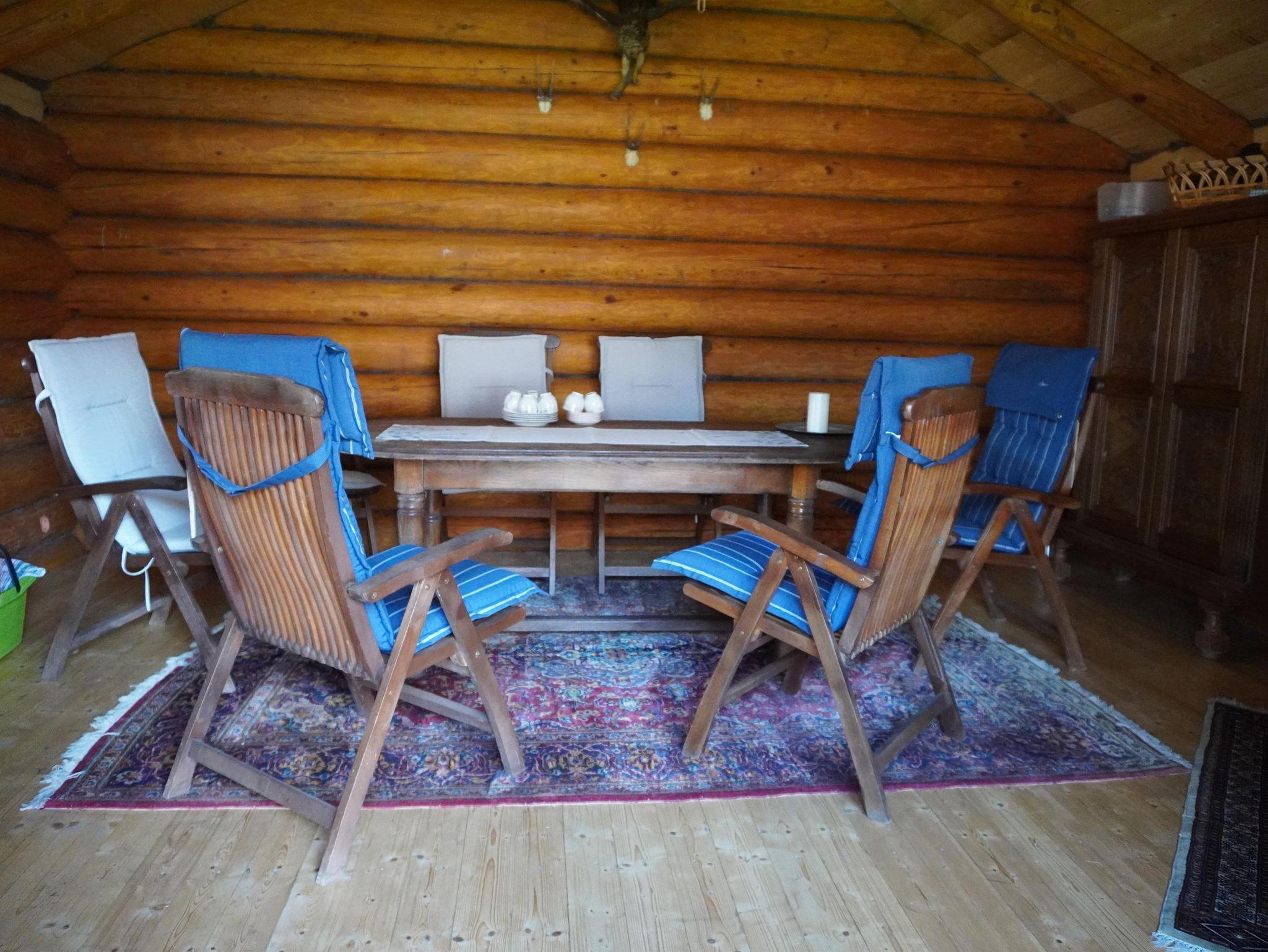 In unserer gemütlichen Blockhütte können Sie an regentrüben Tagen oder wenn es etwas frischer ist, gemütlich lesen, spielen und essen.