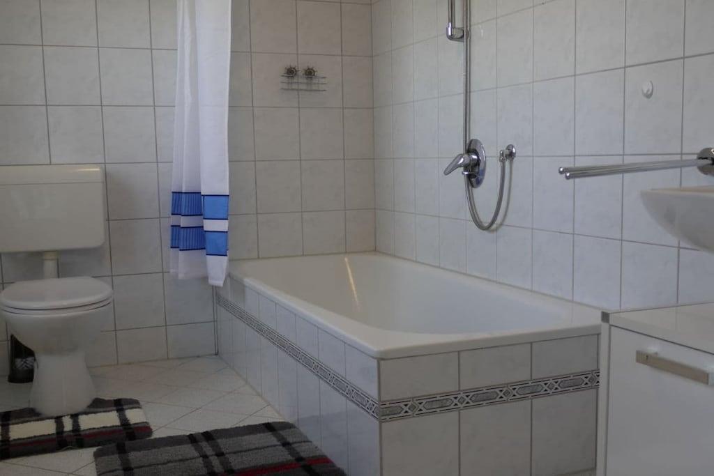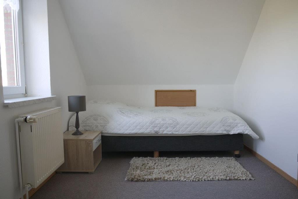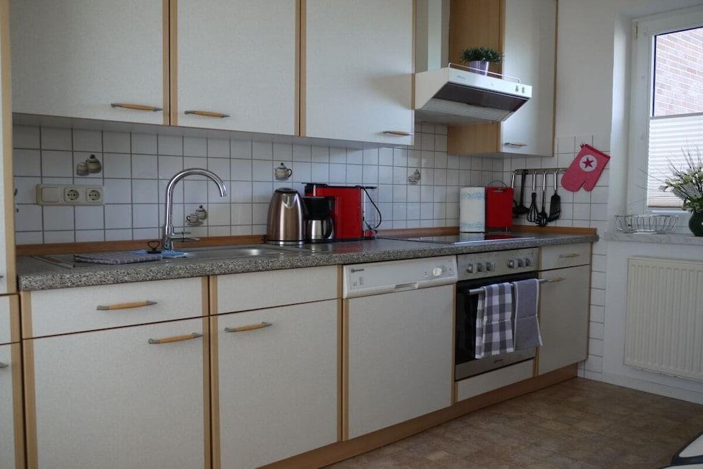 Ihr Feriendomizil verfügt im Erdgeschoss über eine komplett ausgestattete Küche, einem Wohn-/Eßbereich mit TV sowie einem Bad/WC mit Badewanne. Im Obergeschoss befinden sich zwei Schlafzimmer (1 x Doppelbett, 2 x Einzelbett). Ein Bügelbrett, Bügeleisen, Kinderbett und ein Hochstuhl sind in der Wohnung vorhaden. In einem separaten Raum steht Ihnen eine Waschmaschine zur freien Verfügung. Eine eigene überdachte Terrasse gehört zur Wohnung, , hier können Sie sich bei sonnigen Tagen die frische 'Nordseeluft' um die Nase wehen lassen. Der Garten ist mit den anderen Wohneinheiten gemeinsam zu nutzen. Ein Parkplatz, eine Ladestation für E-Autos sowie Unterstellmöglichkeiten für Ihre Fahrräder sind ebenfalls vorhanden.
