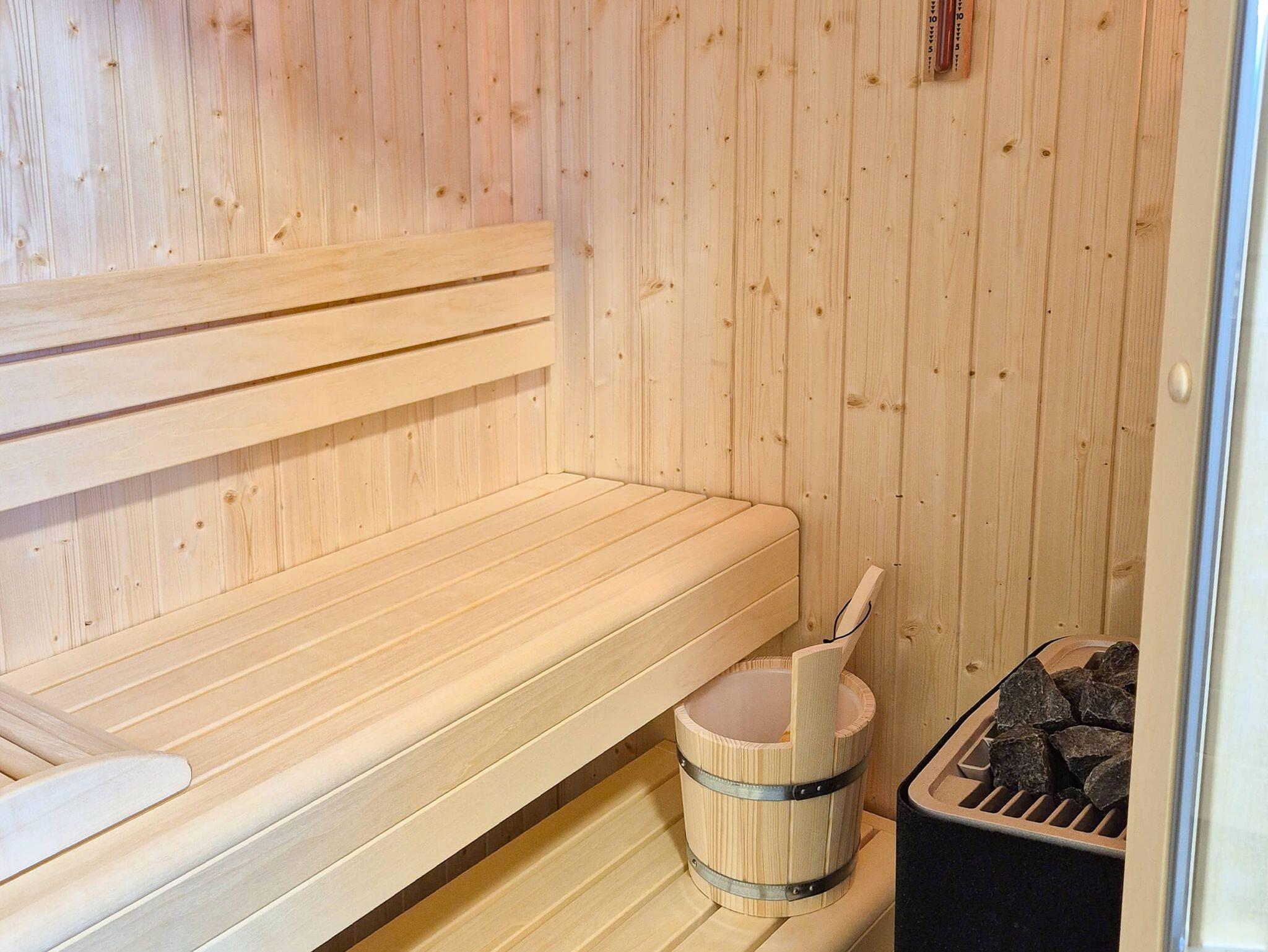 Eine eingebaute Sauna steht zu jeder Jahreszeit zur kostenlosen privaten Benutzung zur Verfügung.