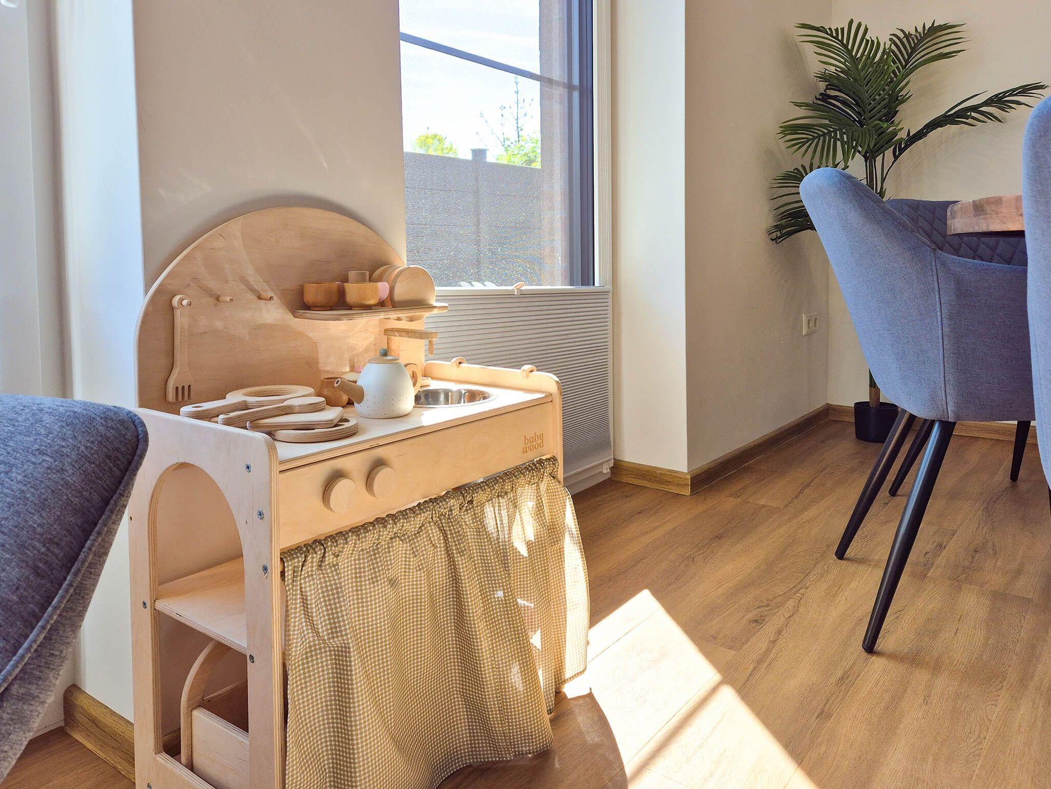 Im eigenen Garten, der komplett eingezäunt ist (Hunde können frei laufen), gibt es einladende Sitzgelegenheiten und Einrichtungen für die Kinder.