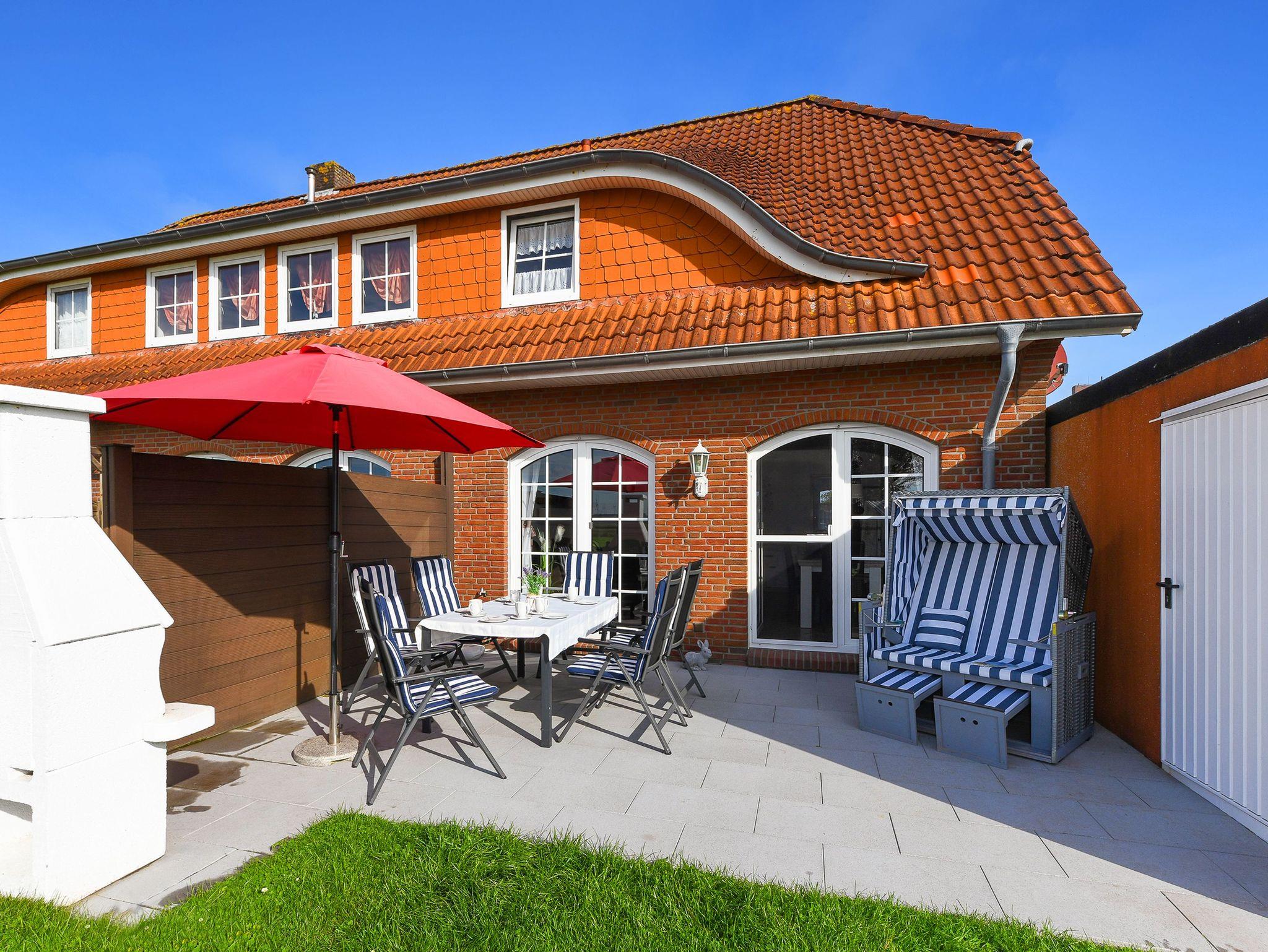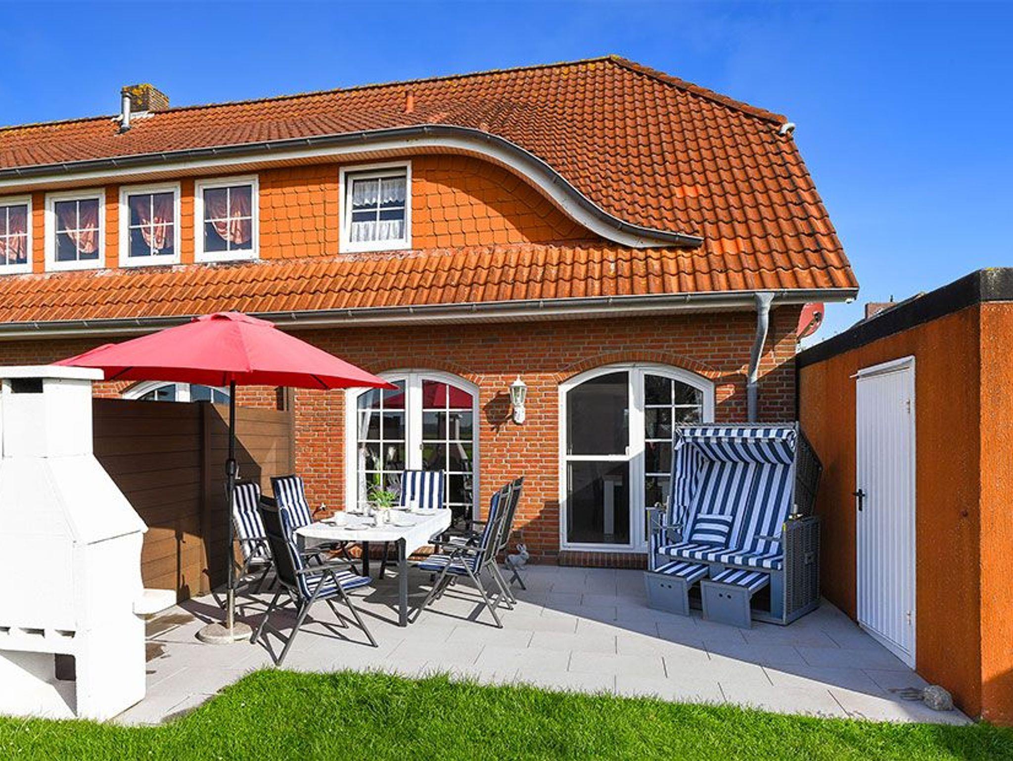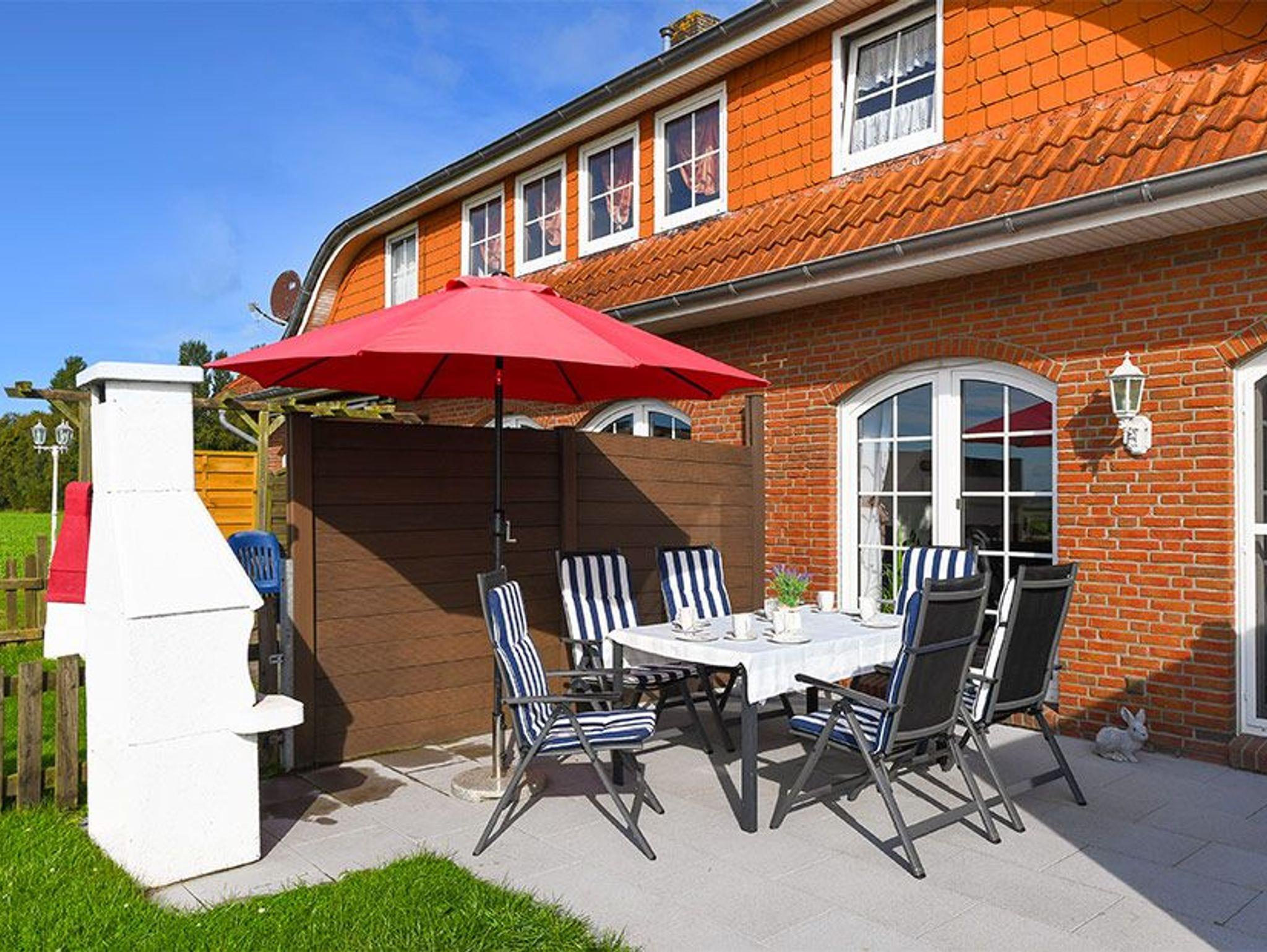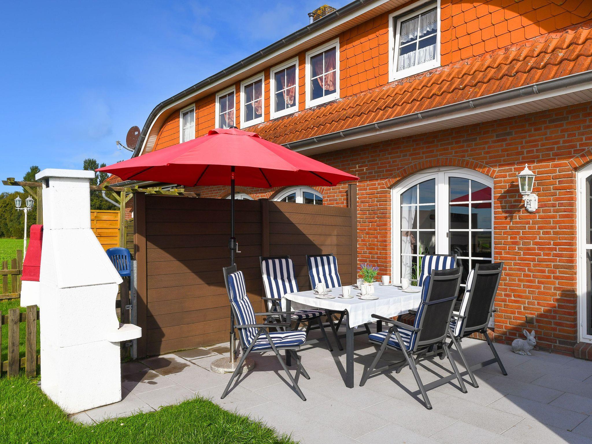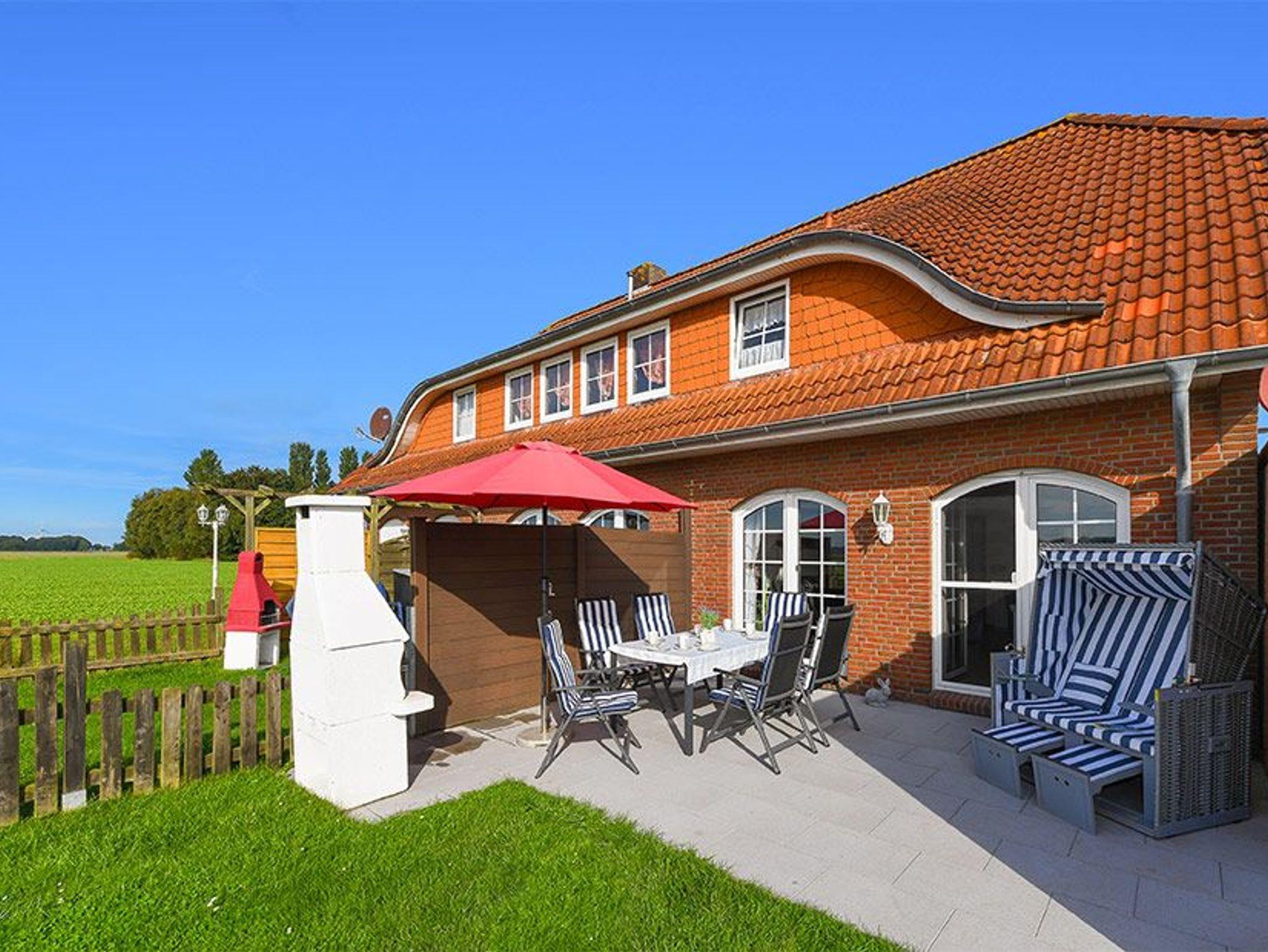 Gemütliches Ferienhaus Hosnhuus in Dornumergrode, ideal für erholsamen Nordseeurlaub mit Terrasse und Gartenblick.