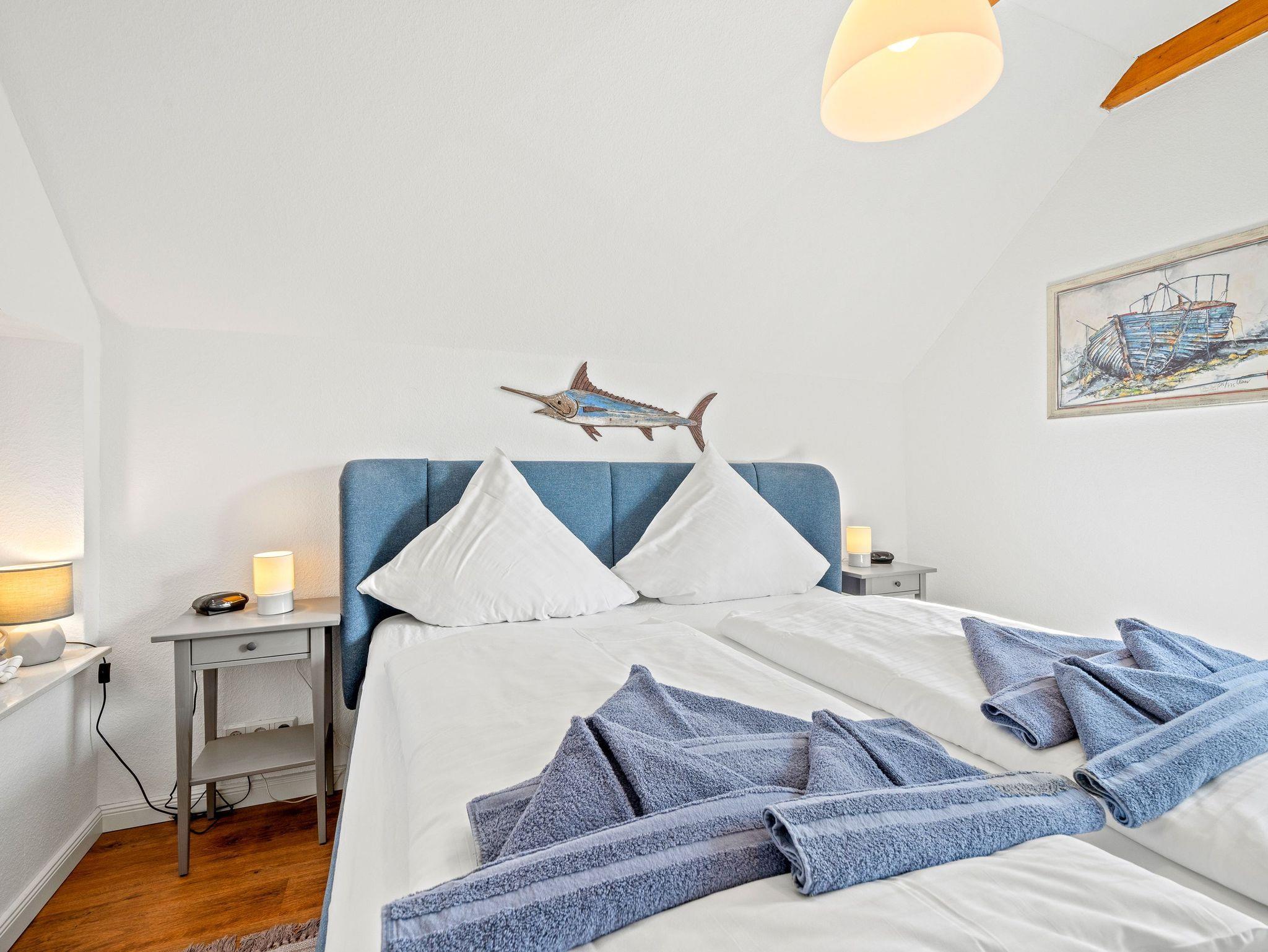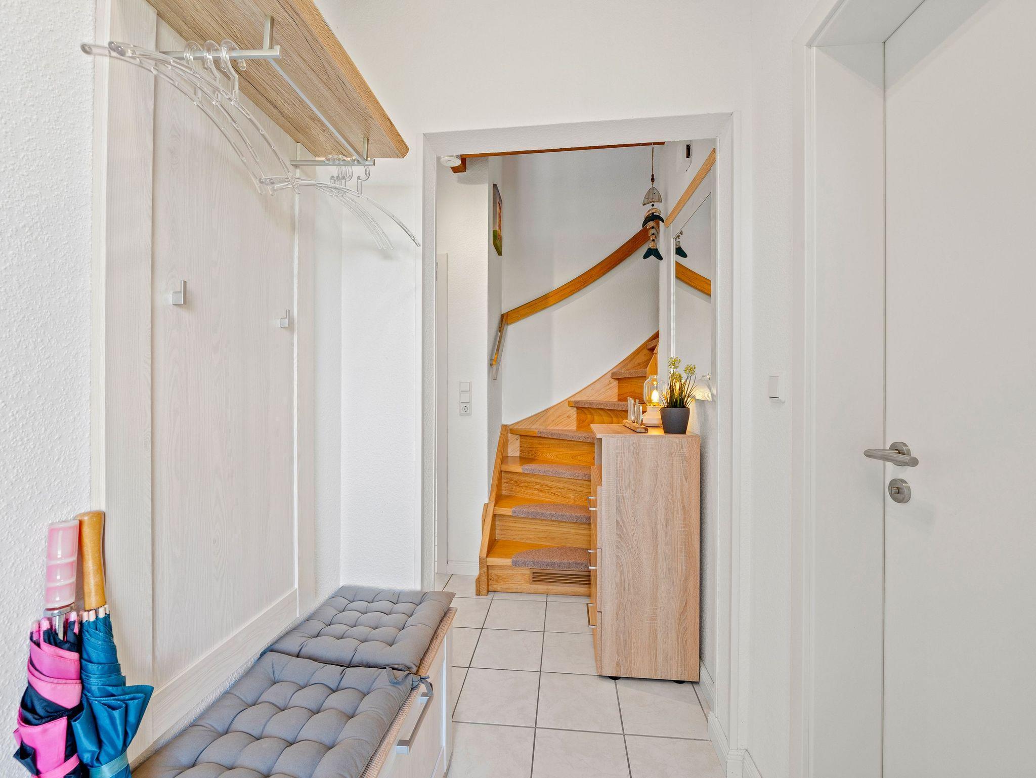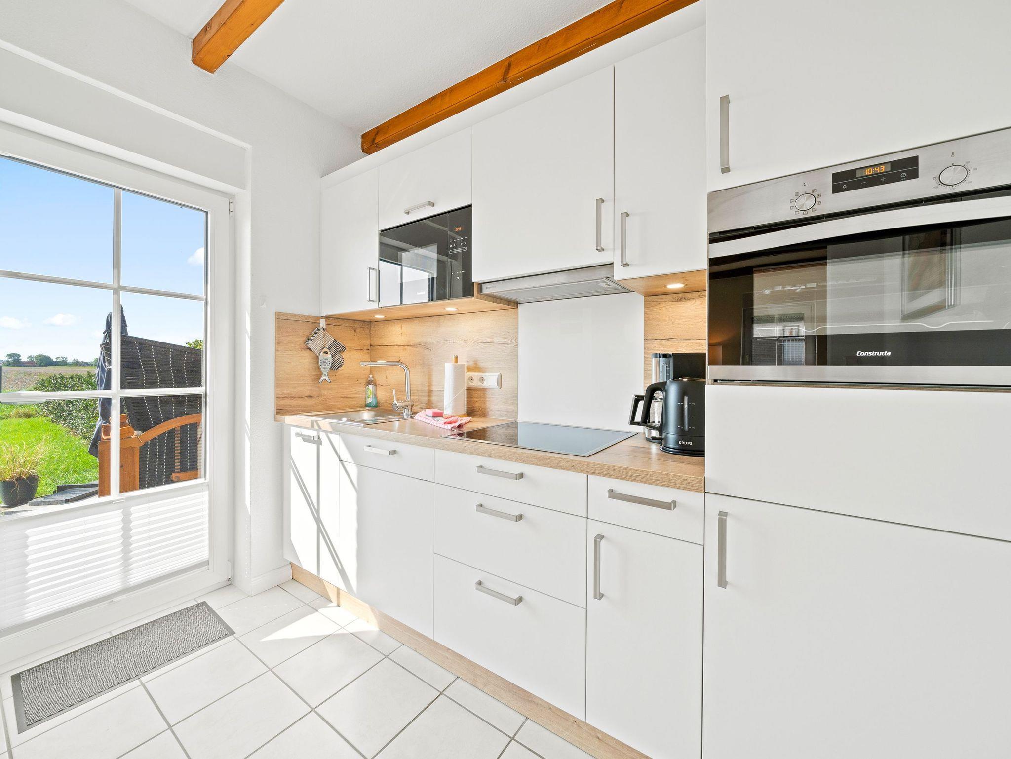 Die Komfort-Doppelhaushälfte ist hochwertig ausgestattet. Im Erdgeschoss befinden sich das gemütliche Wohnzimmer, der offene Küchenbereich mit vollausgestatteter Einbauküche, ein Schlafzimmer mit Doppelbett und Babyreisebett sowie ein Duschbad. Die Waschmaschine befindet sich im Hauswirtschaftsraum. Im Dachgeschoss befinden sich ein zweites Bad mit Wanne und Duschabtrennung, ein Schlafzimmer mit Doppelbett und eine gemütliche Leseecke. Das komplette EG ist mit Rollläden und Insektenschutz ausgestattet. Im DG sind die Veluxfenster mit Insektenschutz und Verdunkelungsrollos ausgestattet. Zusätzlich gibt es ein Gartenhaus mit Fahrradabstellmöglichkeit und zwei Parkplätzen am Haus.