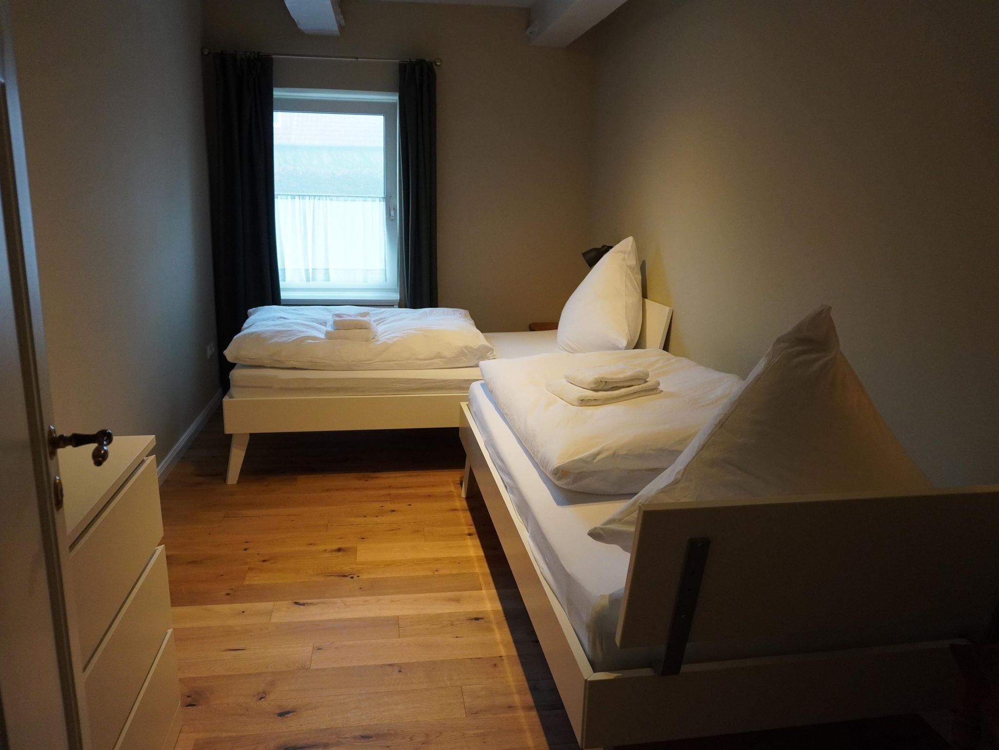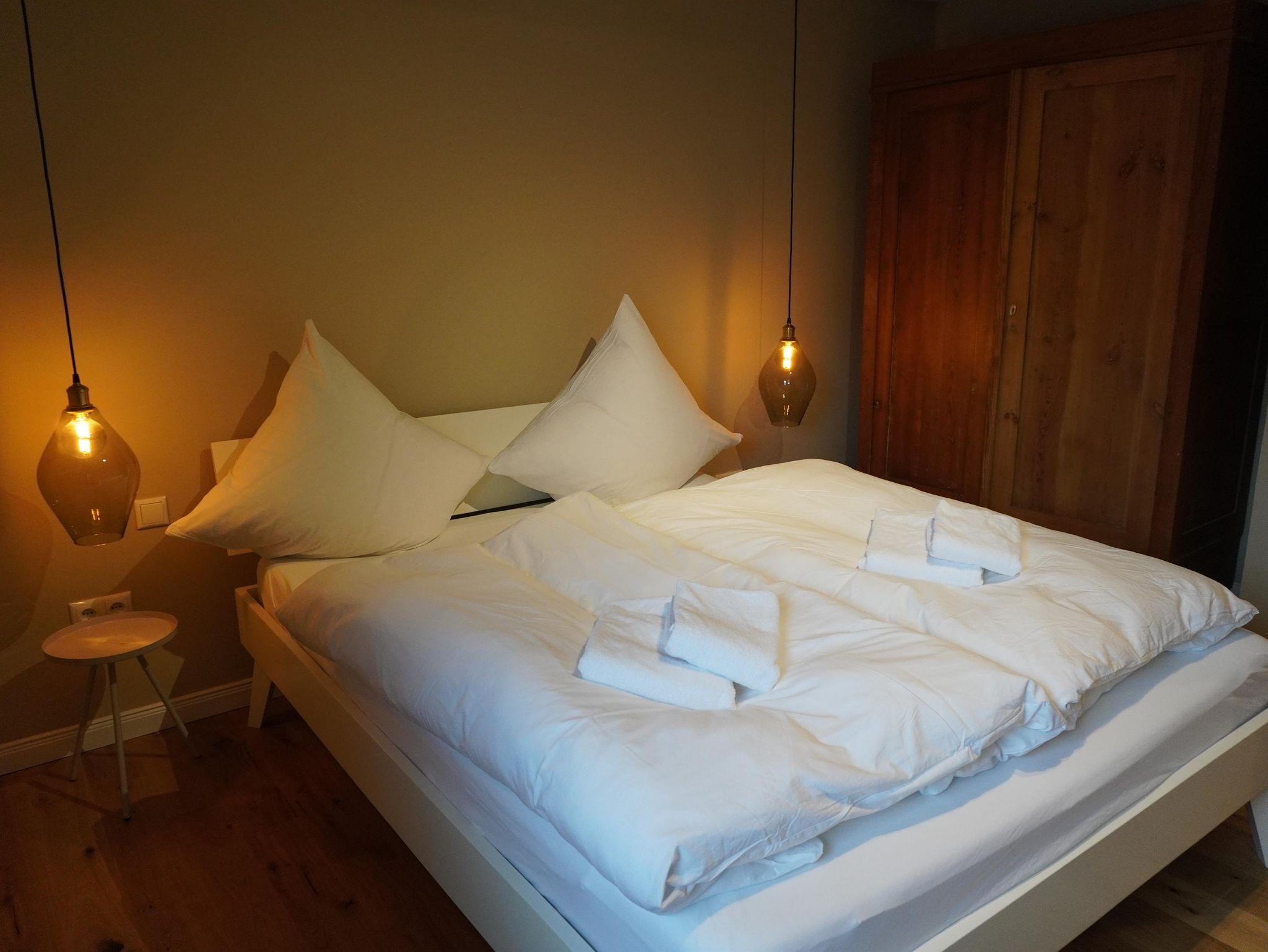 Mädchenzimmer: Das Mädchenzimmer ist eine 65m² große Oberwohnung in der histroische Elemente mit modernen kombiniert wurden. Der Ess- und Wohnbereich beinhaltet eine vollausgestattete Küche, ein Esstisch für vier Personen, eine gemütliche Couch und ein Sat-TV. Ein großes Doppelzimmer und ein Zweibettzimmer dienen als Schlafmöglichkeit. Das Badezimmer ist mit einem WC und einer Dusche ausgestattet. Der Balkon ist nach Südwest ausgerichtet.