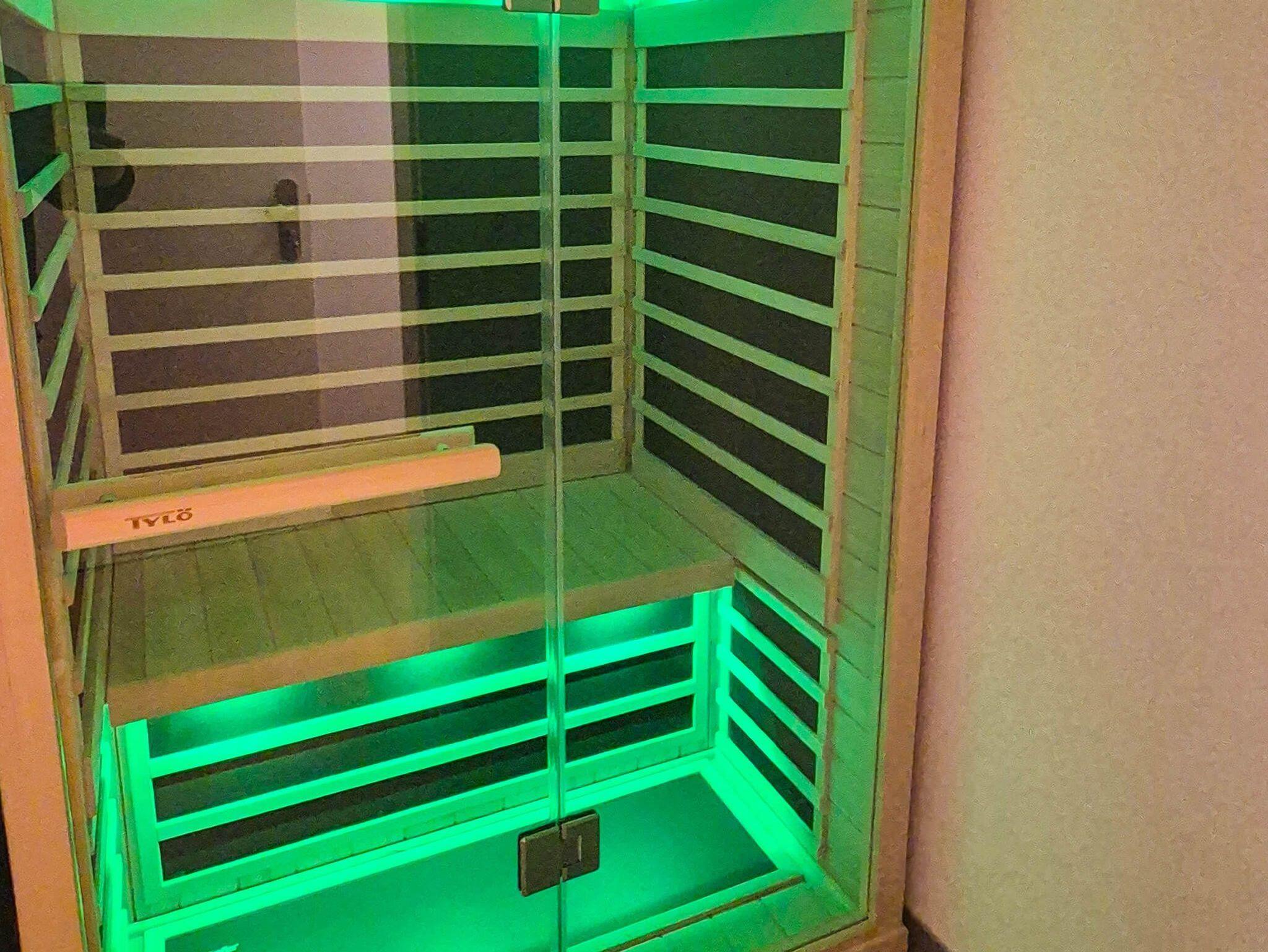 Eine eingebaute Infrarotsauna steht zu jeder Jahreszeit zur kostenlosen privaten Benutzung zur Verfügung.