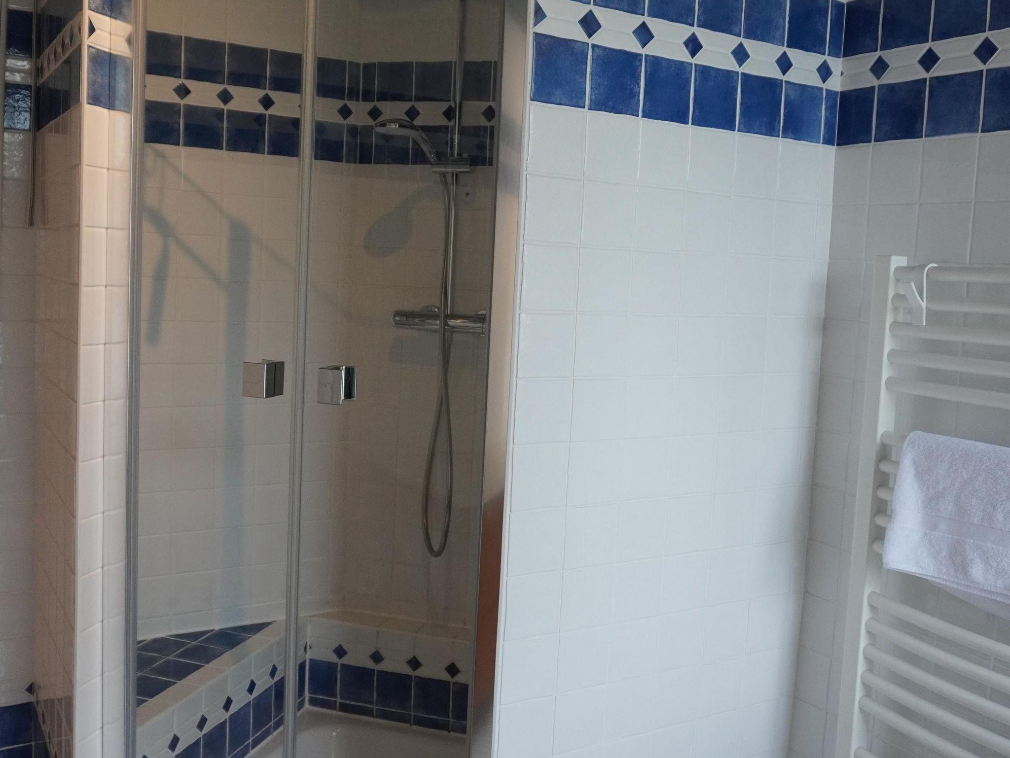 Lehrlingszimmer: Die 92m² große Oberwohnung besticht durch die vielen warmen Blautöne mit Gemütlichkeit. Der große Wohn- und Essbereich ist mit einer vollausgestatteten Küche, einen Essbereich, eine Couch und Sat-TV ausgestattet. Als Schlafmöglichkeit dient ein Doppelzimmer, ein Zweibettzimmer sowie eine Schlafkoje im Flur. Das Badezimmer isz mit einem WC und einer großen Dusche ausgestattet. Ein seperates WC ist vorhanden. Der Balkon ist nach Südwest ausgerichtet.
