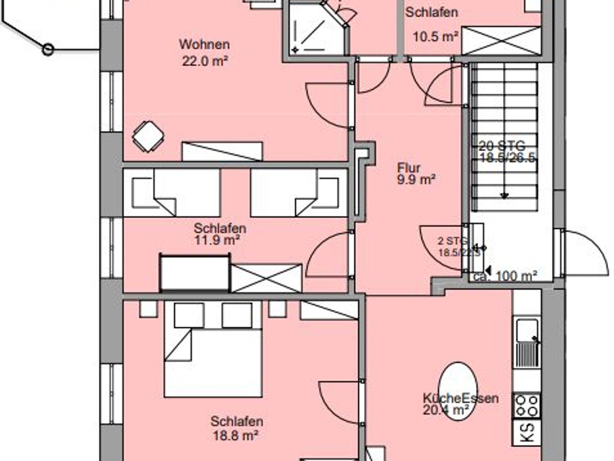 Kinderzimmer: Auf insgesamt 100m² können bis zu sieben Personen Platz finden. Der lichtdurchflutete Koch- und Essbereich lädt mit der großen, vollausgestatteten Küche zum Kochen ein. Das große Wohnzimmer ist mit einer gemütlichen Couch, einem Arbeitsplatz und einen Sat-TV ausgestattet. Als Schlafmöglichkeit dienen die zwei Doppelzimmer und das Zweibettzimmer. Das Badezimmer besitzt ein WC und eine große Dusche. Der Balkon ist nach Süden ausgerichtet.