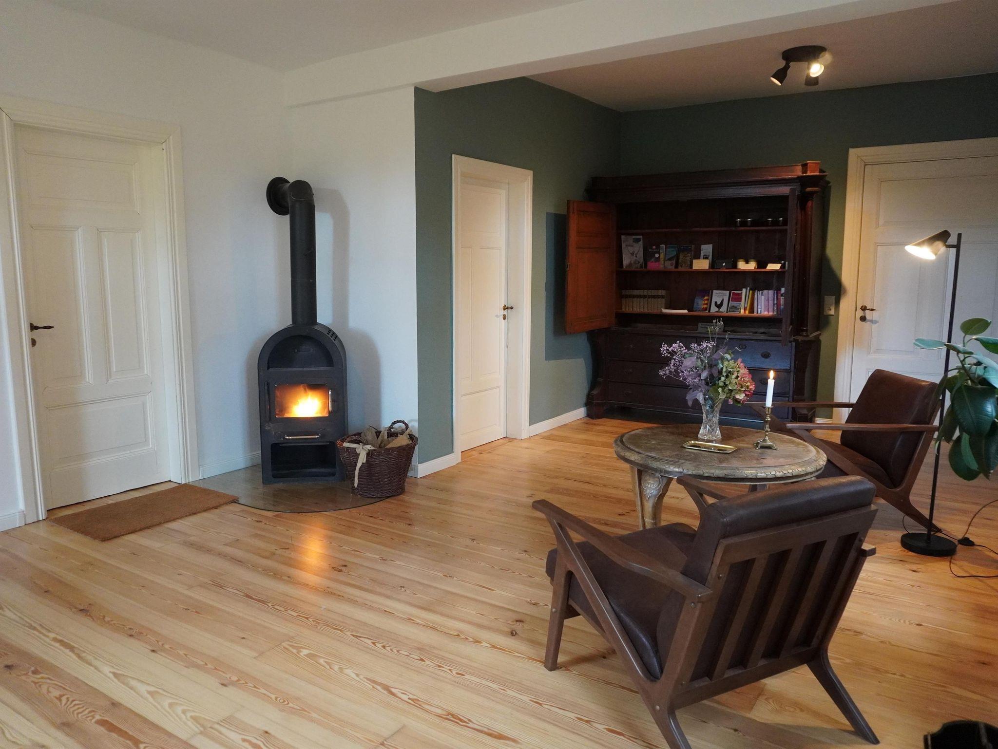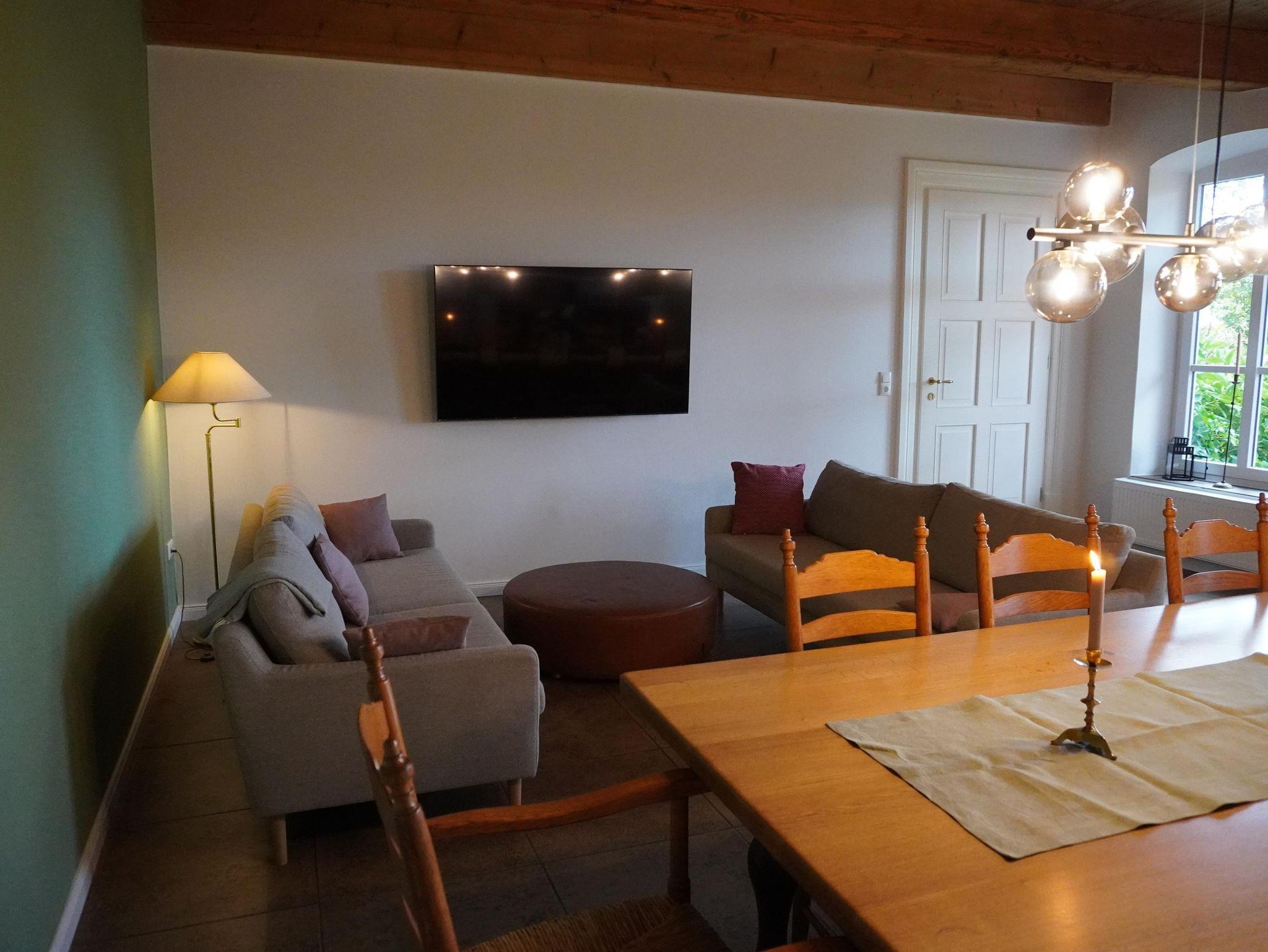 Kaarnhaus: Das alte Kaarnhaus stellt ehemals die Verbindung zwischen Wirtschafts- und Wohngebäude da. Jetzt ist hier eine 79m² gemütliche Wohnung für vier Personen entstanden. Im Erdgeschoss befindet sich der Wohn- und Essbereich mit einem gemütlichen Kamin, einer vollausgestatteten Küche, eine Couch und ein Sat-Tv. Im Obergeschoss ist ein Doppelzimmer sowie ein Zweibettzimmer vorhanden. Außerdem befindet sichim Obergeschoss das Badezimmer mit einem WC und einer Dusche. Die Terrasse ist nach Südwesten ausgerichtet.