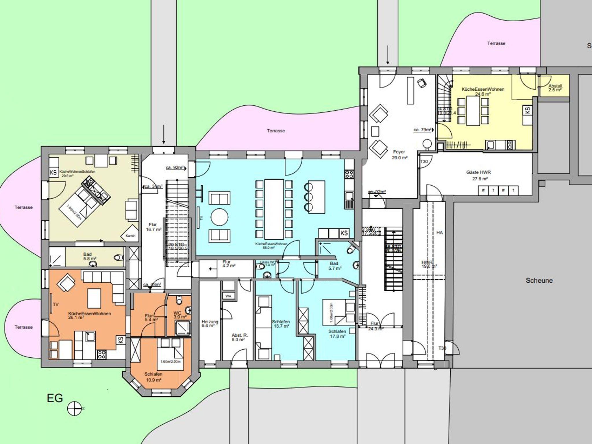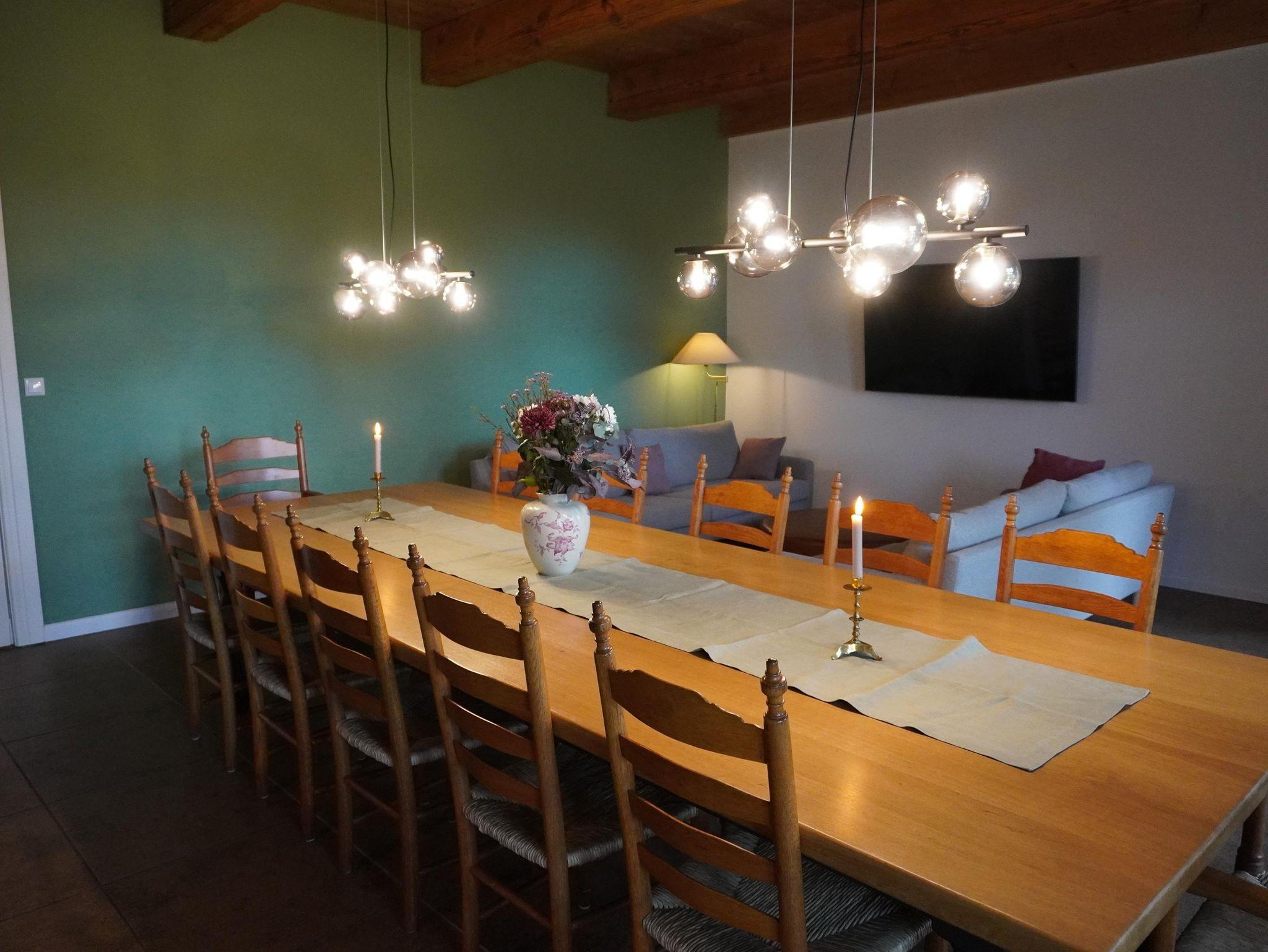 Heinis Küche: Heinis Küche ist eine 92m² große Ferienwohnung, welche die alte Küche wiederspiegelt, in der früher die Familie, Lehrlinge und Mitarbeiter gegessen haben. Die Erdgeschosswohnung verfügt über einen großen Wohn- und Essbereich mit vollausgestatteter Küche, ein großen Esstisch, eine gemütliche Couch sowie Sat-TV. Als Schlafmöglichkeiten dienen ein Doppelzimmer und ein Zweibettzimmer. Es ist ein Badezimmer mit Dusche und WC vorhanden sowie ein sepertaes WC. Die Terrasse ist nach Südwesten ausgerichtet. Heinis Küche bietet genügend Platz um als Eventlocation genutzt zu werden.