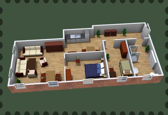 Diese 60 qm große Ferienwohnung hat 5 Räume, bestehend aus einem Wohnzimmer, einer Küche, zwei Schlafzimmern, Flur und einem Badezimmer. Das Wohnzimmer hat zwei Sofas, einen Couchtisch, einen SAT-Fernseher und einen Eßtisch mit 4 Stühlen. Die Küche ist mit Wasserkocher, Kaffeemaschine, Handmixer, Herd, Backofen, Toaster, Kühlschrank, Geschirr, Besteck, Pfannen und Töpfen ausgestattet.