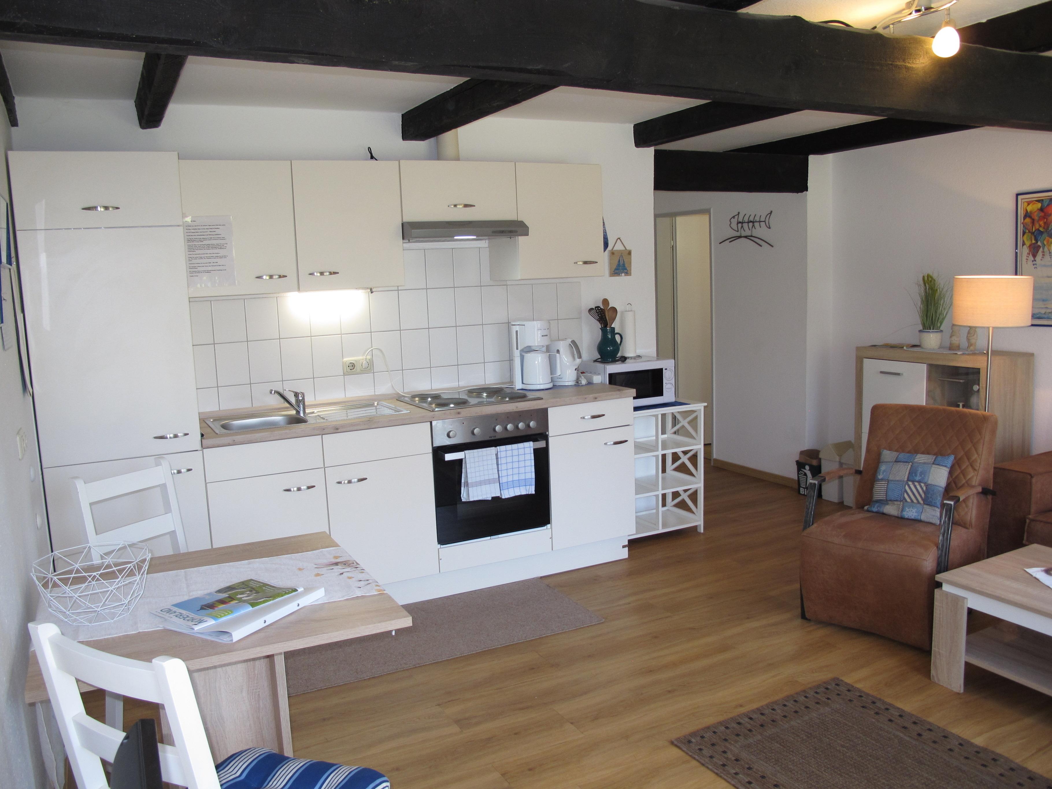 Zugang über Terrasse und separaten Eingang in großen Wohnraum mit Leder-Sitzgruppe und Eßplatz. Offene Küche mit Einbauherd (4 Platten, Backofen), Mikrowelle, Kaffeemaschine, Wasserkocher, Toaster und Kühlschrank mit Gefrierfach. Doppelzimmer. Moderne Dusche/WC. NICHTRAUCHEROBJEKT !