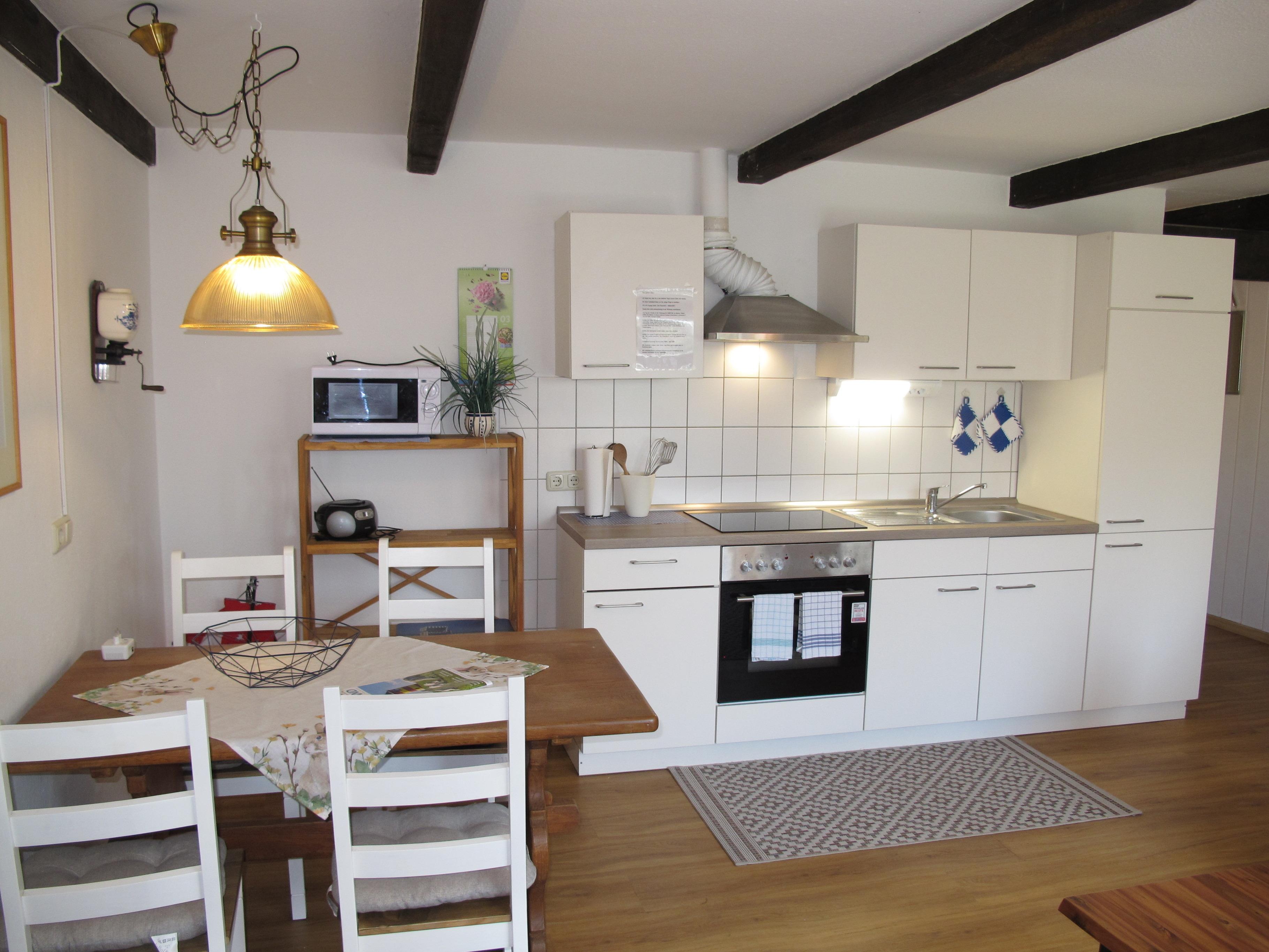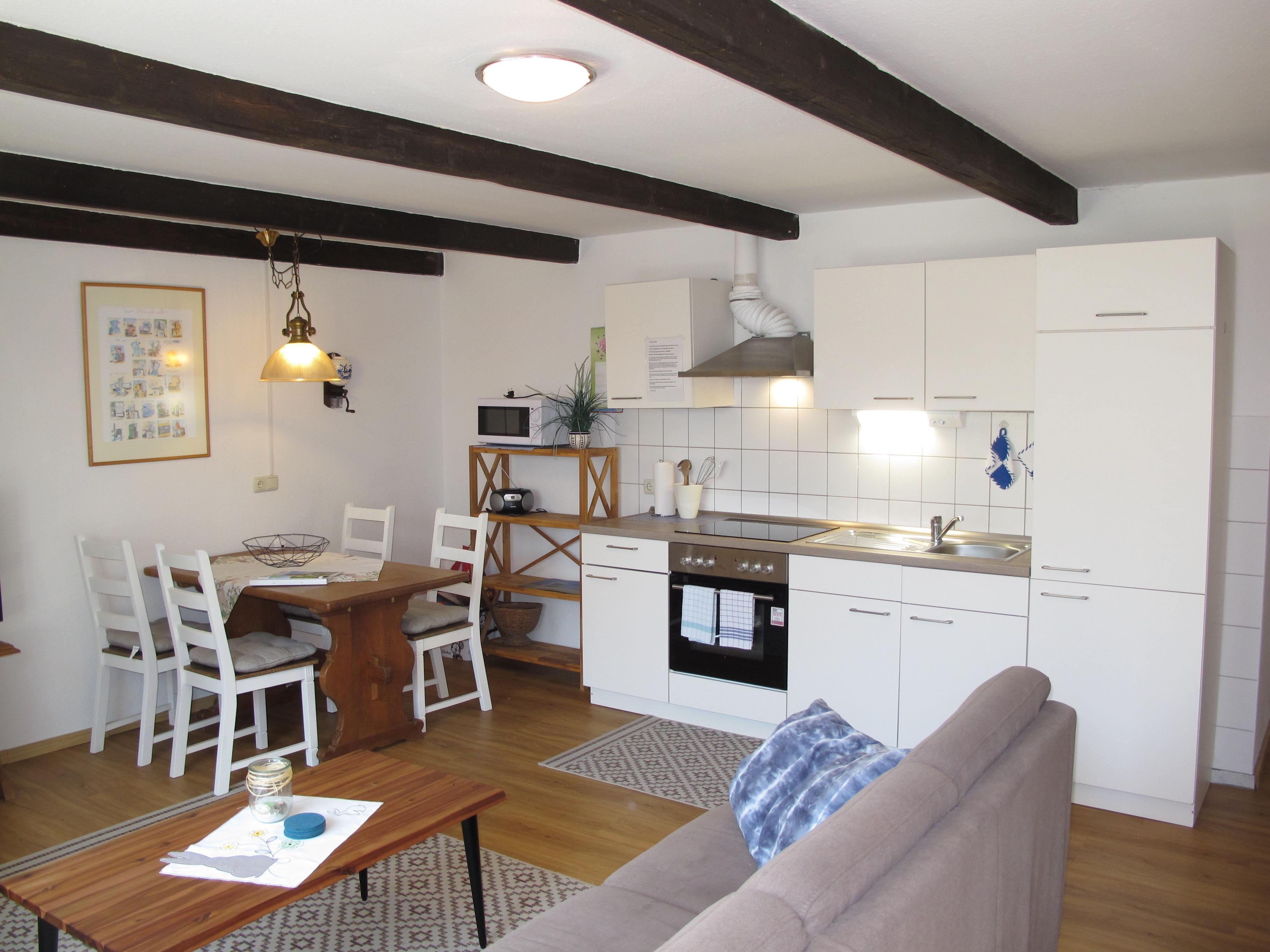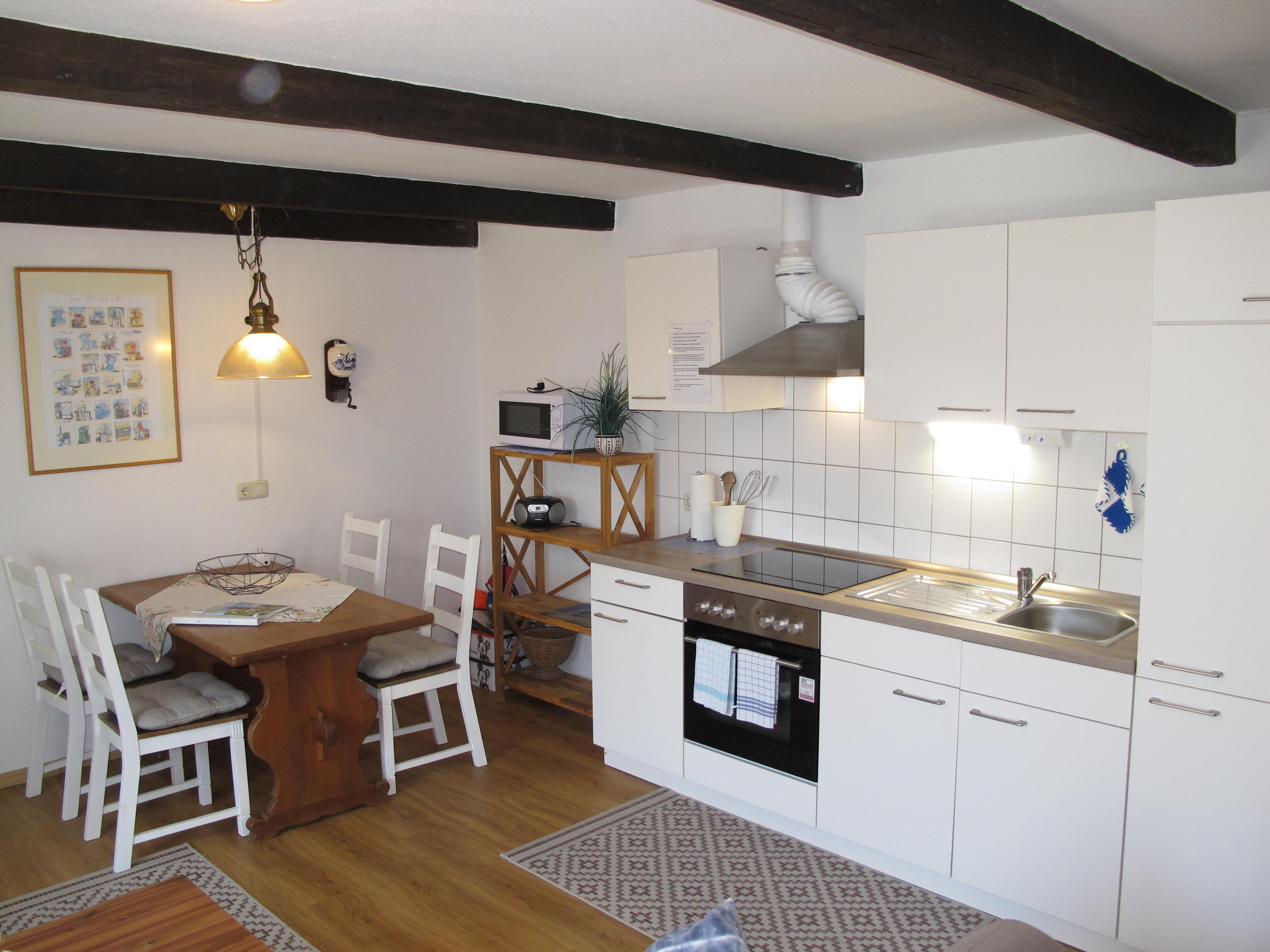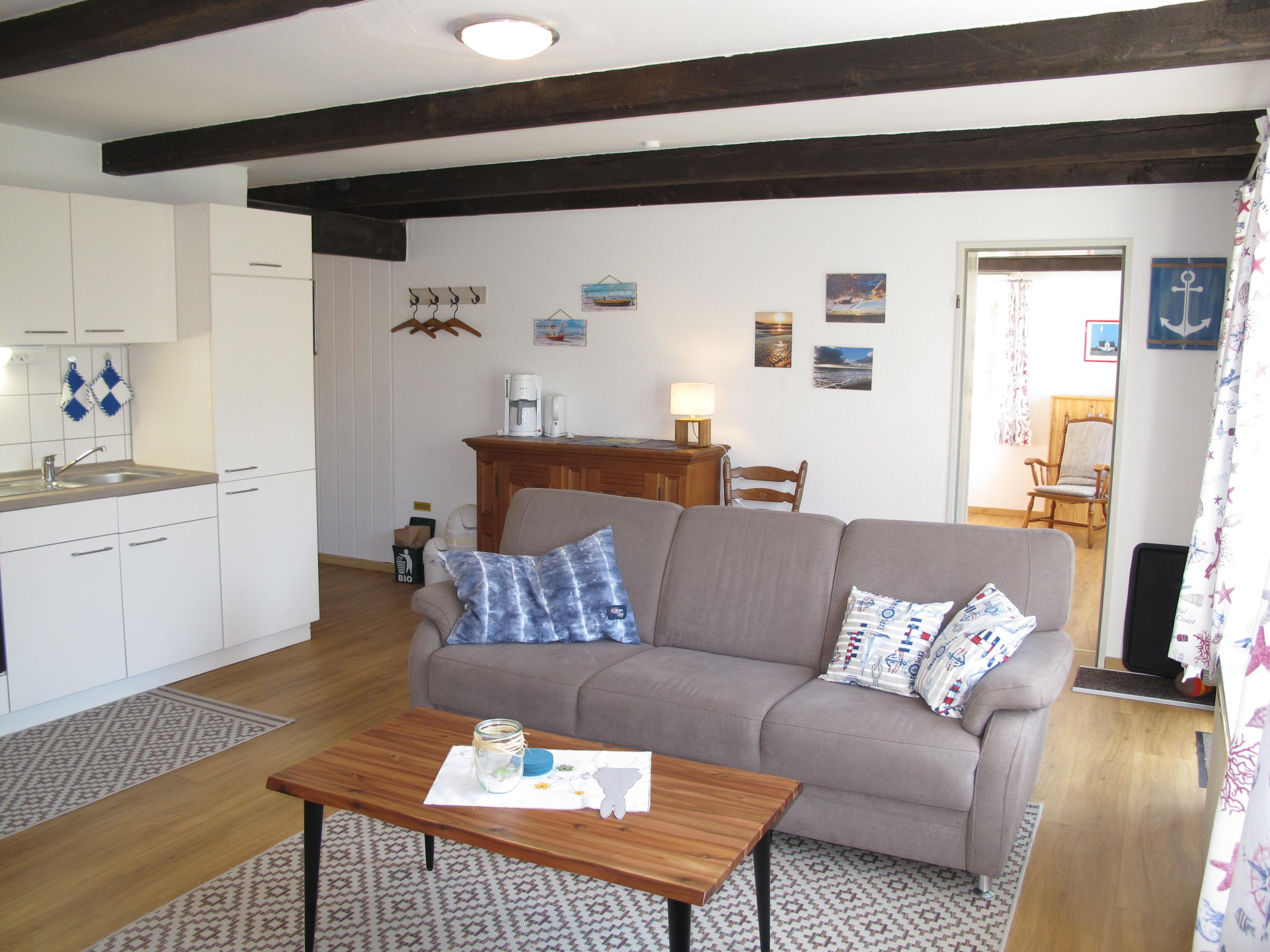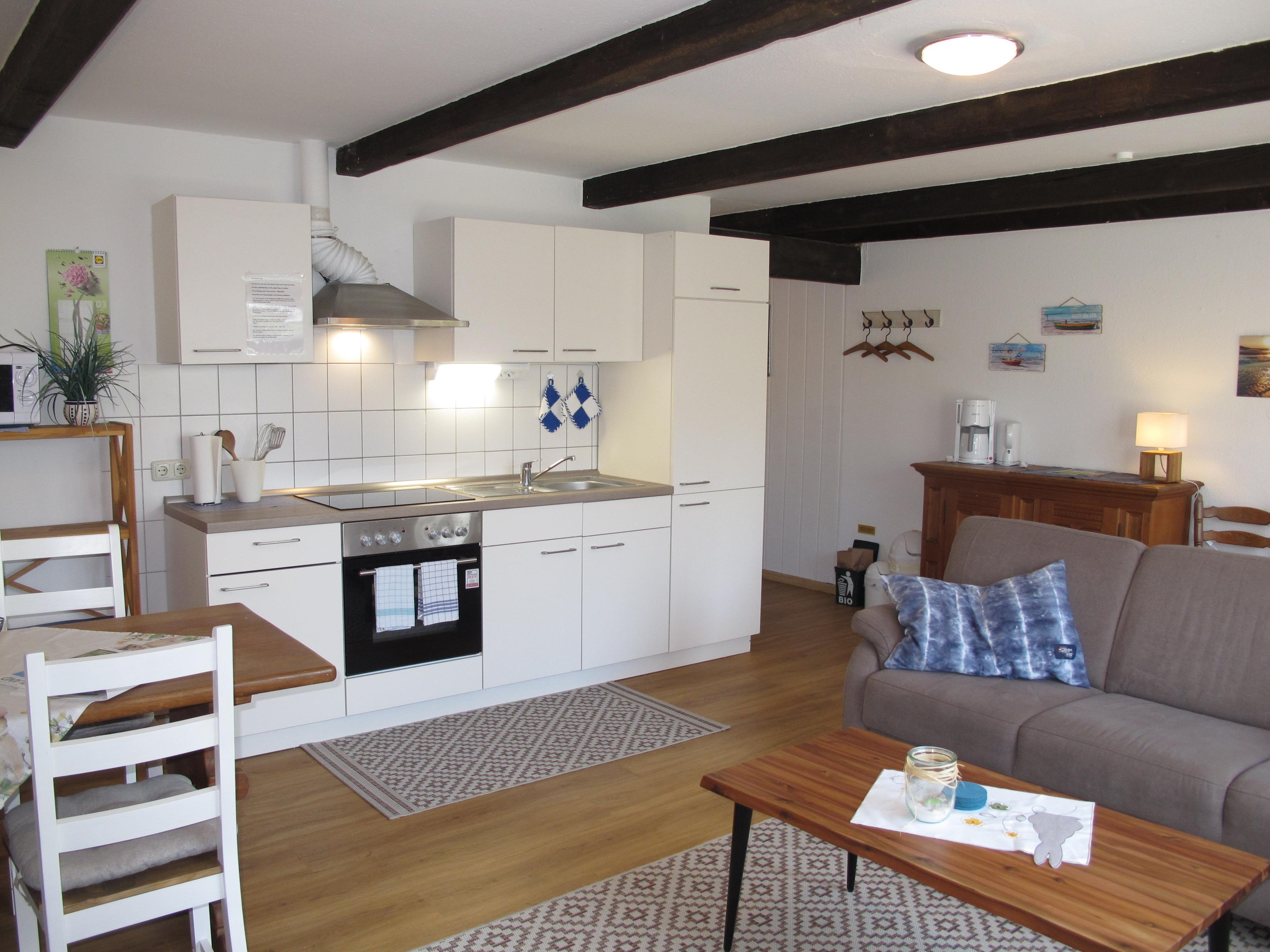 Zugang über Terrasse und separaten Eingang in : großen Wohnraum mit Sitzgruppe und Eßplatz. Offene Küche mit Einbauherd (4 Platten, Backofen), Mikrowelle, Kaffeemaschine, Wasserkocher, Toaster und Kühlschrank mit Gefrierfach. Großes Doppelzimmer. Zweibettzimmer. Dusche/WC. NICHTRAUCHEROBJEKT !