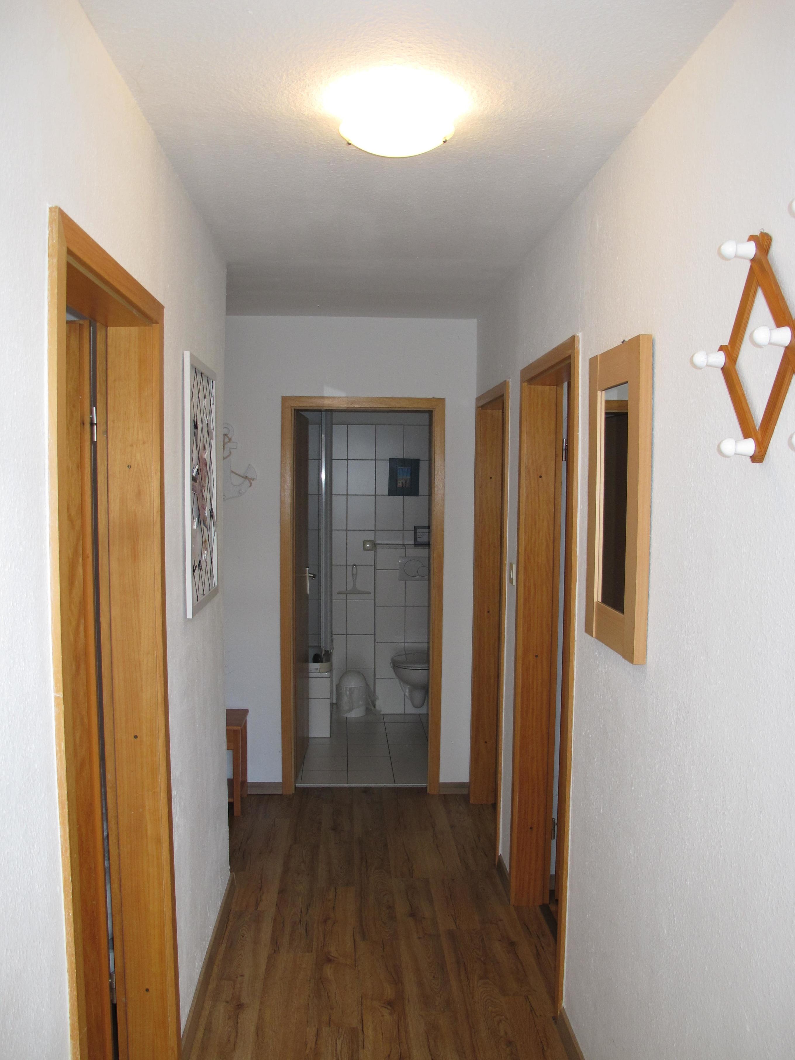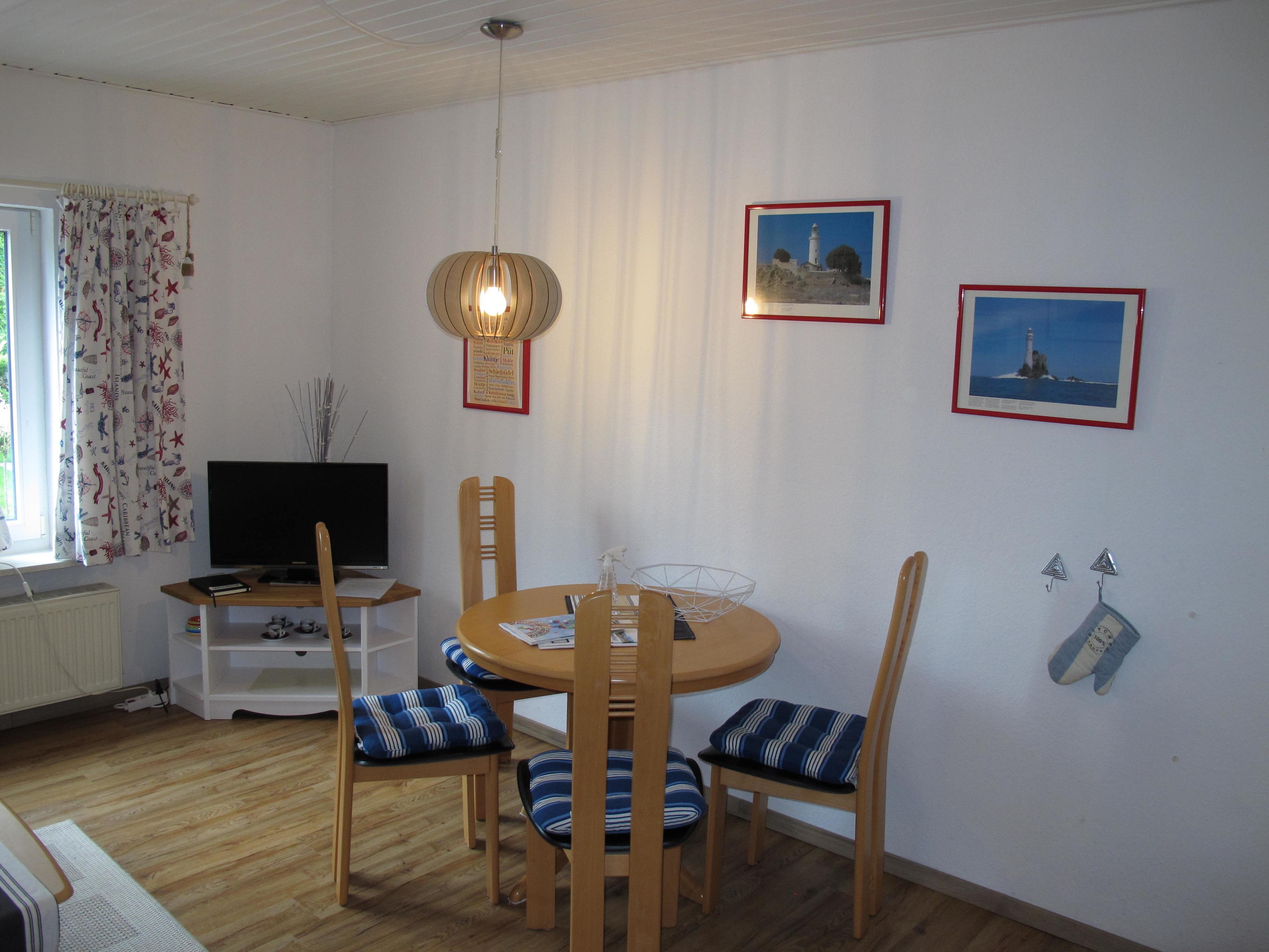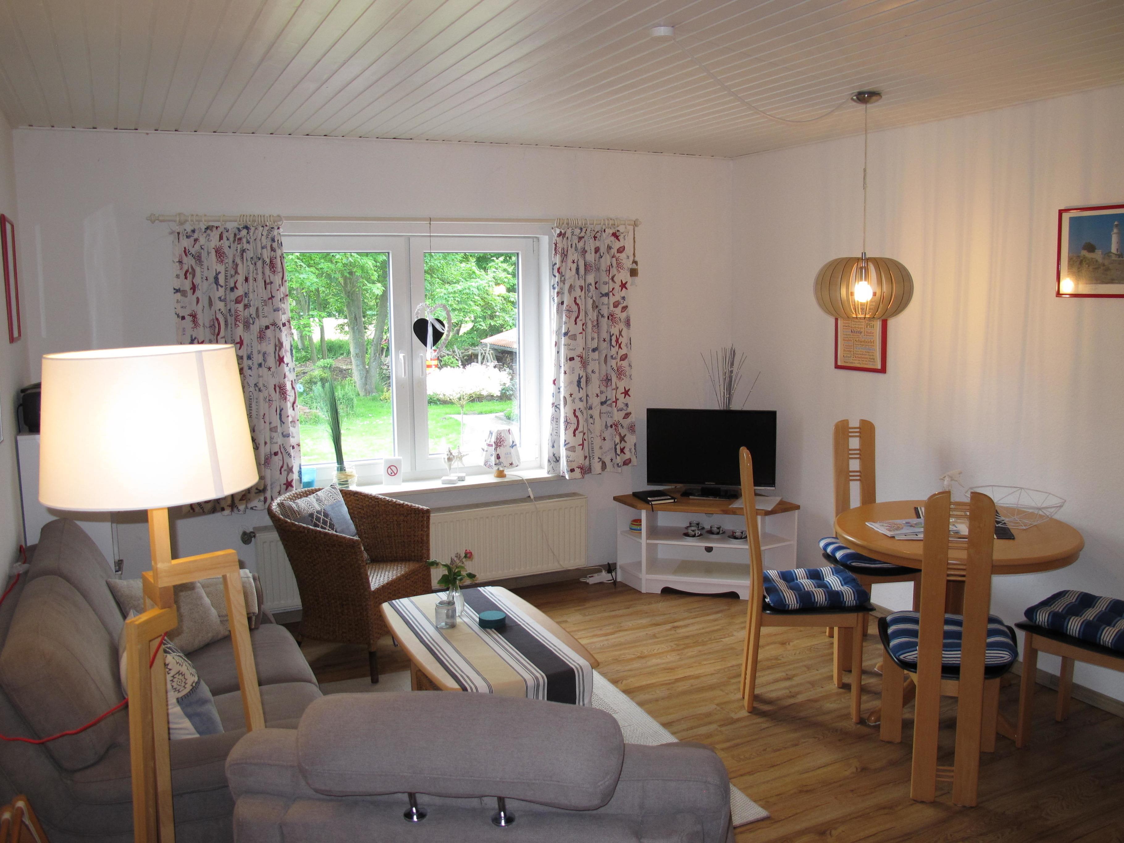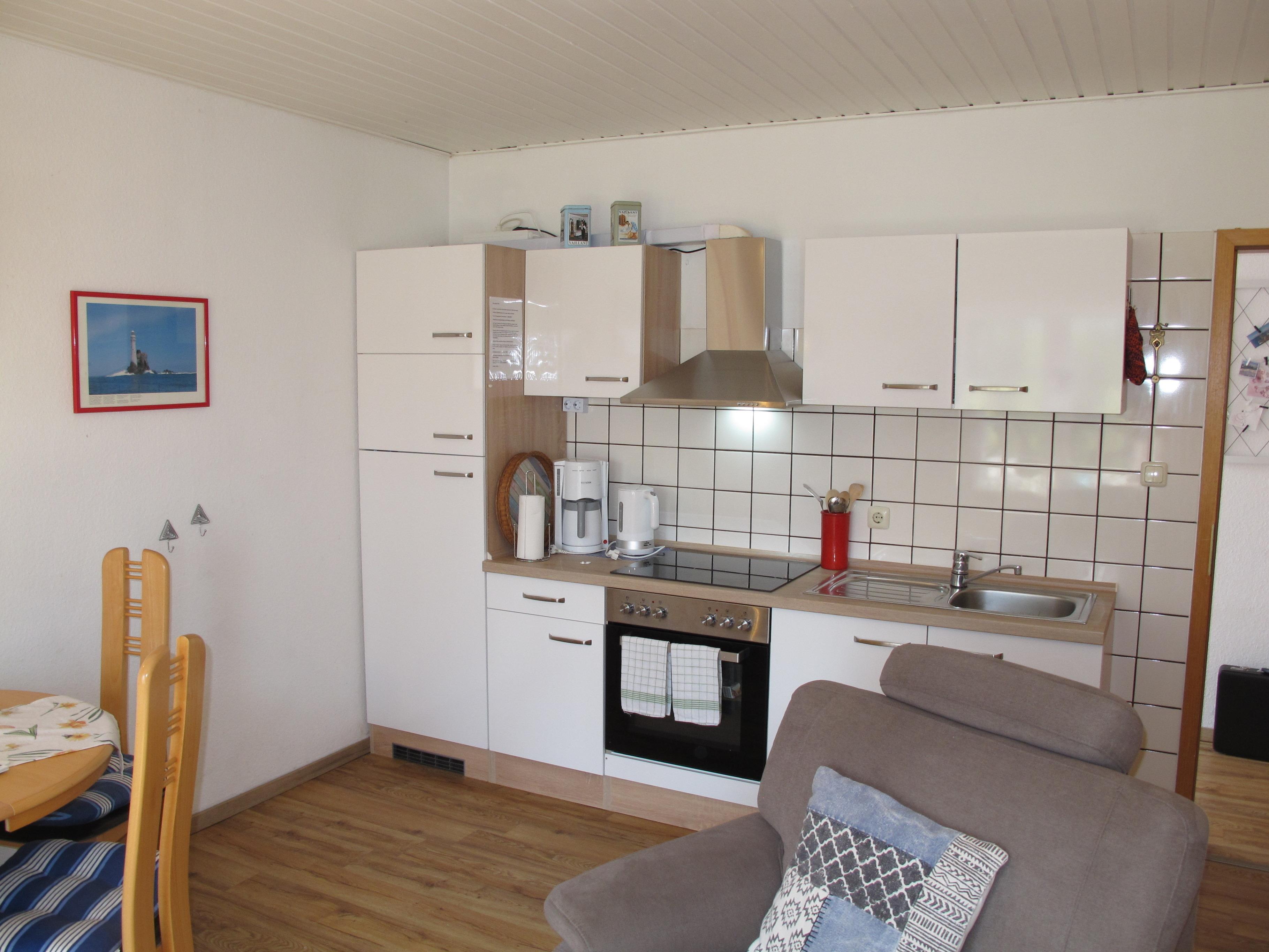 Zugang über separate Außentreppe (9 Stufen) ins Hochparterre: Flur mit Garderobe. Wohnraum mit Sitzgruppe, Eßplatz und Küchenzeile mit Einbauherd (4 Platten, Backofen), Mikrowelle, Toaster, Kaffeemaschine, Wasserkocher und Kühlschrank. Kleines Zweibettzimmer. Großes Doppelzimmer. Dusche/WC. NICHTRAUCHEROBJEKT !
