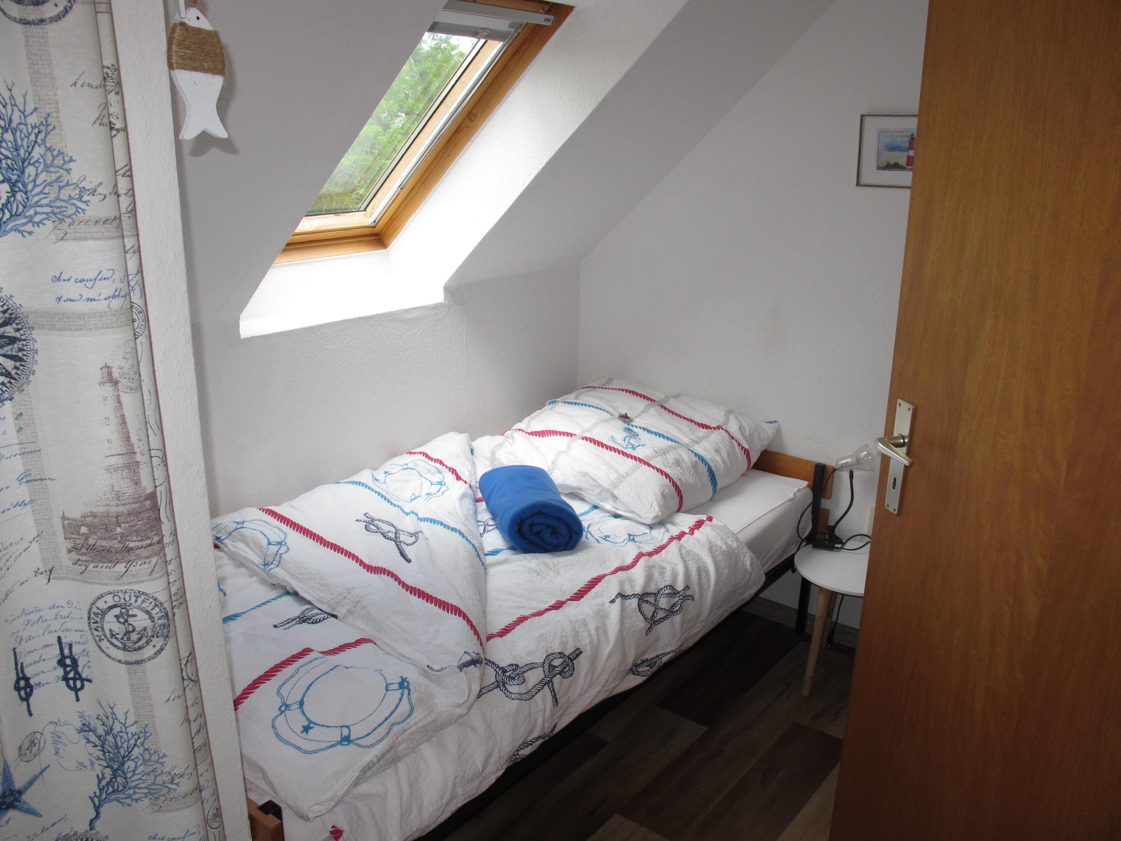 Zugang über ein internes Treppenhaus zur separaten Wohnung mit Dachschrägen: ca. 40 m² großer Wohnraum mit Sitzgruppe, Eßplatz und offener Küche mit Einbauherd (4 Platten, Backofen), Mikrowelle, Toaster, Kaffeemaschine, Wasserkocher und Kühlschrank. Großes Doppelzimmer. Kleines Zweibettzimmer mit Waschbecken. Kleines Doppelzimmer. In 2025 komplett renovierte Dusche/WC mit einer begehbaren Dusche. NICHTRAUCHEROBJEKT !