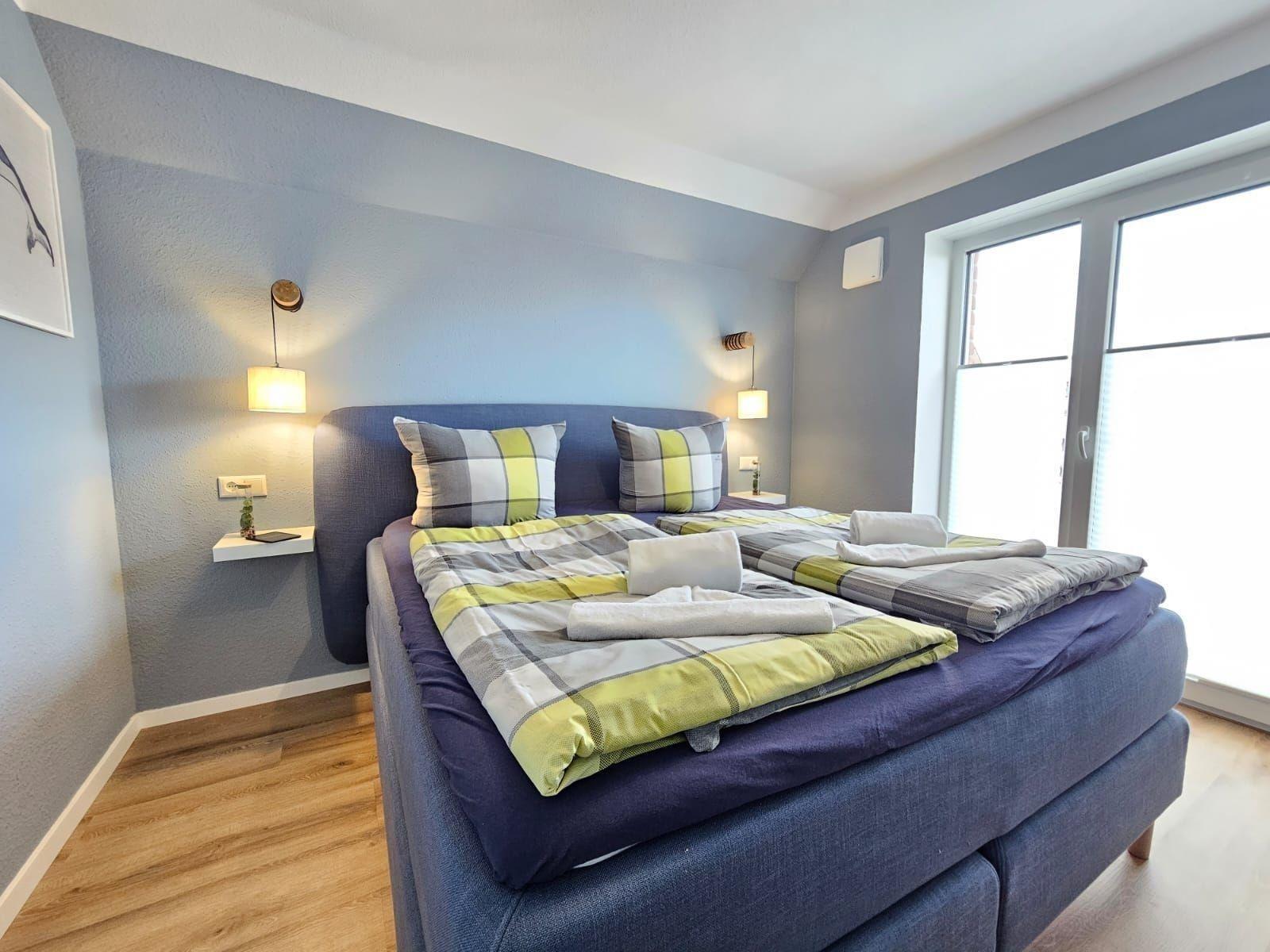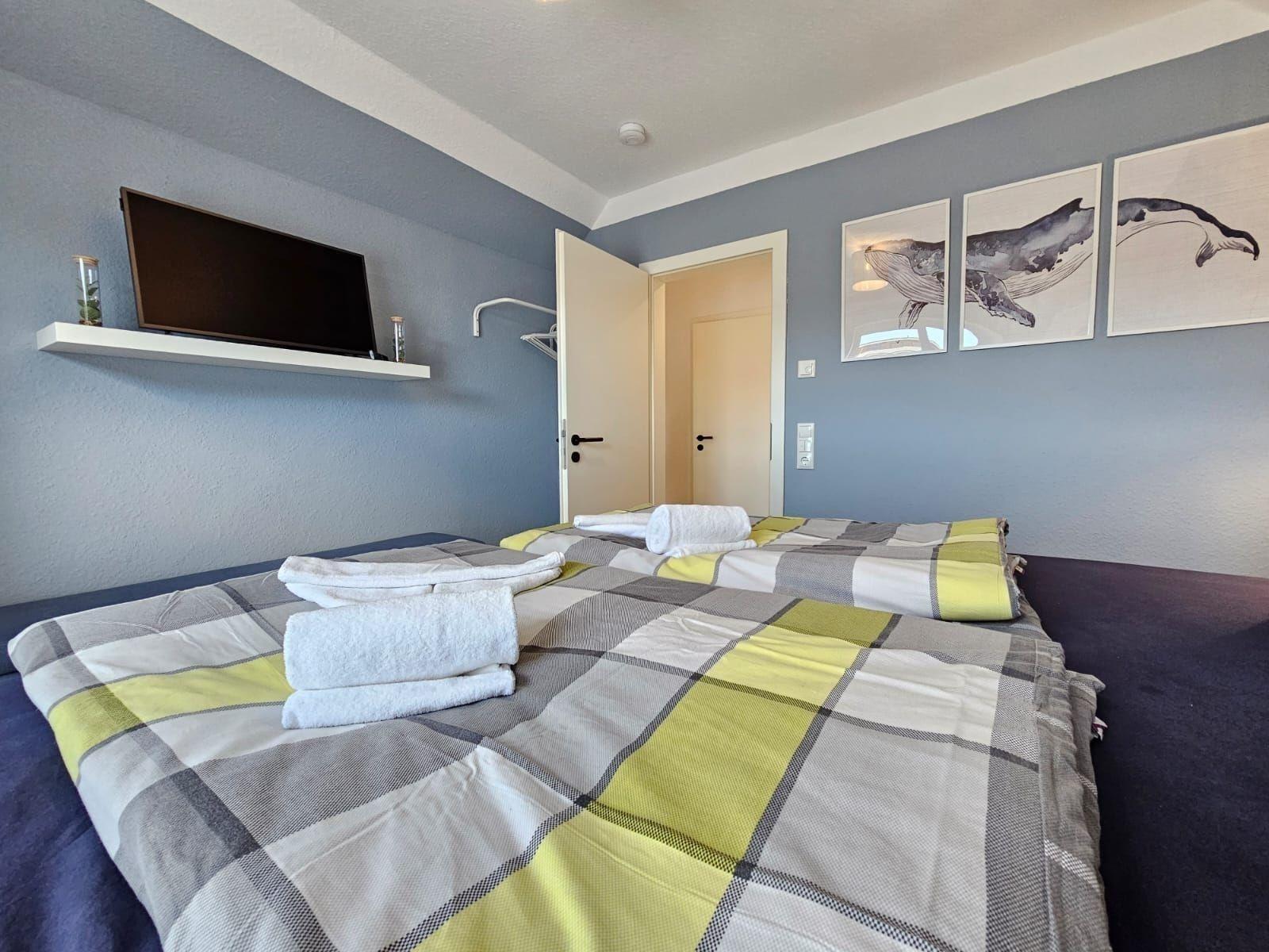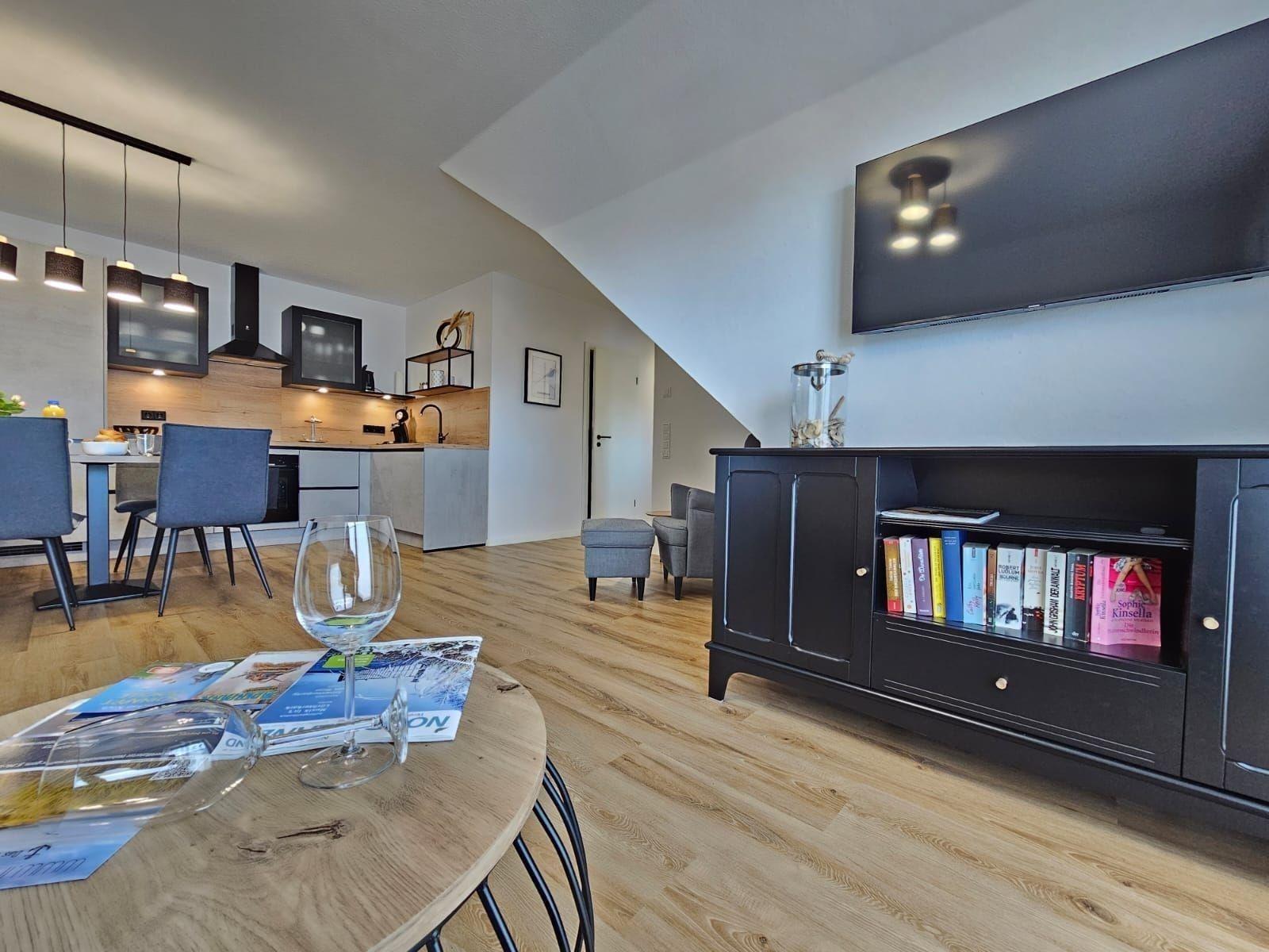 Die Ferienwohnung bietet ein modernes und komfortables Ambiente, ideal für Entspannung und Erholung. Ein Schlafzimmer mit einem Doppelbett, ein Wohnschlafzimmer mit zwei Einzelbetten sowie eine bodengleiche Dusche im Badezimmer sorgen für höchste Flexibilität. Die offene Küche ist mit einem Geschirrspüler, Elektro-/Gasherd, Backofen, Mikrowelle, Kühlschrank, Kaffeemaschine und Toaster ausgestattet, was das Kochen zum Vergnügen macht. WLAN ermöglicht zudem eine stets verfügbare Internetverbindung.
