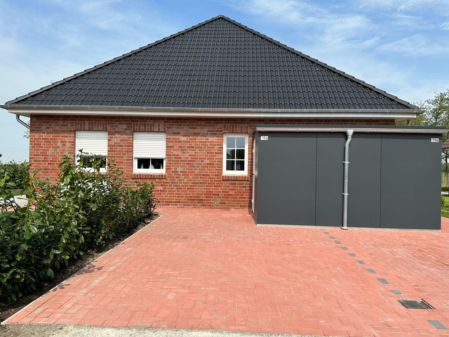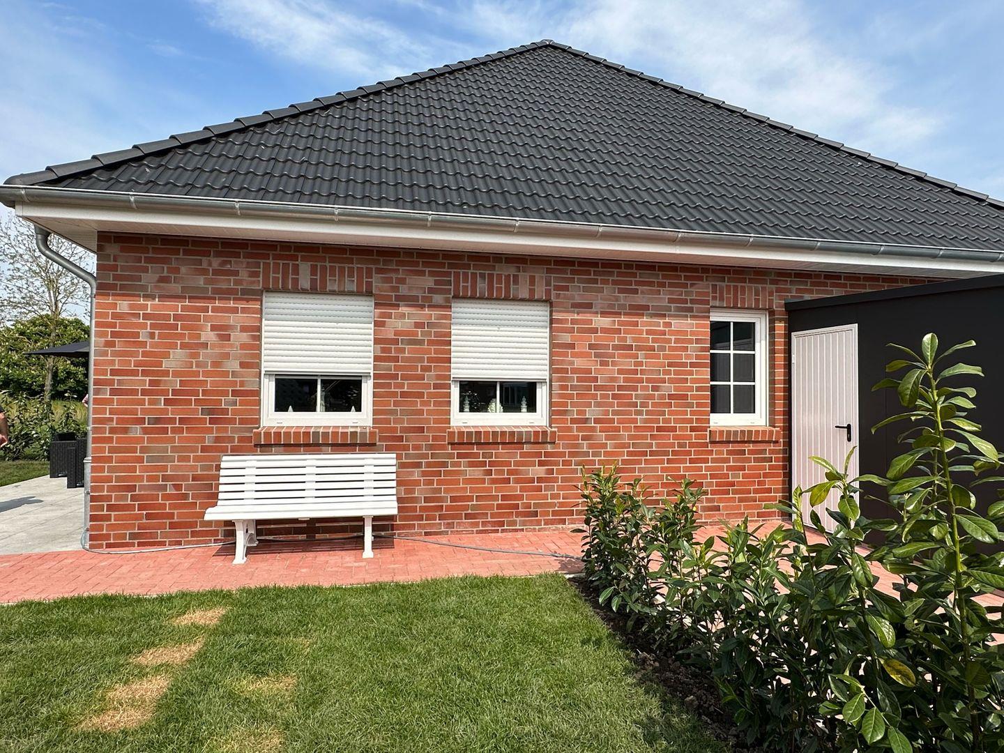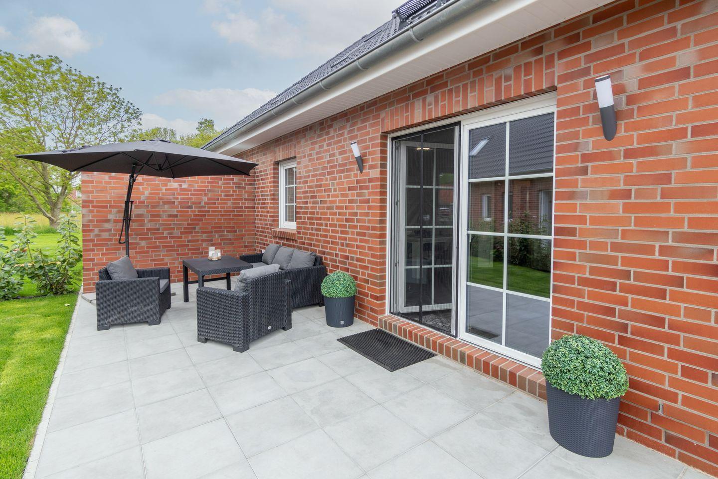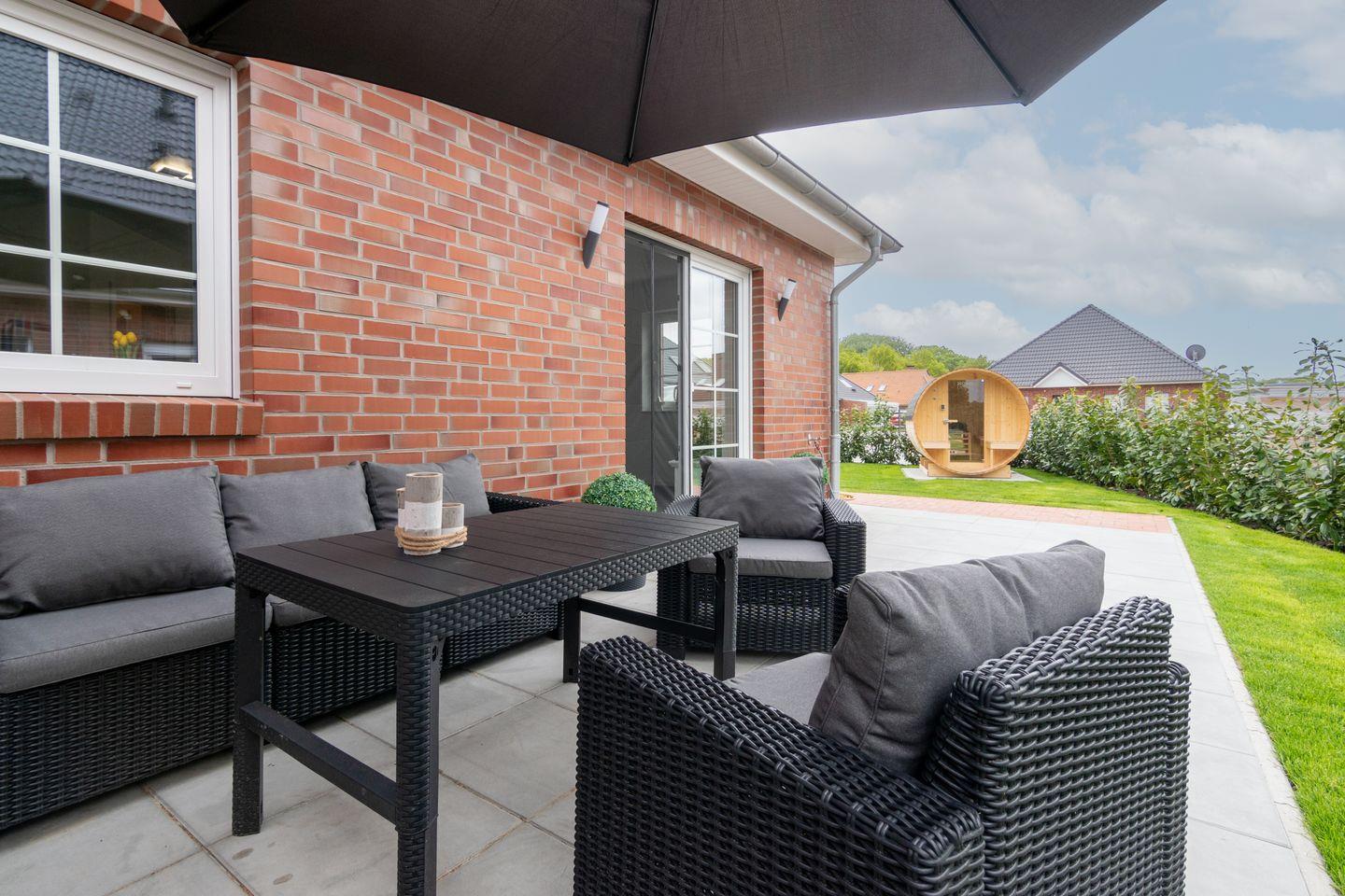 Moderne Doppelhaushälfte in Dornum mit privater Sauna und Garten, ideal für entspannte Urlaubstage an der Nordsee.