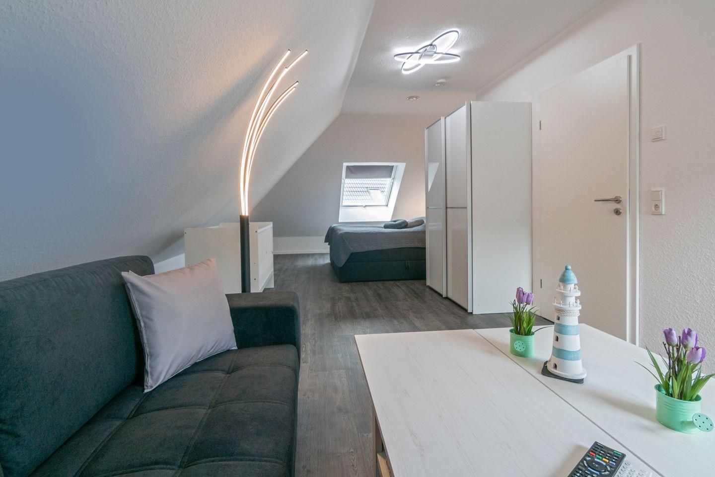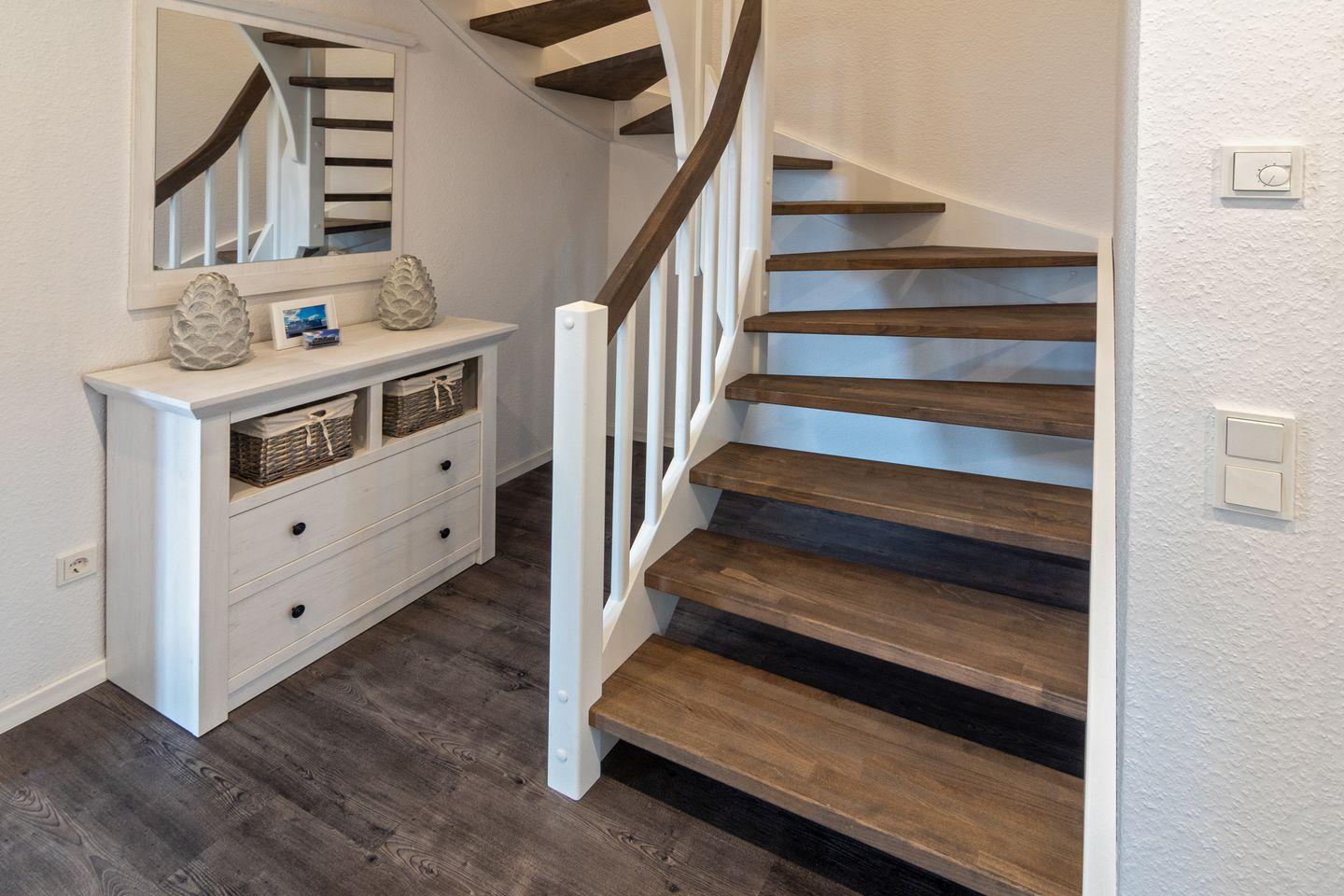 Im Erdgeschoss erwartet Sie ein heller, gemütlicher Wohnbereich, der zum Verweilen und geselligen Abenden einlädt. Die separate, voll ausgestattete Küche lässt keine Wünsche offen. Hier finden Sie außerdem ein komfortables Schlafzimmer mit hochwertigem Boxspringbett, ein modernes Duschbad mit WC sowie einen Hauswirtschaftsraum mit Waschmaschine und Trockner für mehr Komfort.