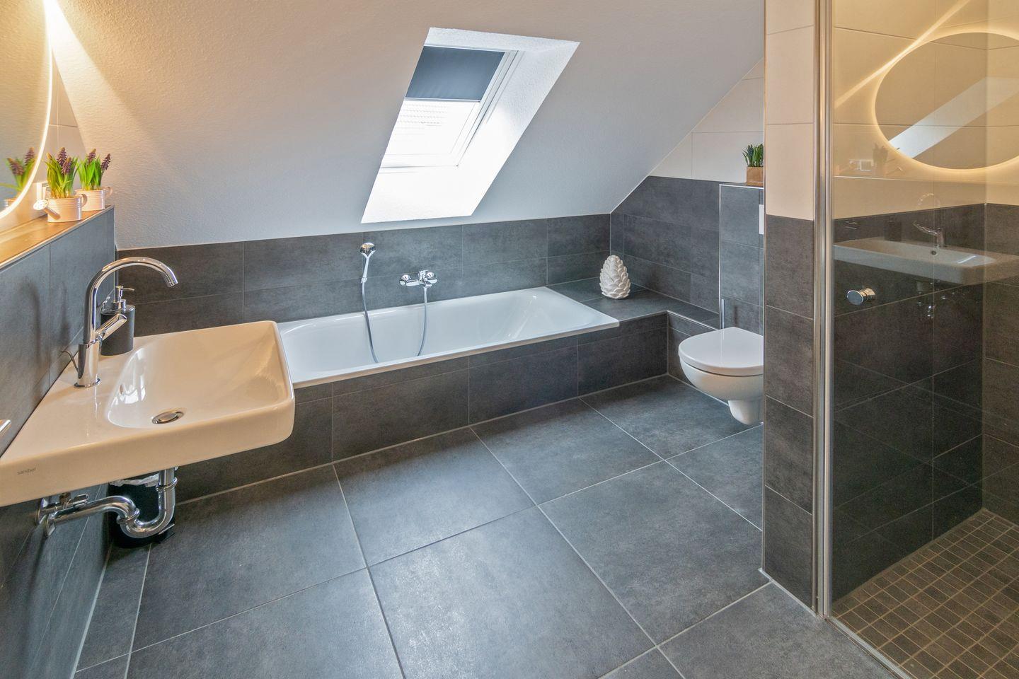 Im Obergeschoss liegt ein weiteres großzügiges Schlafzimmer mit Boxspringbett, einer gemütlichen Eck-Couch und Flachbild-TV – ideal zum Entspannen. Ein zweites Badezimmer mit Dusche, Badewanne und WC bietet ausreichend Platz für die ganze Familie.