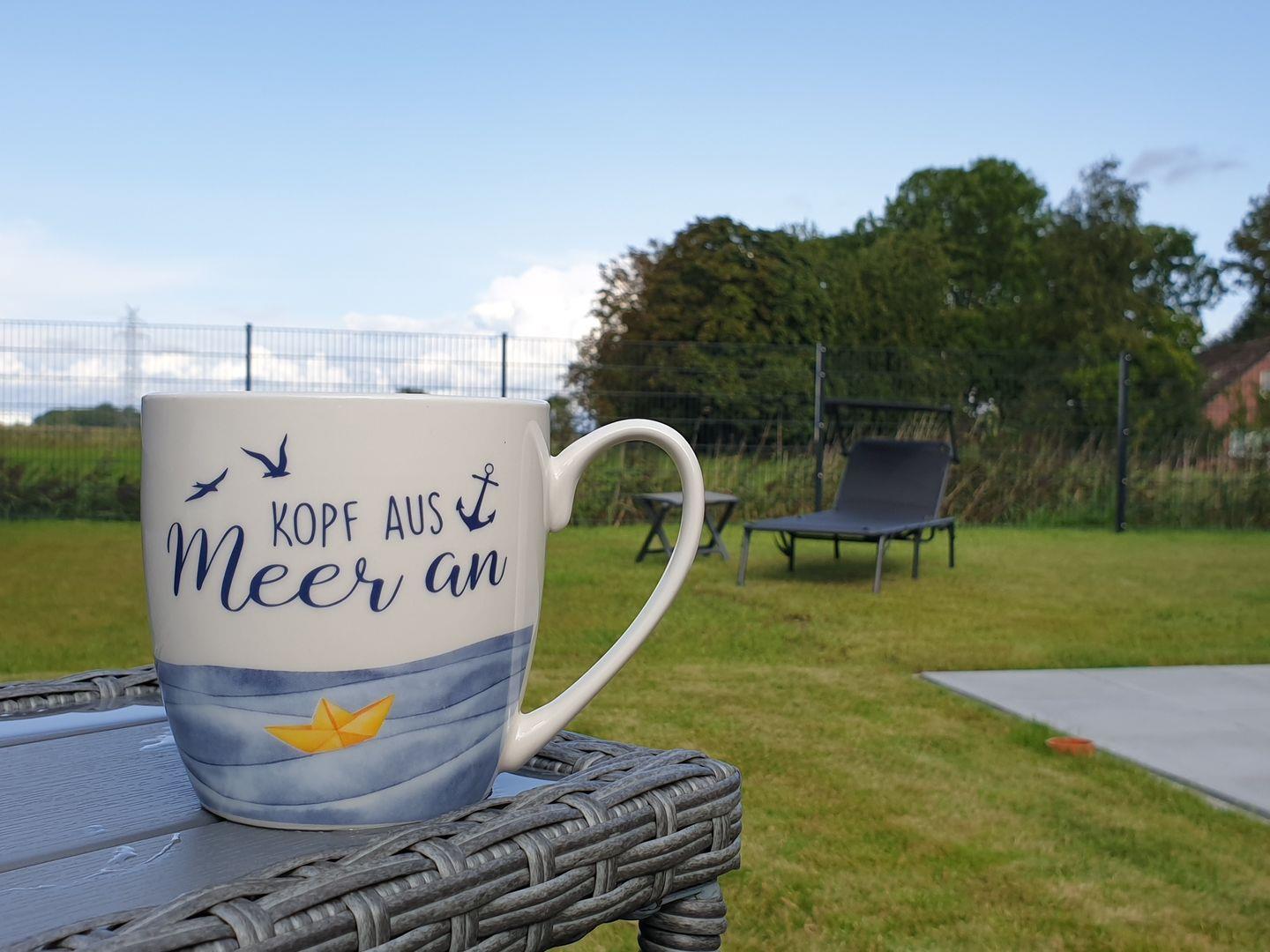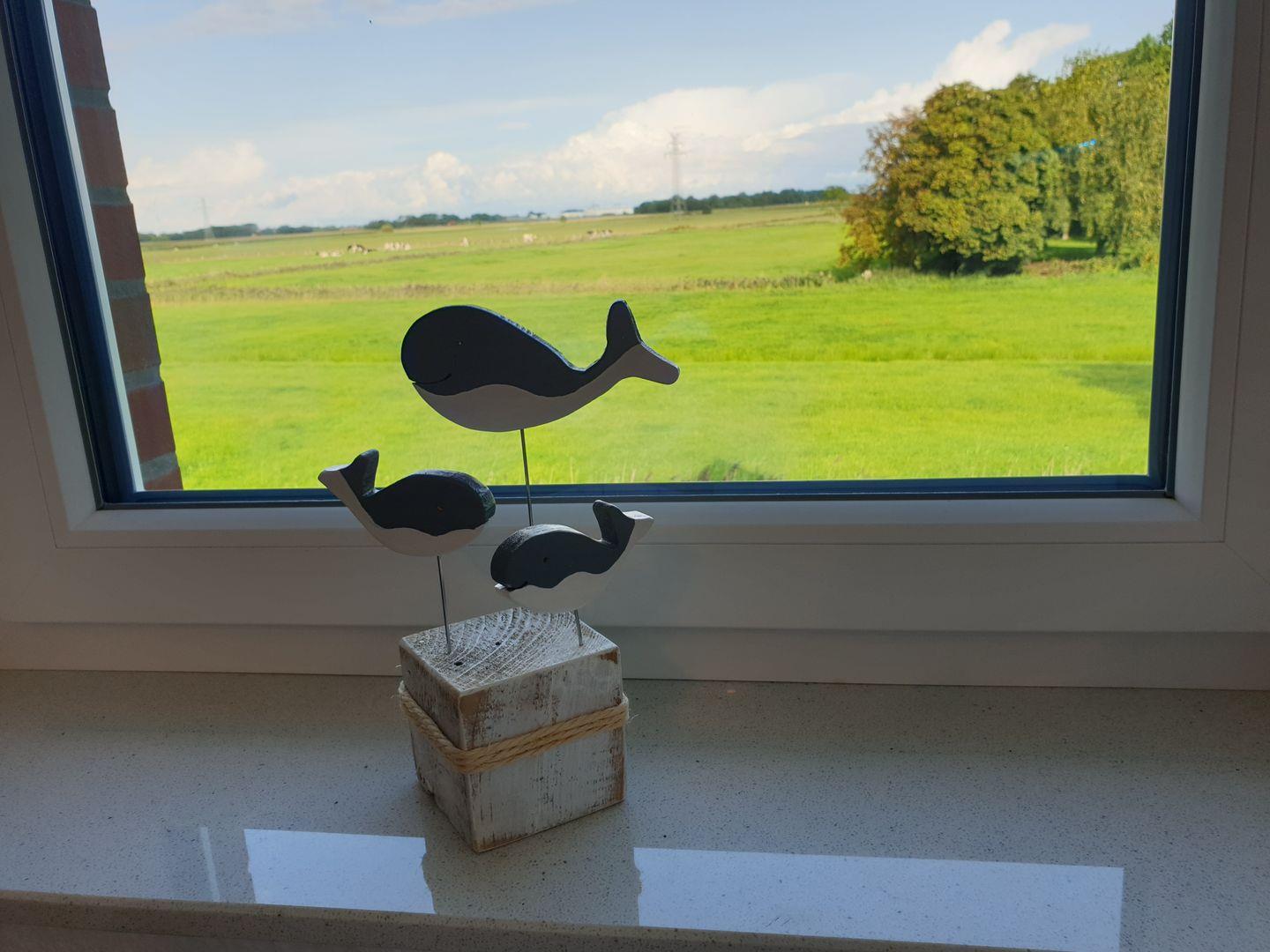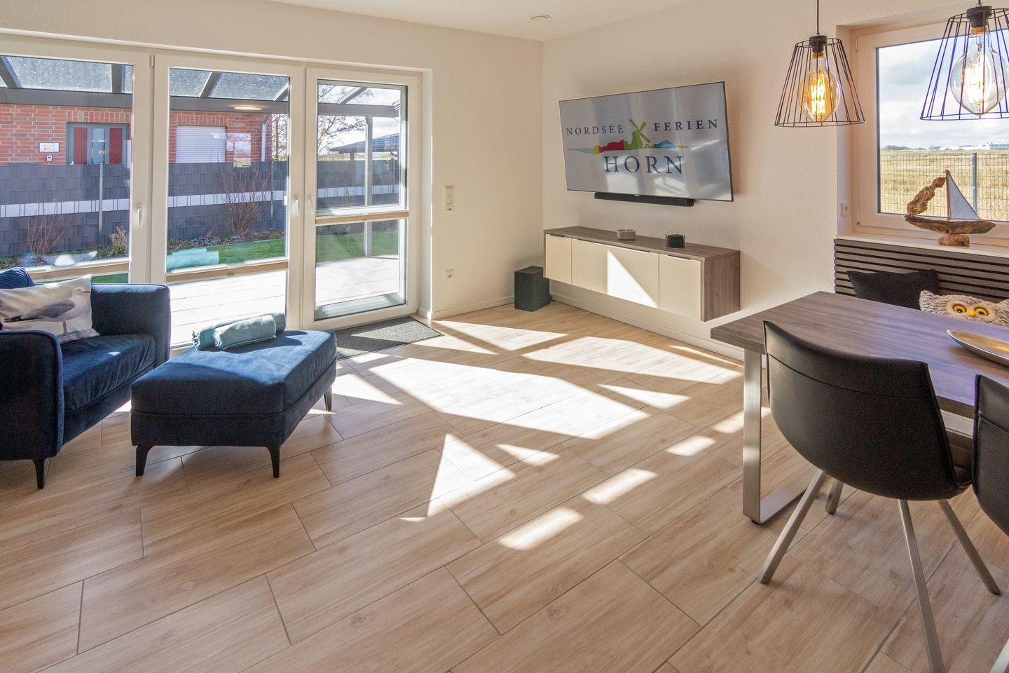 Modernes Reihenendhaus in Dornum mit großem Garten und tollem Weitblick, ideal für Familien und Hunde.
