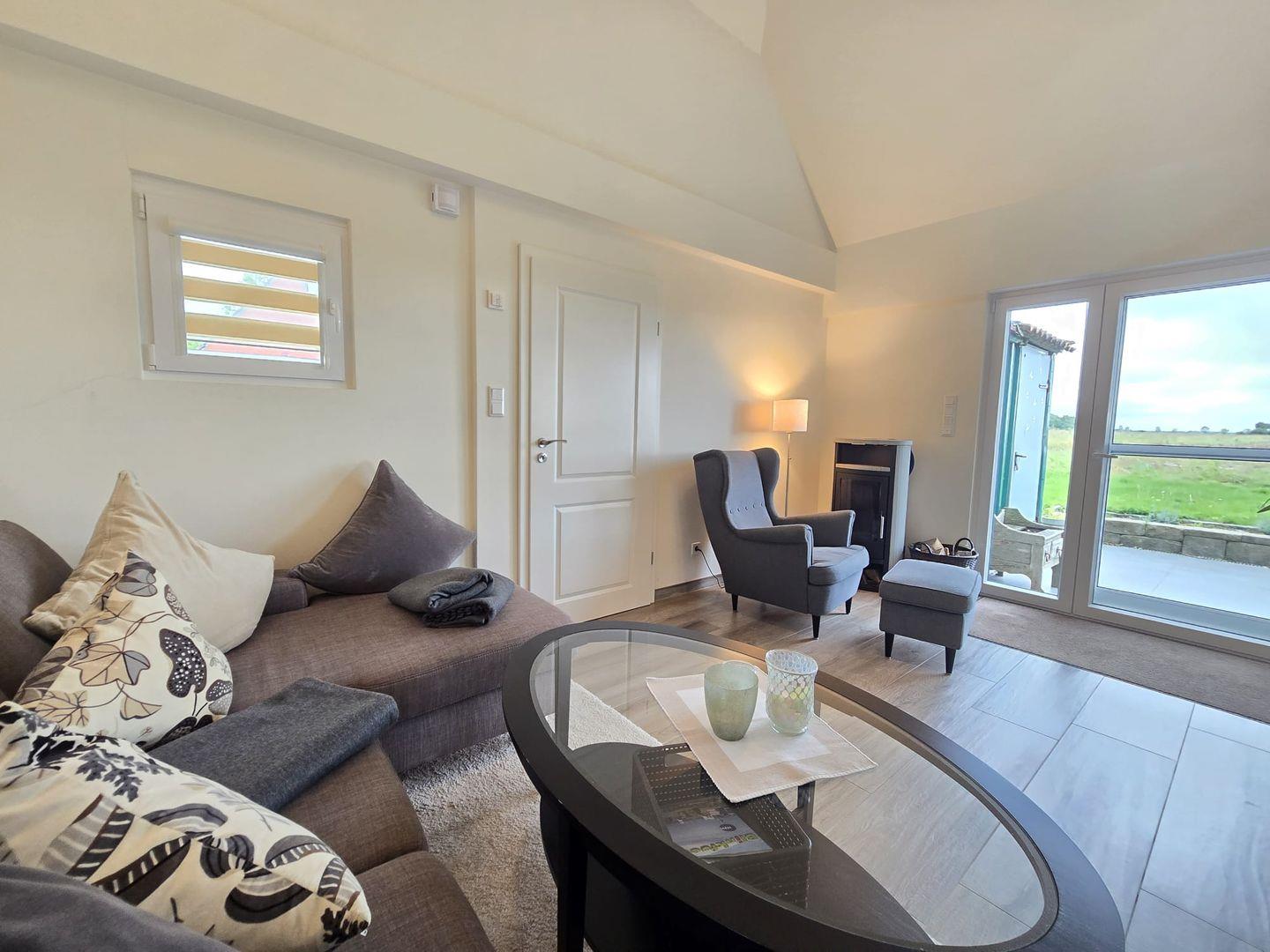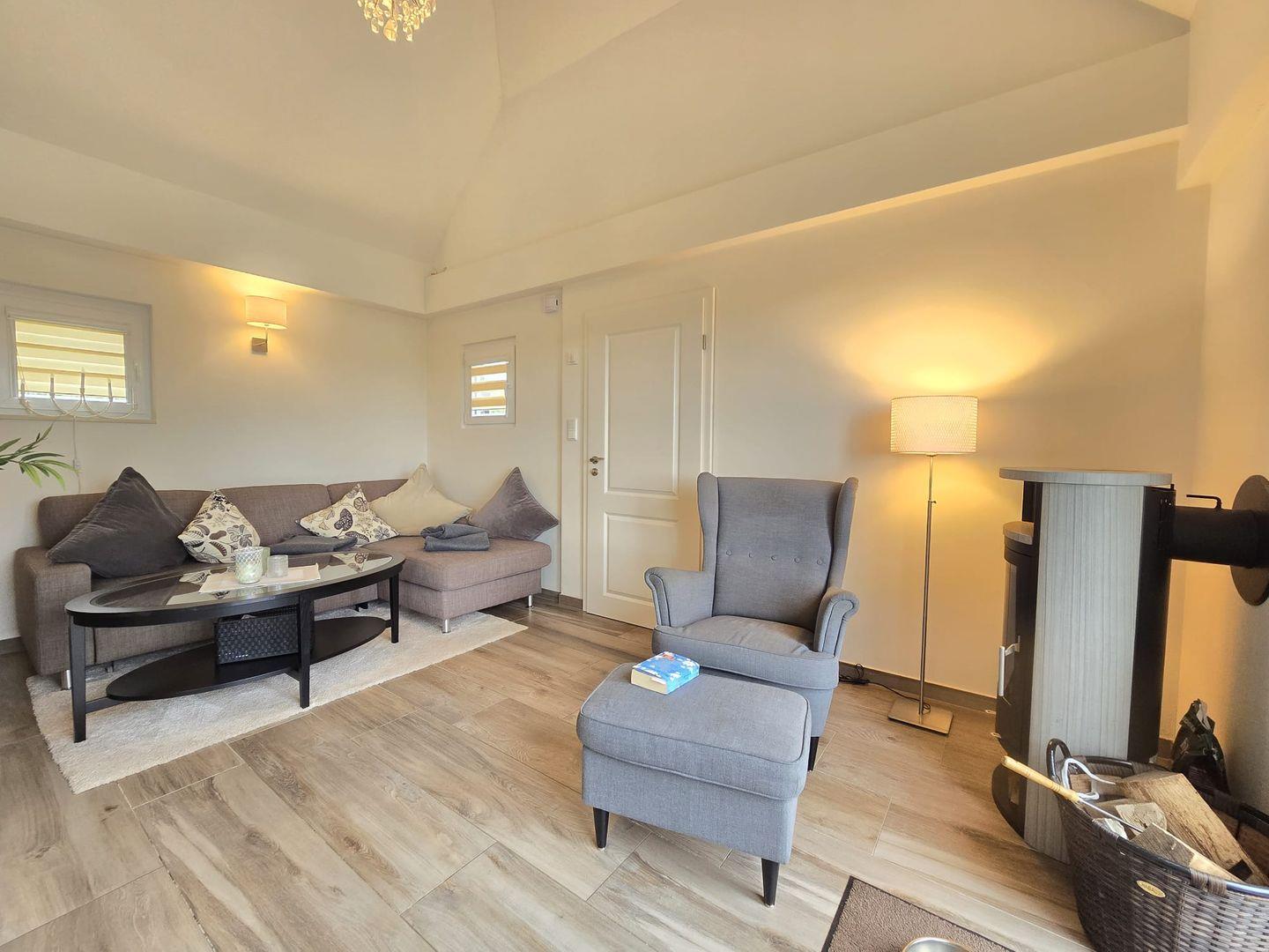 Ein gemütlicher Kamin im Wohnzimmer sorgt an kühleren Tagen für wohlige Wärme und eine angenehme Atmosphäre – perfekt für entspannte Abende mit Familie oder Freunden.