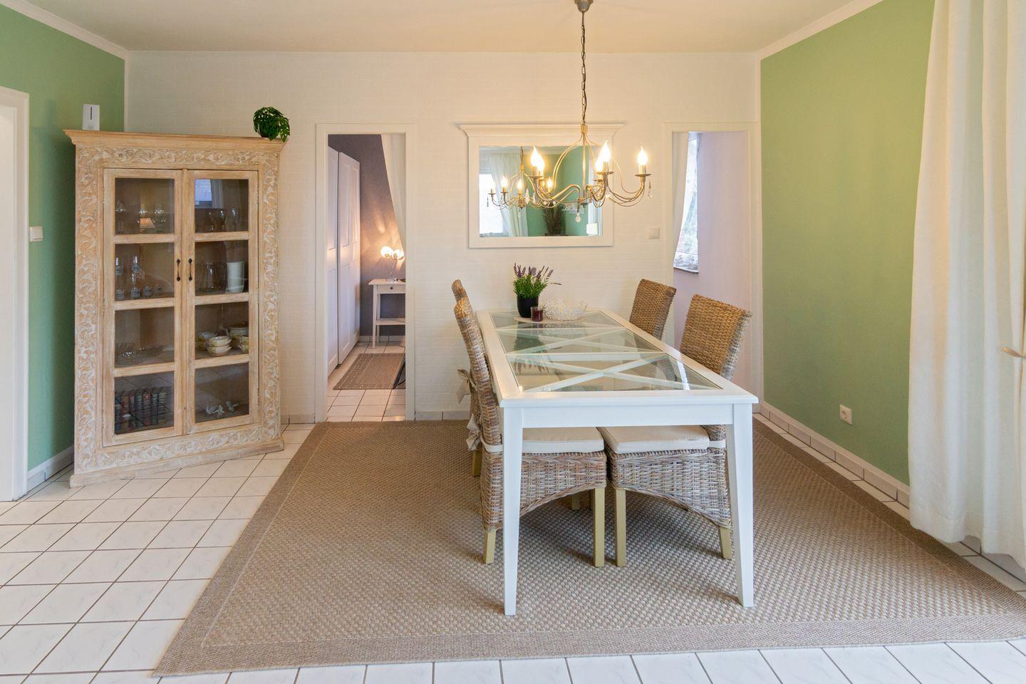 Die separate Küche ist komplett ausgestattet: Ceranherd, Backofen, Mikrowelle, Kühlschrank, Gefrierschrank, Kaffeemaschine und alle nötigen Utensilien stehen bereit. Ein Essbereich sowie ein gemütliches Wohnzimmer mit Sofa, Satelliten-TV, Büchern und kostenfreiem WLAN laden zum Verweilen ein.