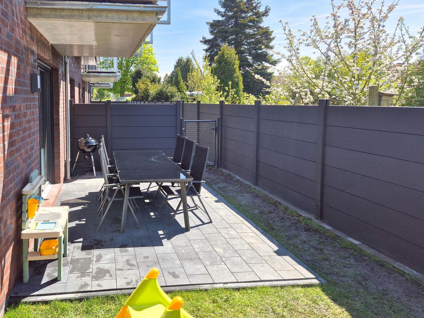 Im eigenen Garten, der komplett eingezäunt ist (Hunde können frei laufen), gibt es einladende Sitzgelegenheiten und Einrichtungen für die Kinder.