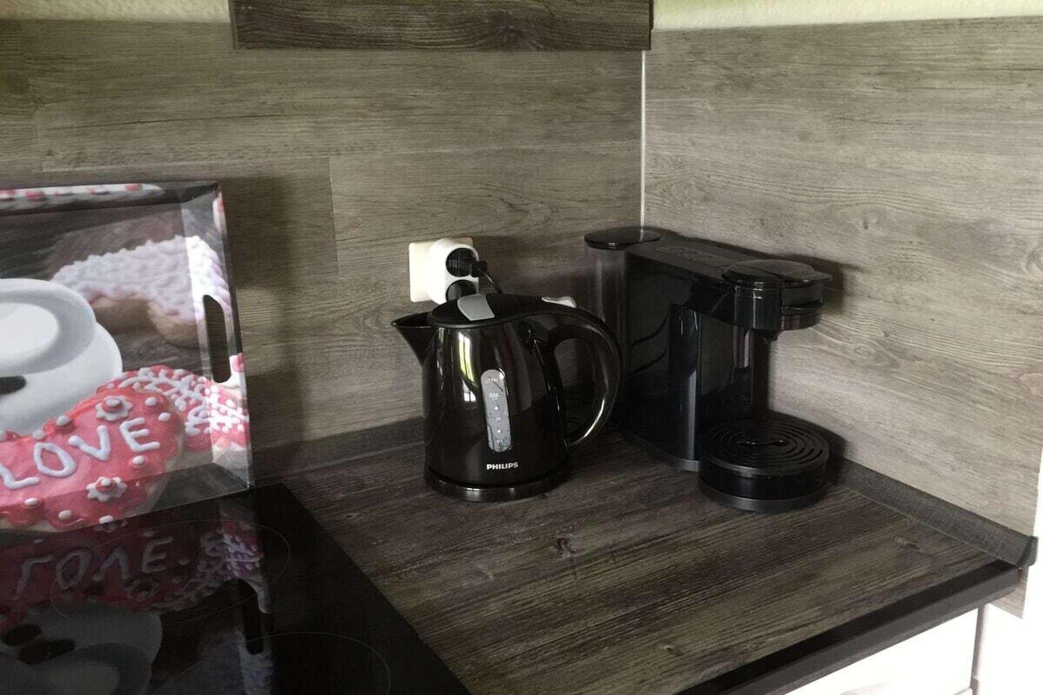 Parterre: (Wohnzimmer(TV, Blu-ray-Player, Fliegenfenster), Küche(Esstisch, Herd, Radio, Kochplatte, Wasserkocher, Toaster, Kaffeemaschine, Backofen, Mikrowelle, Spülmaschine, Kühlschrank, Tiefkühlschrank), Schlafzimmer(Doppelbett), Badezimmer(Dusche, Waschbecken, Toilette, Waschmaschine, Föhn), Abstellraum(Trockner, Bügelbrett, Bügeleisen, Trockenschrank)) In der 1. Etage: (Schlafzimmer(Einzelbett, Einzelbett)) Grill, Terrasse, Garten, Gartenmöbel, Liegen, Gartenhaus