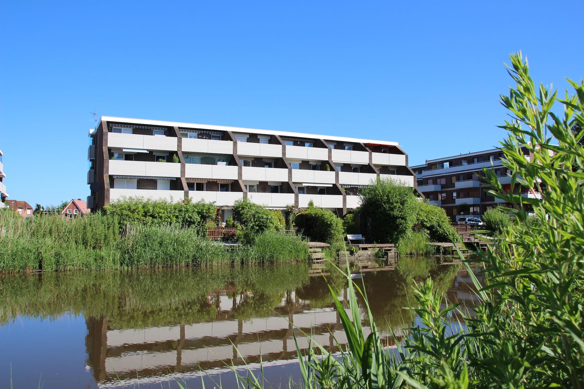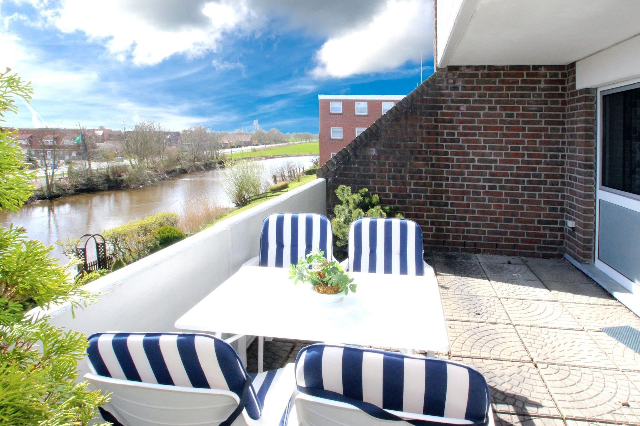 Gemütliche Ferienwohnung mit Balkon und Blick auf das Dornumersieler Tief, nahe Strand und Hafen.
