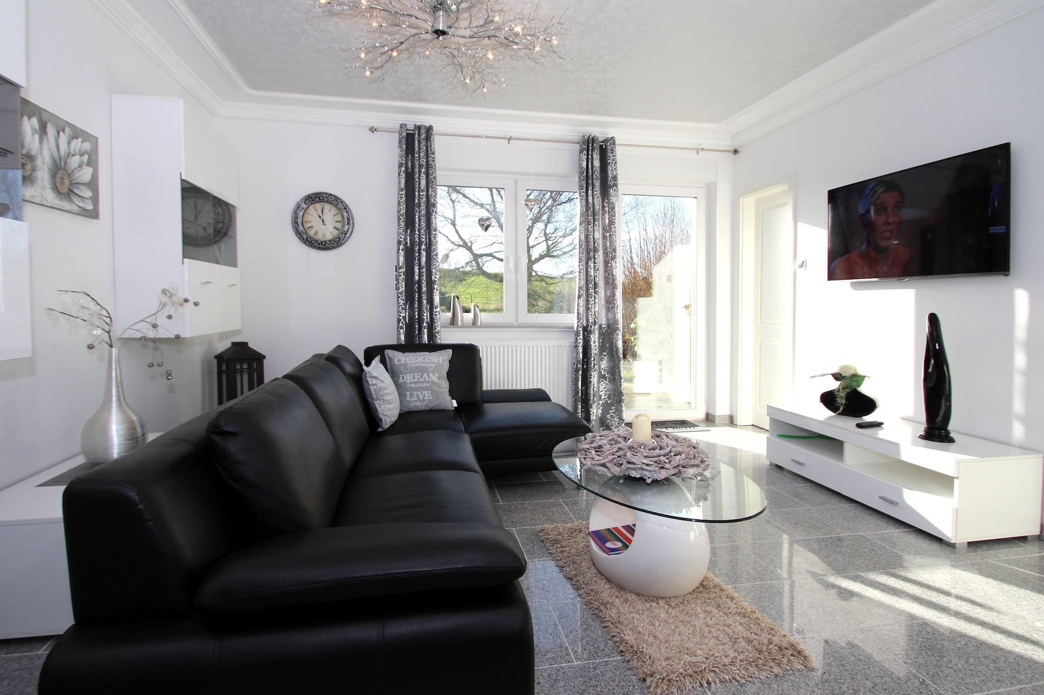Parterre: (offene Küche(Esstisch, Kochplatte(4 Kochplatten, Ceranfeld), Wasserkocher, Toaster, Kaffeemaschine, Backofen, Mikrowelle, Spülmaschine, Kühlschrank, Tiefkühlschrank), Wohn/Esszimmer(TV(Satellit), Radio), Schlafzimmer(Doppelbett, TV(Satellit)), Schlafzimmer(2x Einzelbett, TV(Satellit)), Badezimmer(Dusche, Waschbecken, Toilette), Badezimmer(Badewanne, Waschbecken, Toilette), Waschmaschine) Sauna(gegen Gebühr), Grill, Heizung(Gas), Terrasse, Garten, Gartenmöbel, Liegen, Grill, Parkplatz