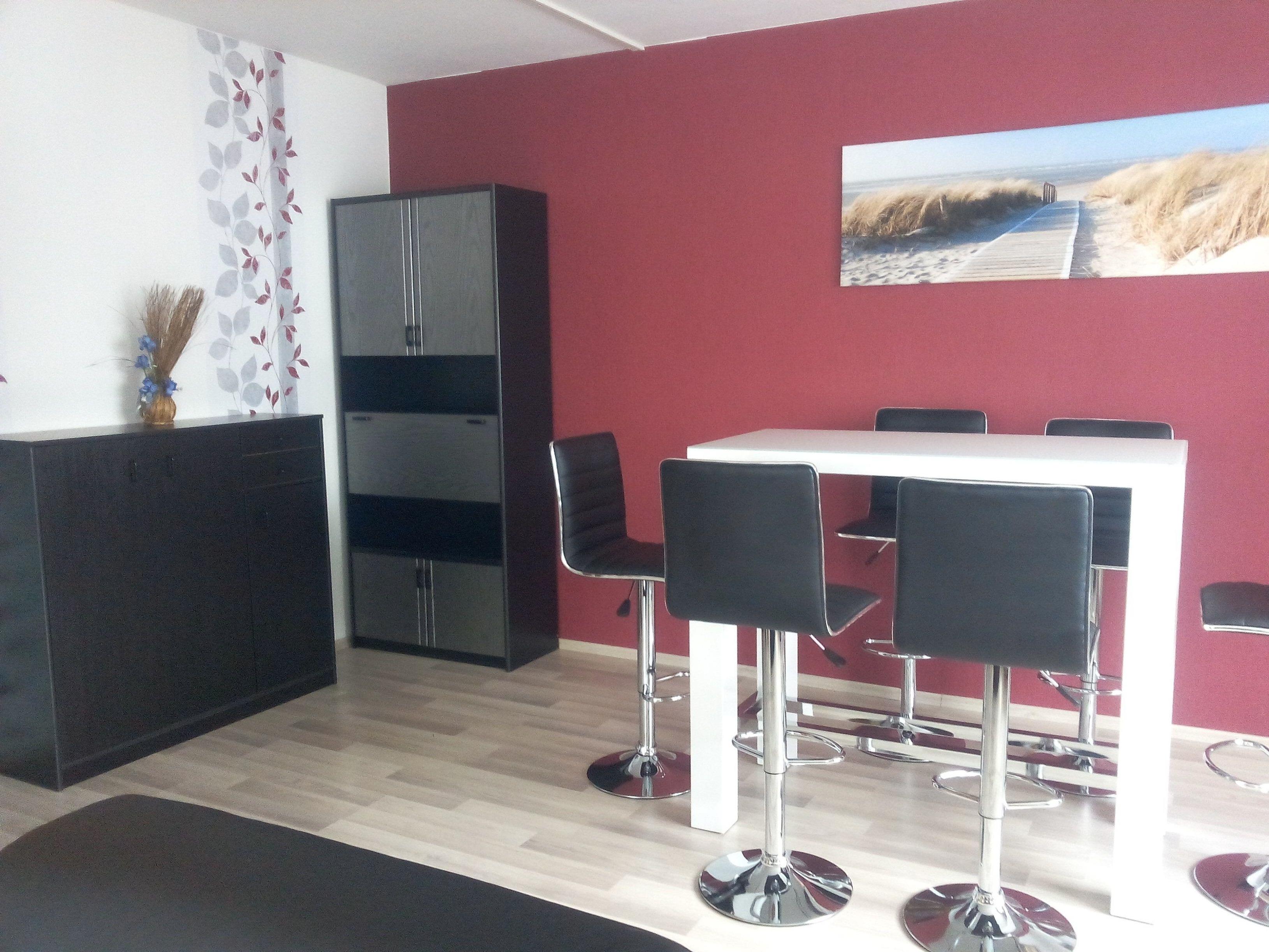 Unsere Wohnung "Helgoland" ist komplett für 8 Personen eingerichtet (zusätzlich steht ein Babybett und ein Hochstuhl zur Verfügung). Es ist eine komplette Wohnküche mit Kühlschrank, Backofen, Mikrowelle, Kaffeemaschine, Toaster, Eierkocher und weiterem Inventar vorhanden. Auch ein geräumiges Wohnzimmer mit Fernseher sowie Radio/CD vorhanden.