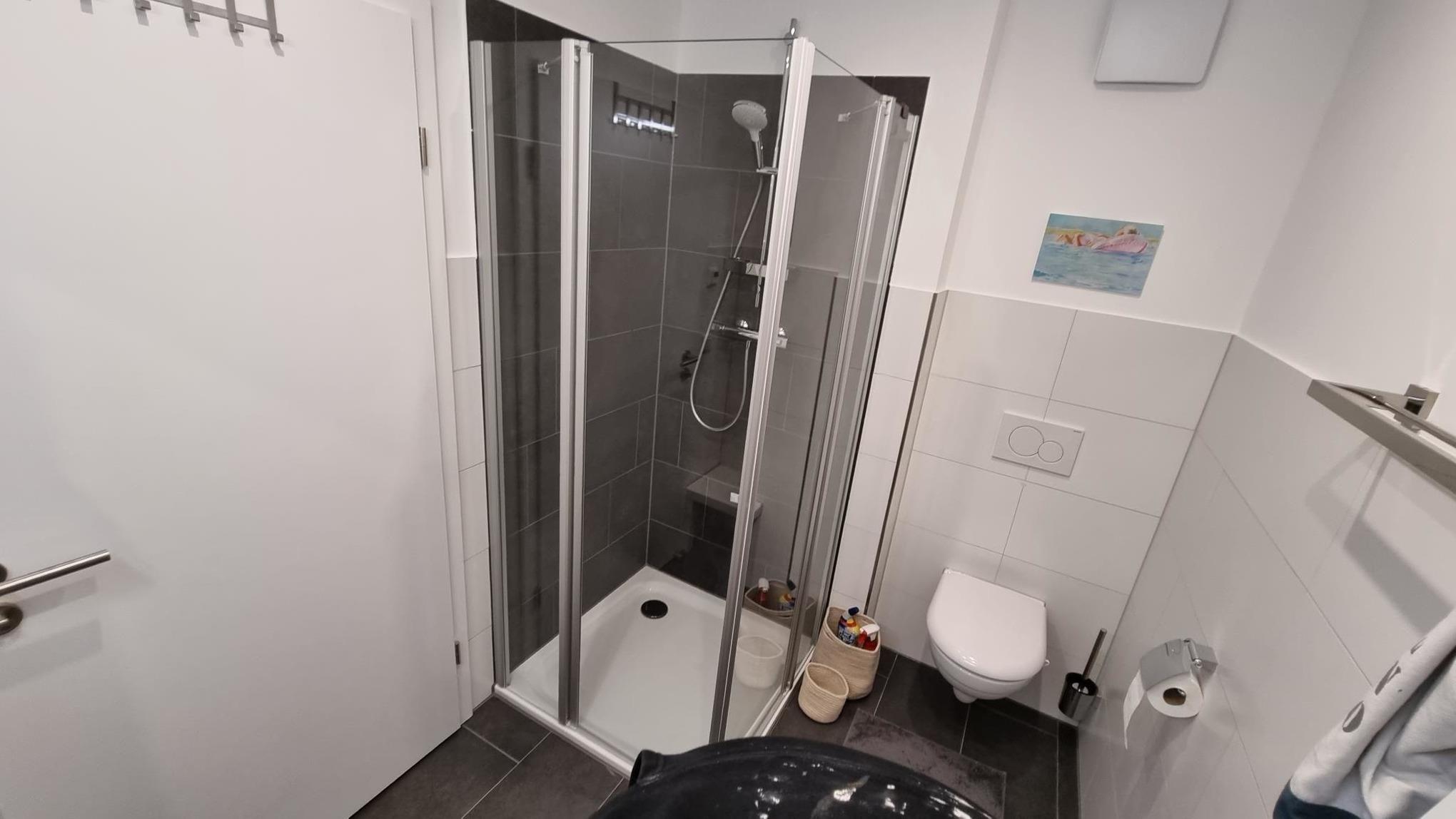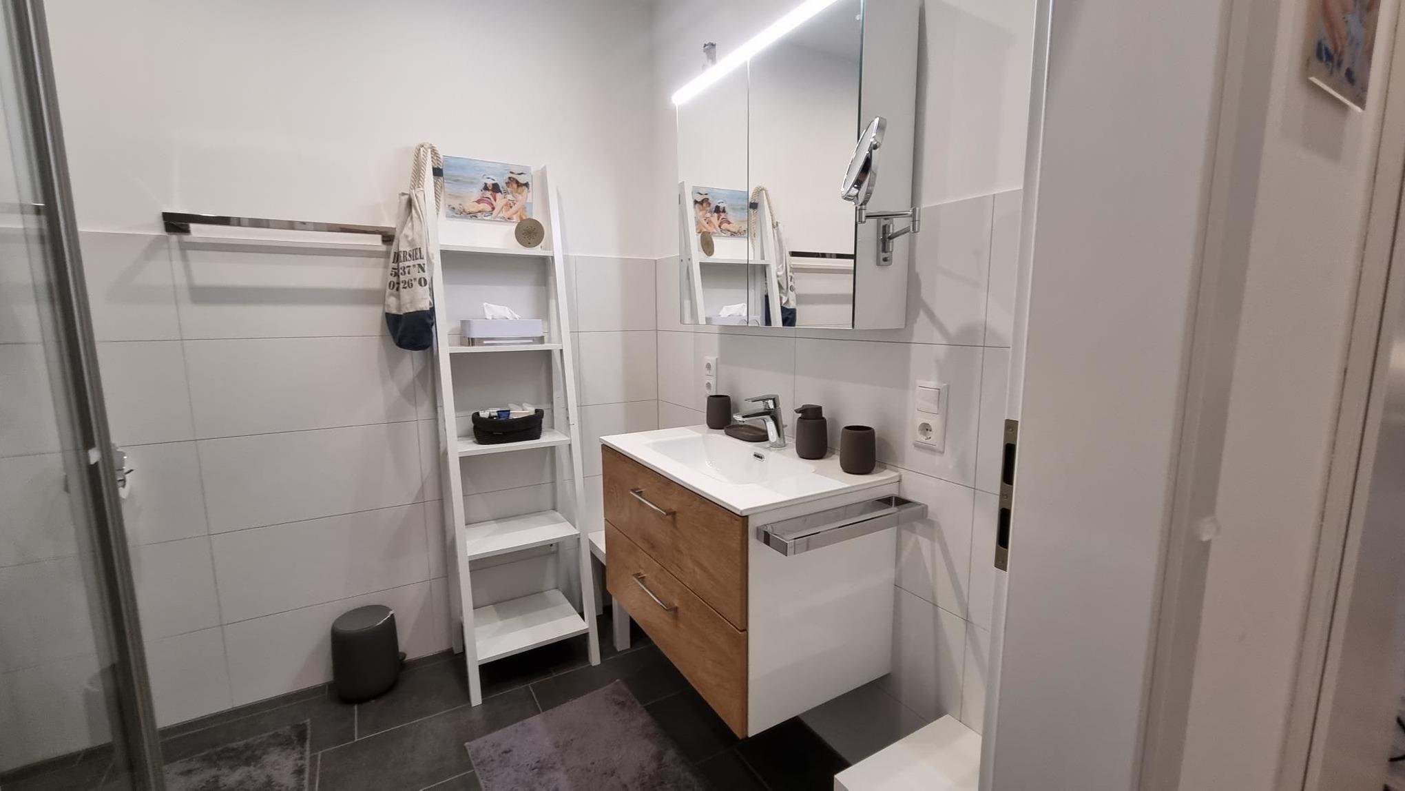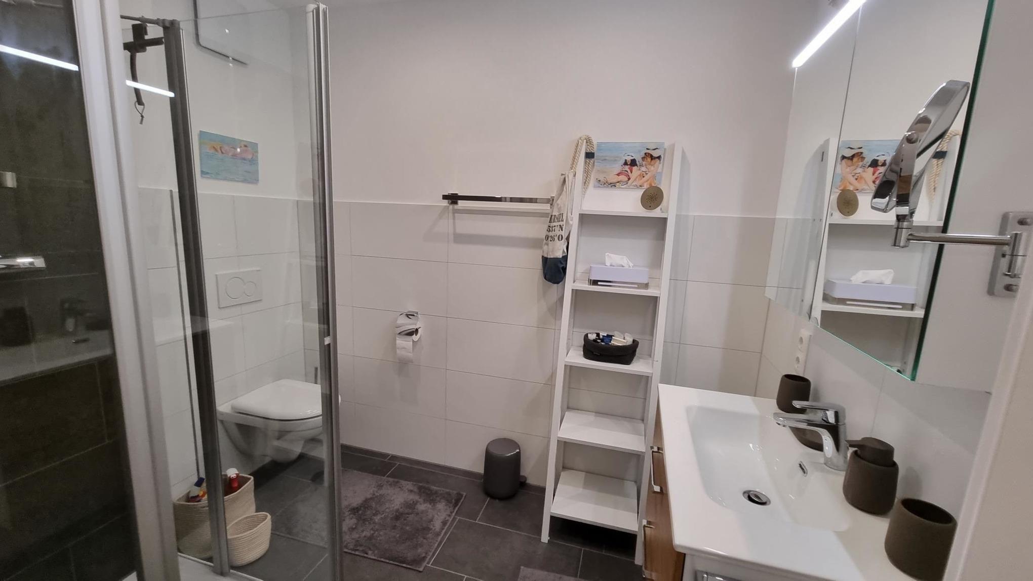 Das exklusive Bad überzeugt durch eine bodentiefe Dusche, hochwertige Armaturen, Fön, Schminkspielgel uvw.