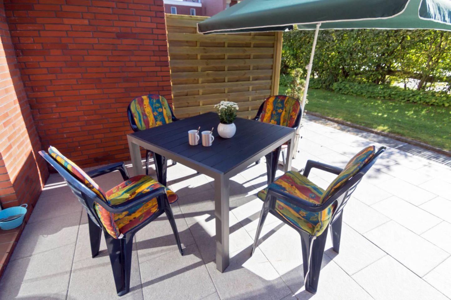 Die moderne Erdgeschosswohnung befindet sich in zentraler Lage, nur ca. 5 Fußminuten vom Ortskern und ca. 15 Minuten vom Strand entfernt. Sie bietet auf ca. 76 m² Platz für 4 Personen und verfügt über einen Wohnbereich mit integriertem Essplatz, eine voll ausgestattete Küche, zwei Schlafzimmer (eins mit Doppelbett, das andere mit zwei Einzelbetten) und ein Duschbad mit WC. Zur Wohnung gehört eine Terrasse und ein PKW-Stellplatz. Aus Rücksicht auf Allergiker sind Haustiere nicht erlaubt.